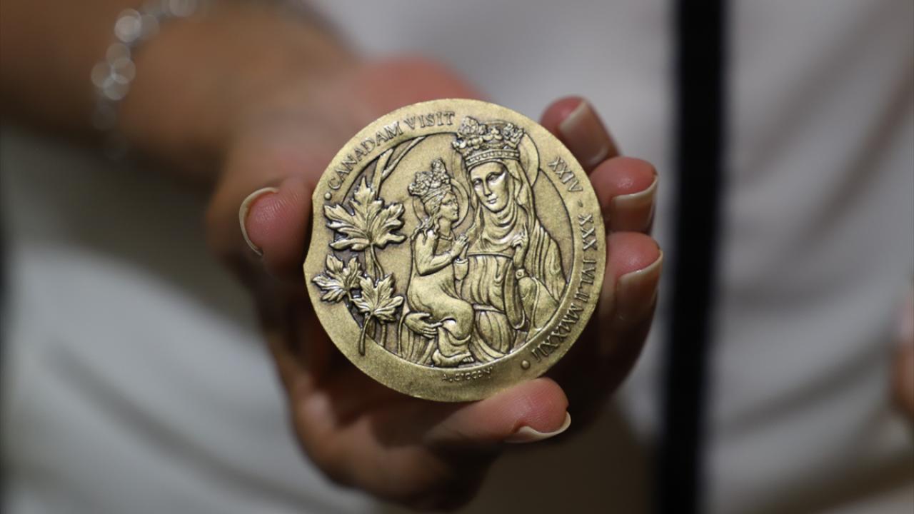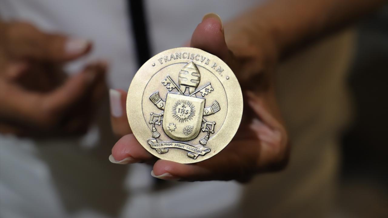 Korkmaz, Papa’nın kendisine hediye ettiği ve Kanada ziyareti için Vatikan tarafından sınırlı sayıda üretilen hatıra parayı da gösterdi.