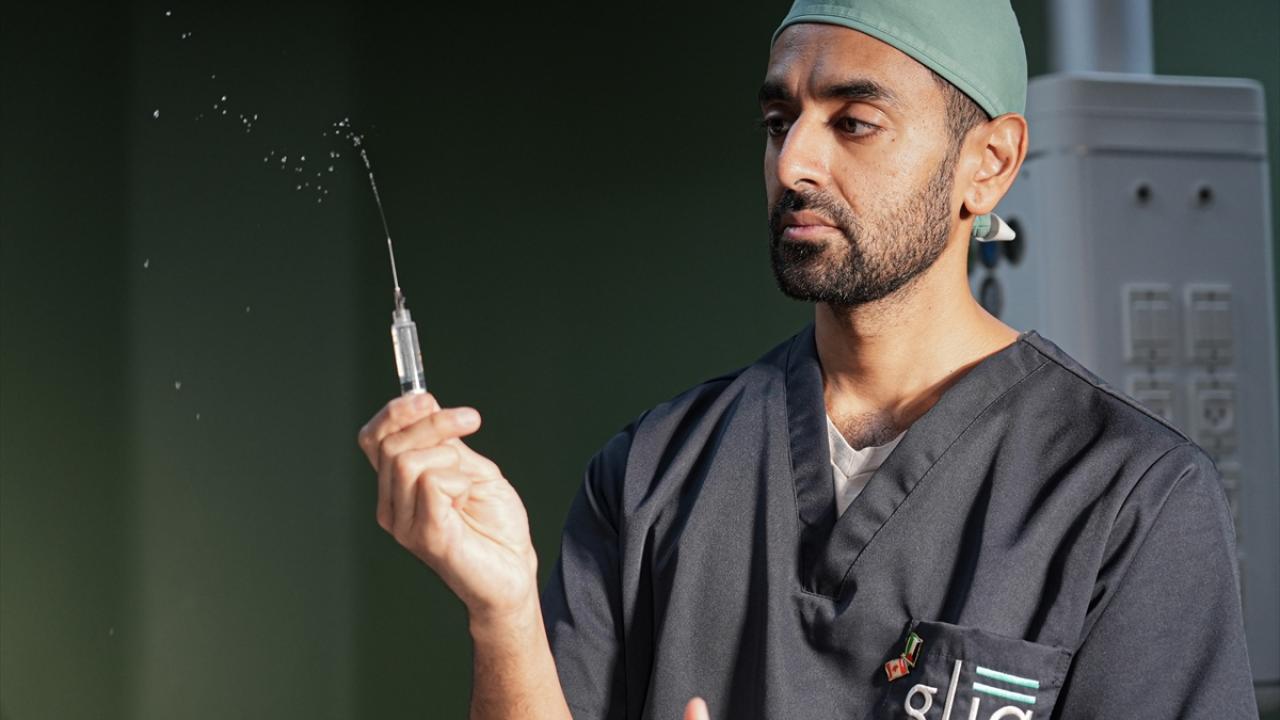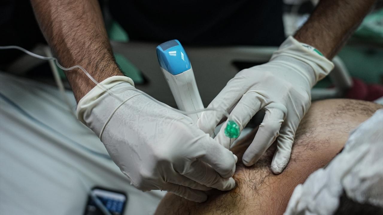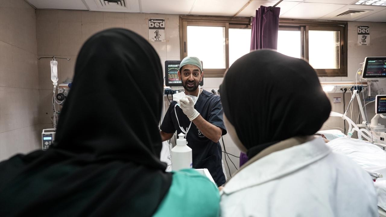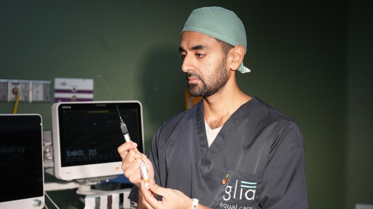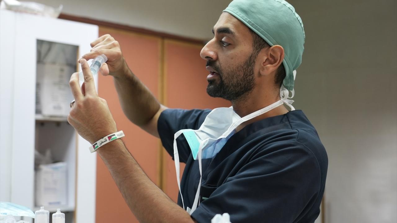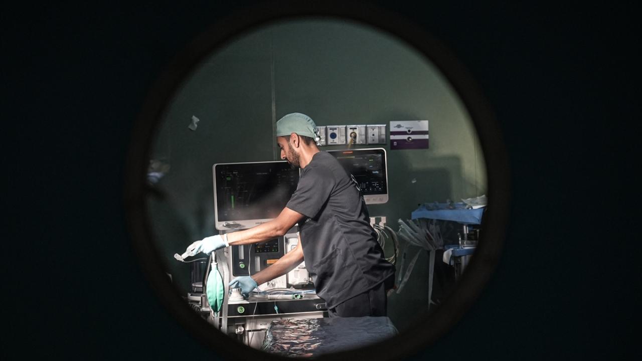Gazze Şeridi’nin güneyindeki Han Yunus kentinde bulunan Nasır Hastanesi’nde, Kanadalı anestezi uzmanı ve Uluslararası Glia Örgütü üyesi Dr. Zishan Siddiqui, temel ilaç ve tıbbi malzeme eksikliği altında hastalara bölgesel anestezi uygulayarak müdahale ediyor.