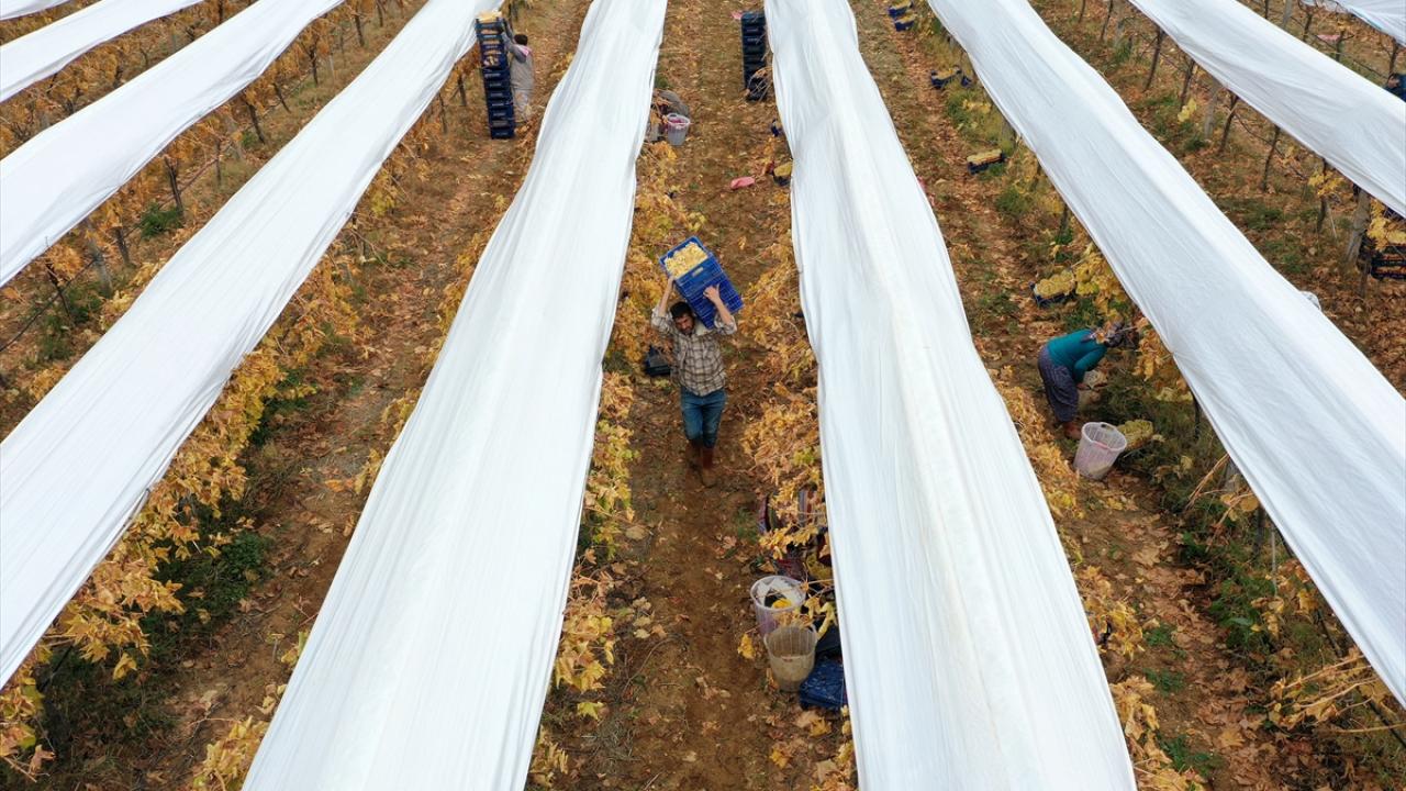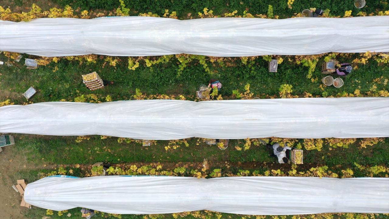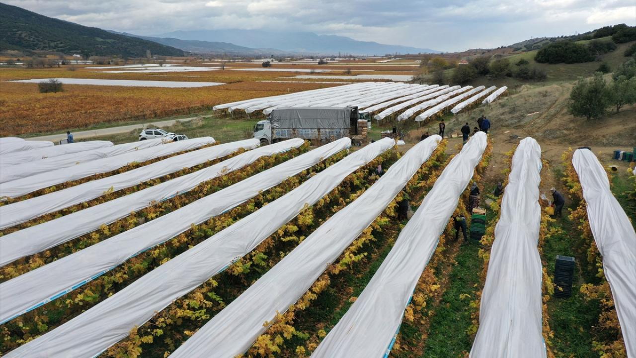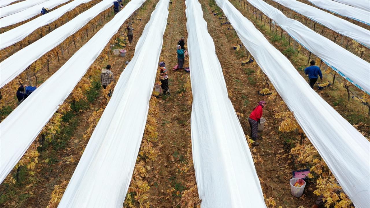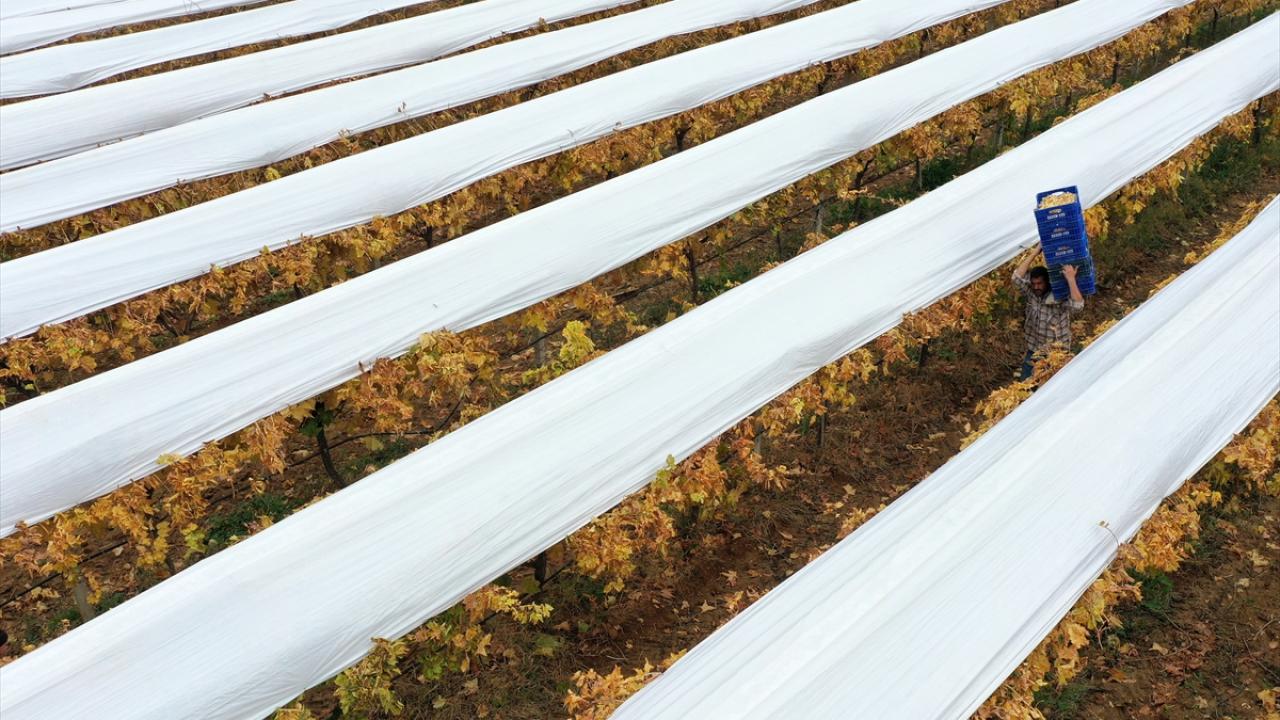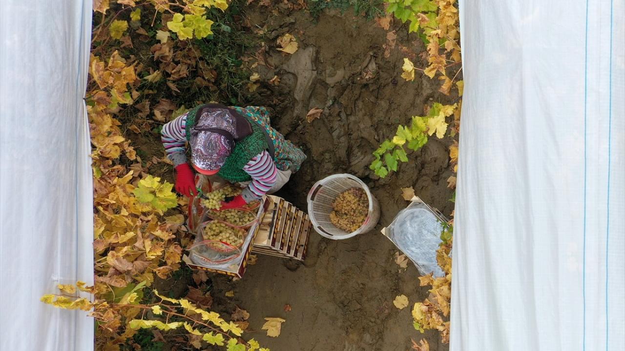 Kış mevsimiyle beraber erken saatlerde bağlara giren işçiler, asmaların üzerine örtülen kanaviçelerin altındaki son üzümleri topluyor.