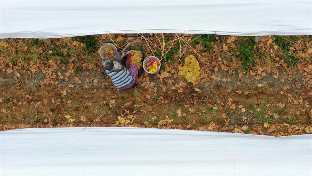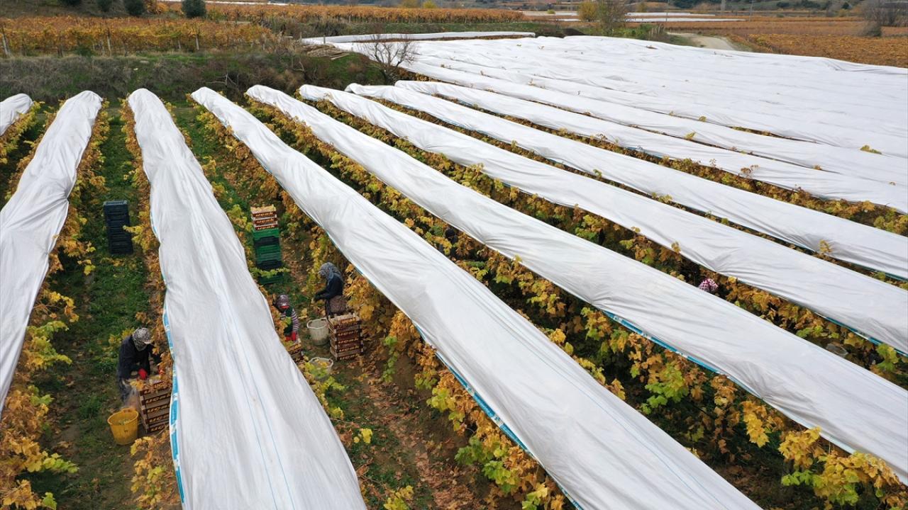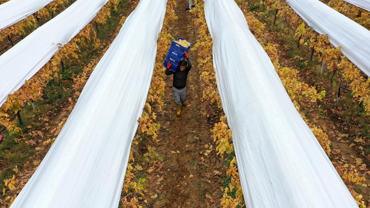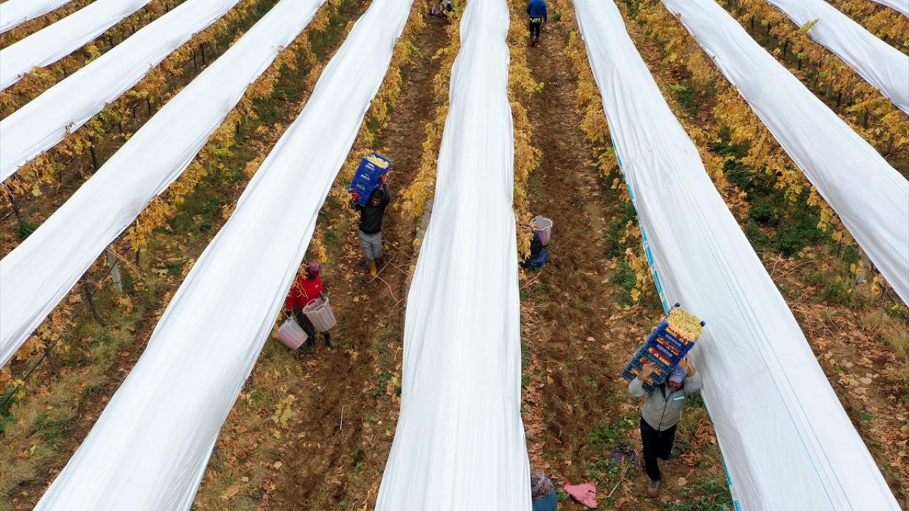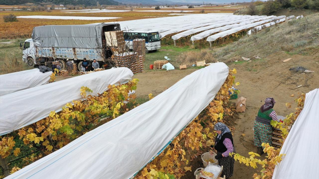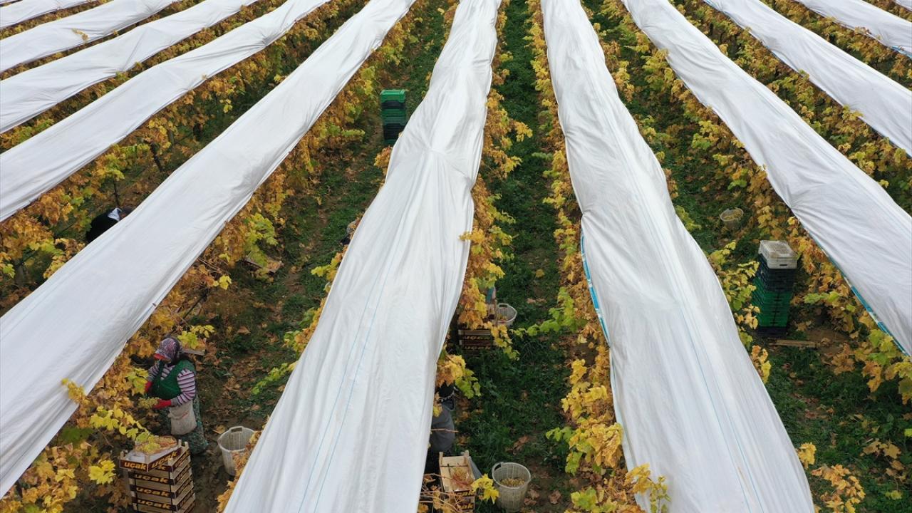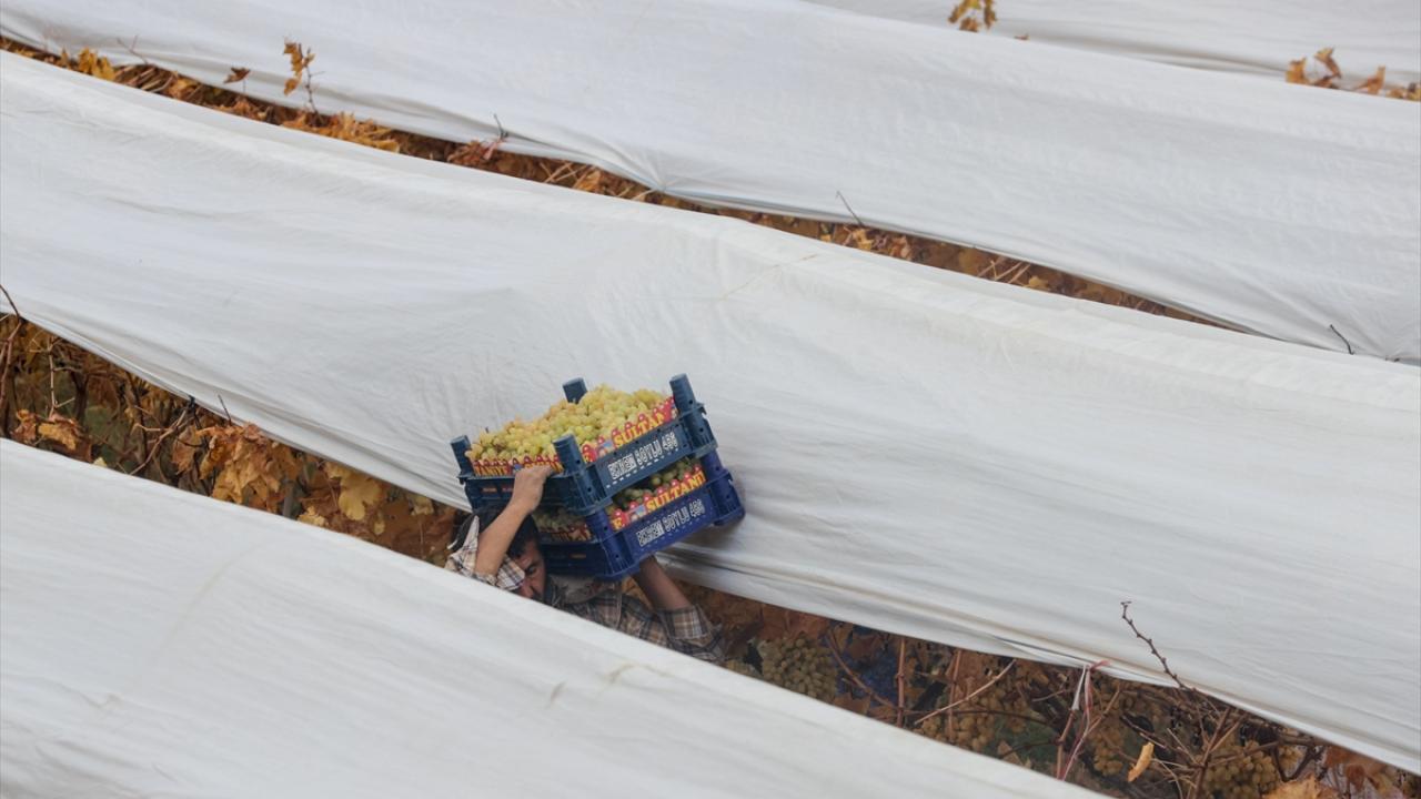 Kış mevsimiyle beraber erken saatlerde bağlara giren işçiler, asmaların üzerine örtülen kanaviçelerin altındaki son üzümleri topluyor.