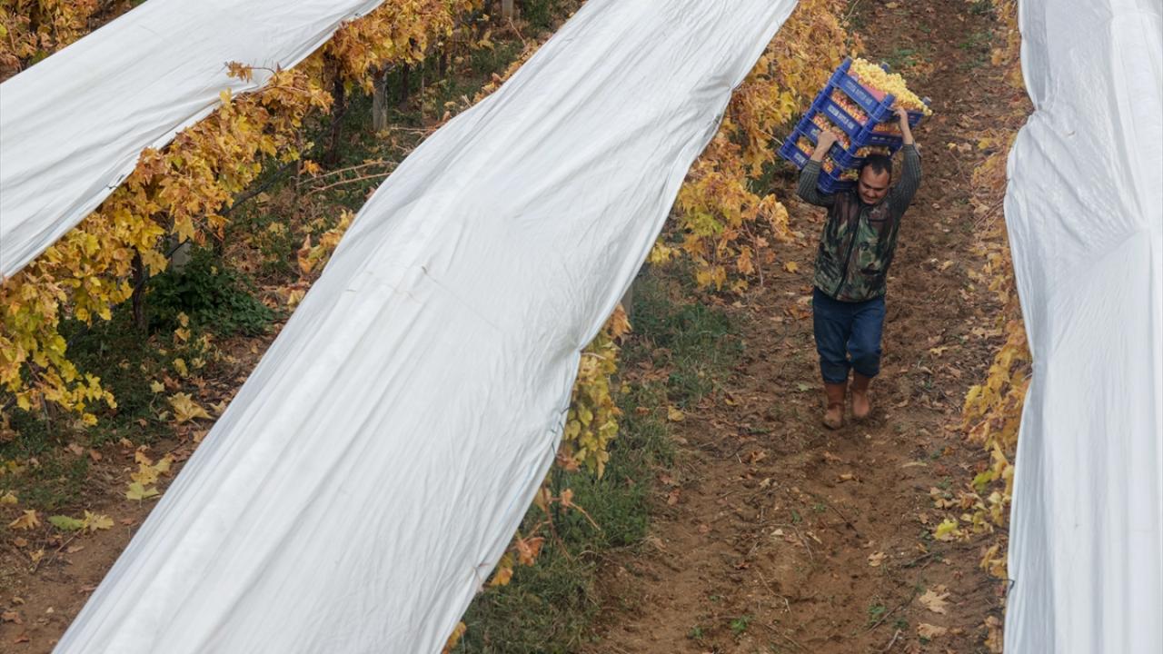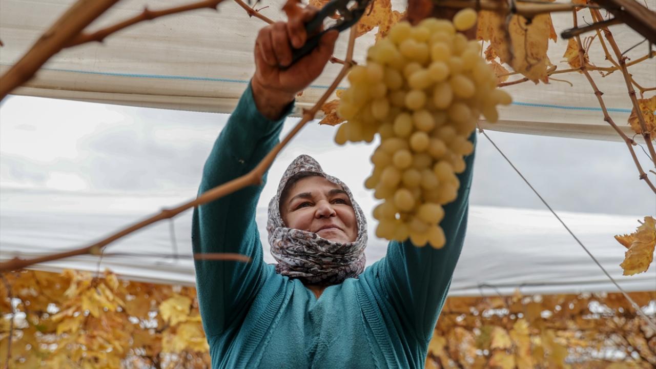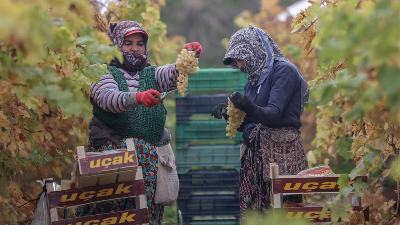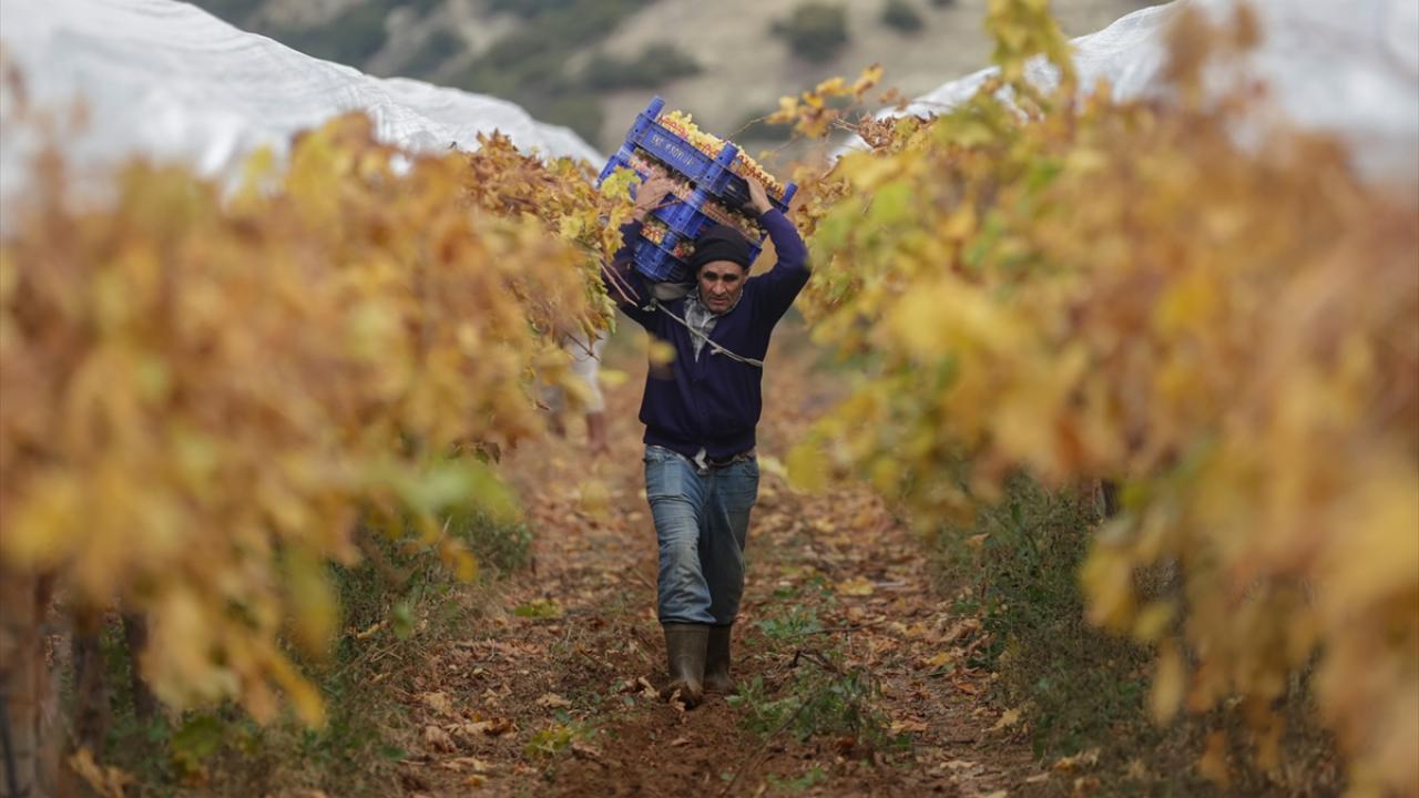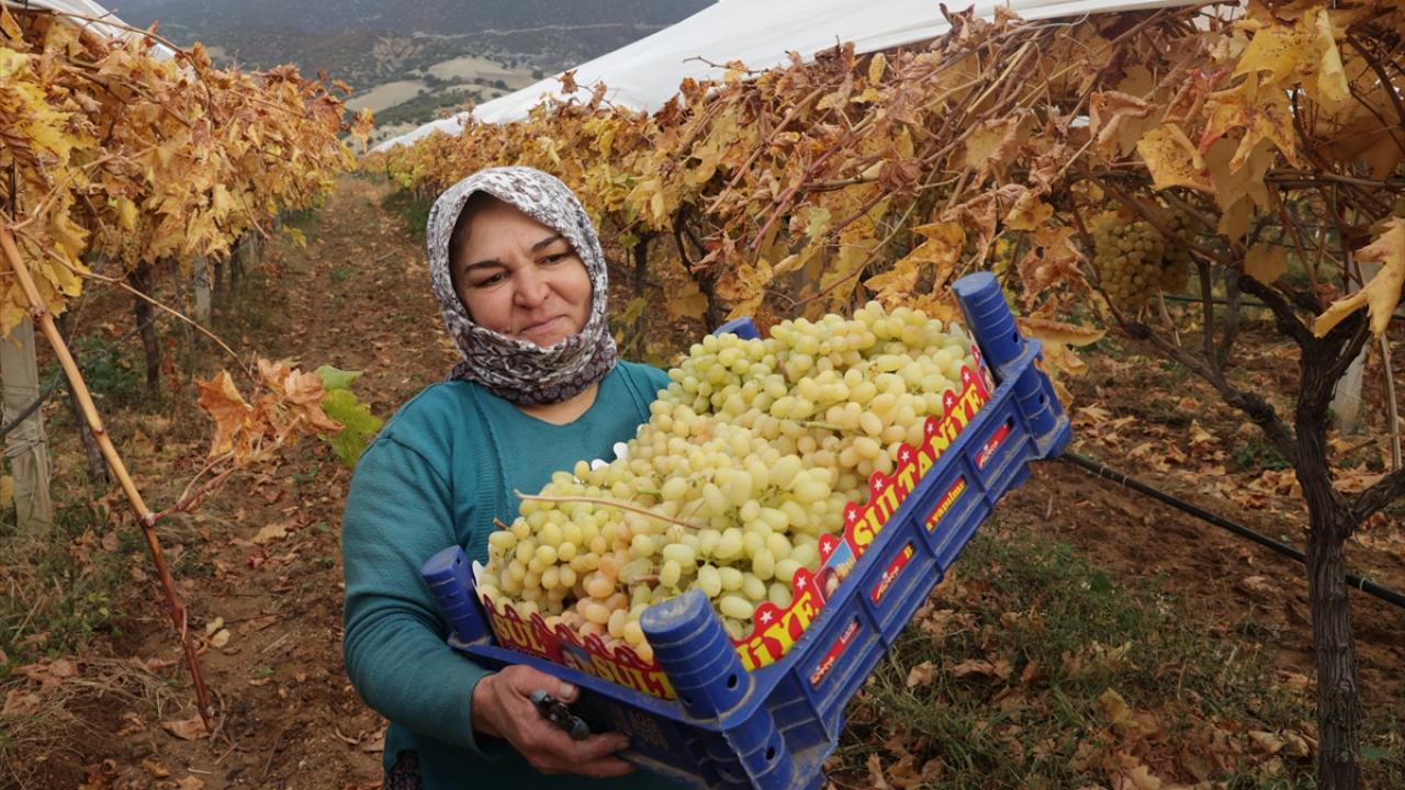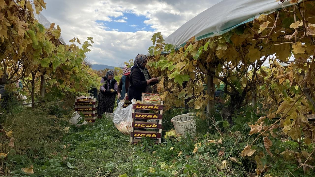 Kış mevsimiyle beraber erken saatlerde bağlara giren işçiler, asmaların üzerine örtülen kanaviçelerin altındaki son üzümleri topluyor.