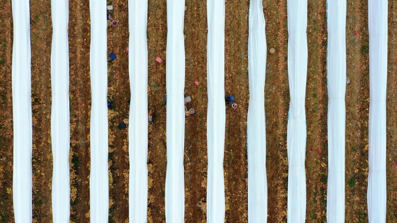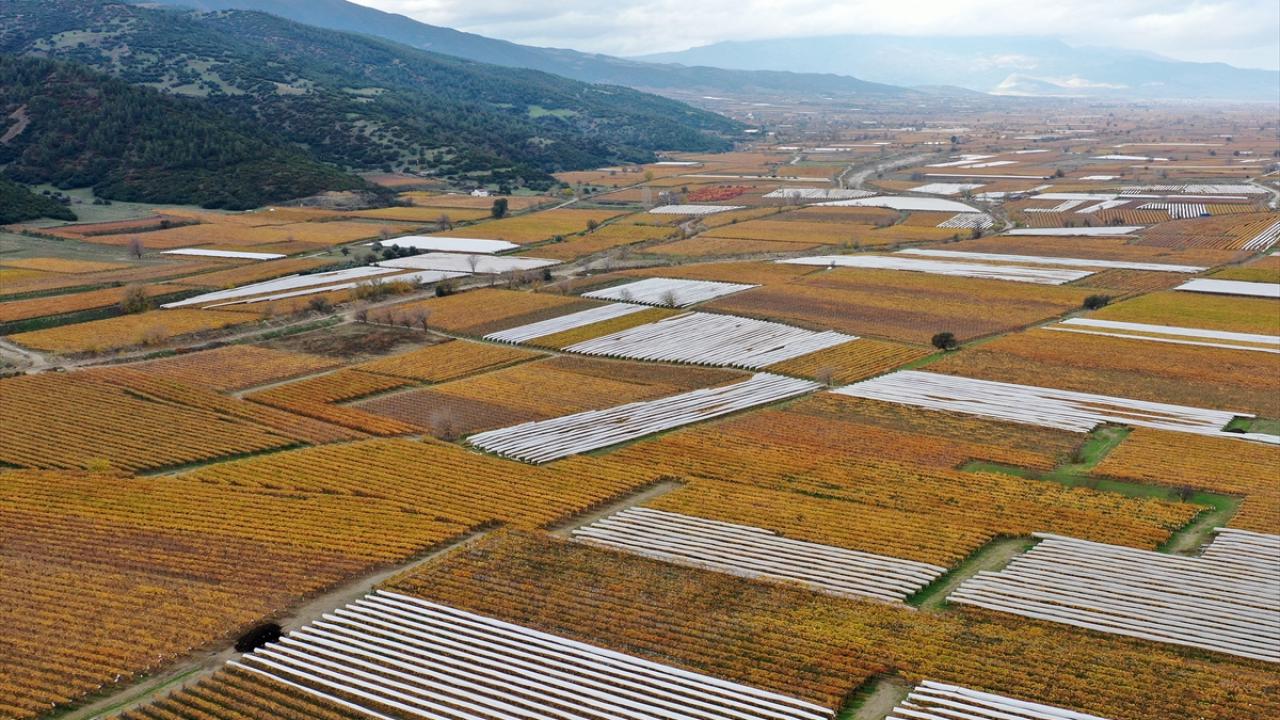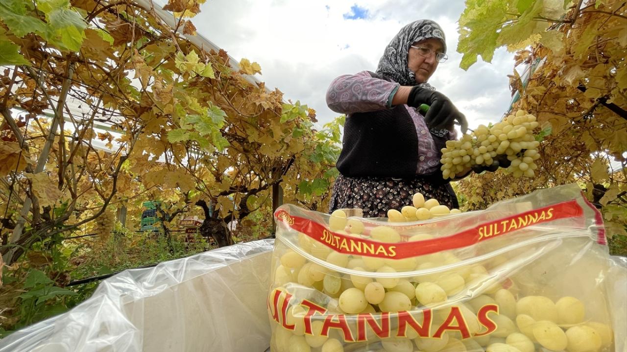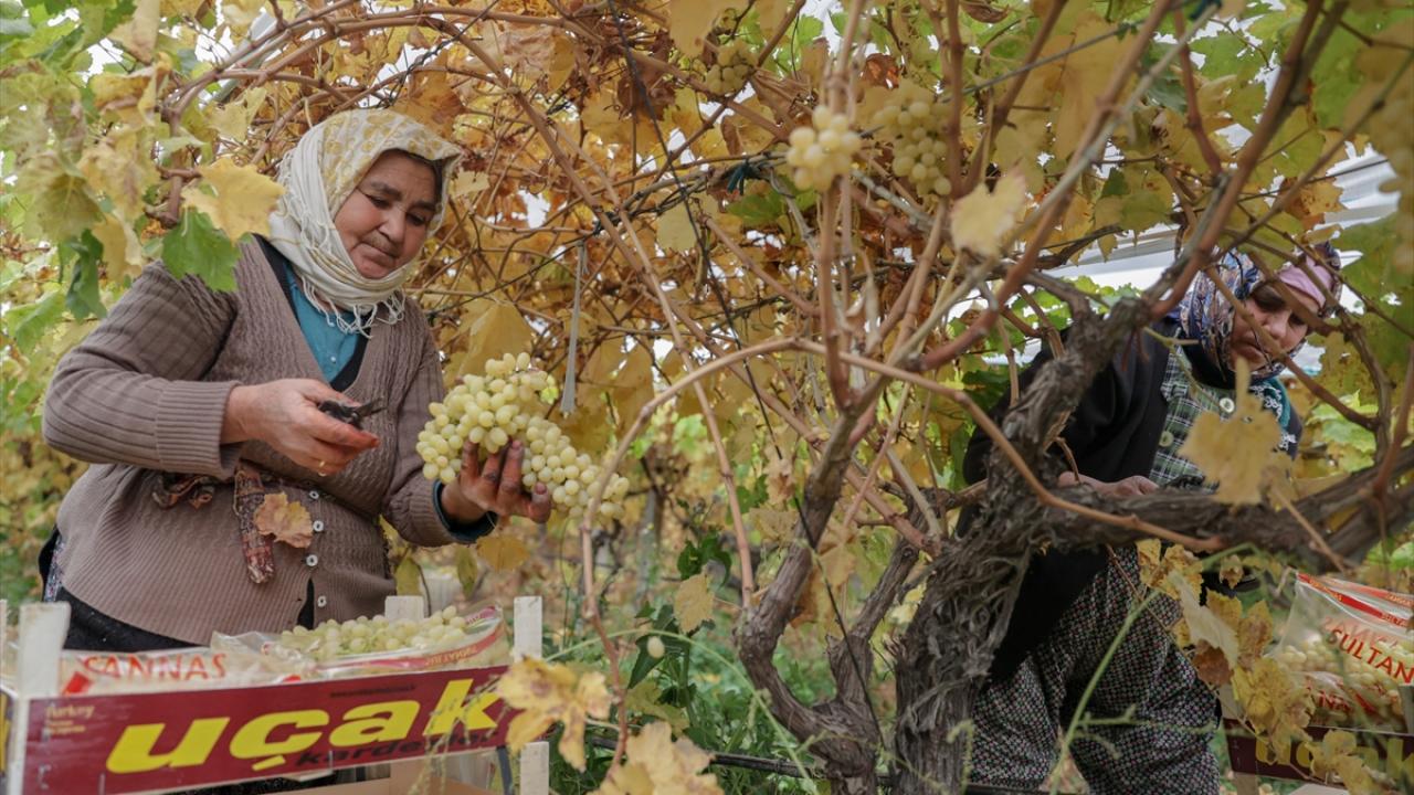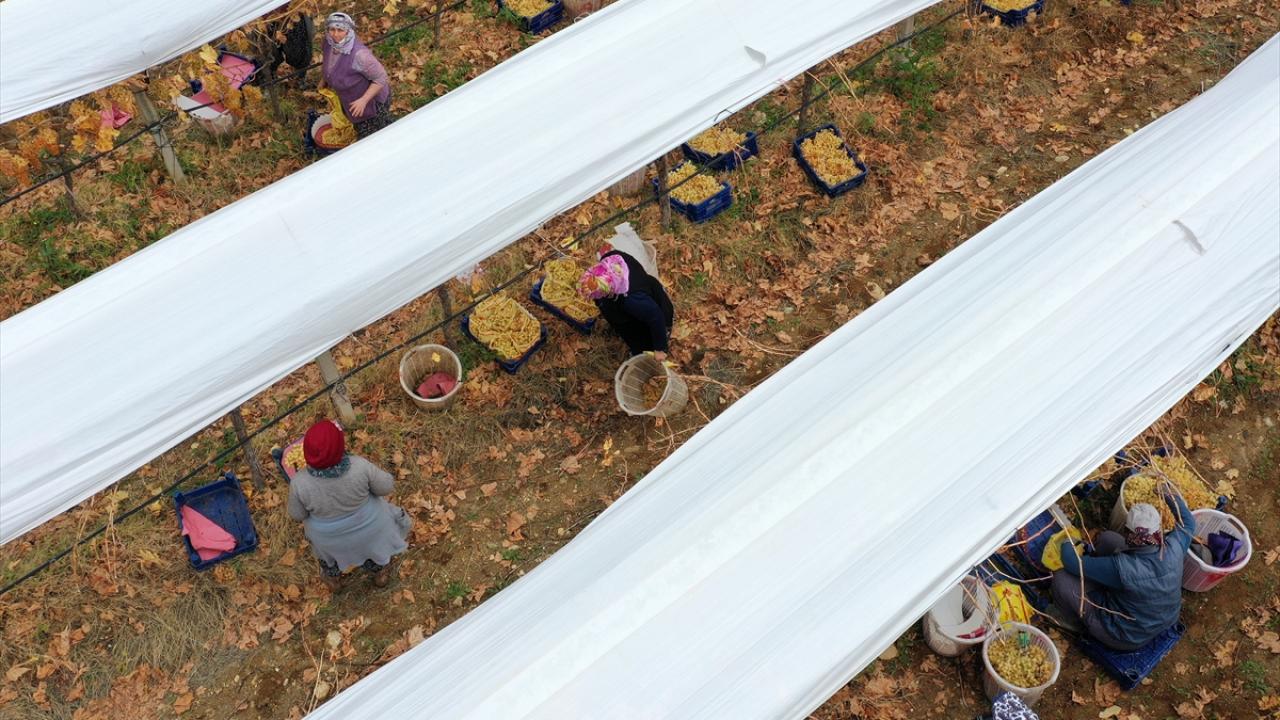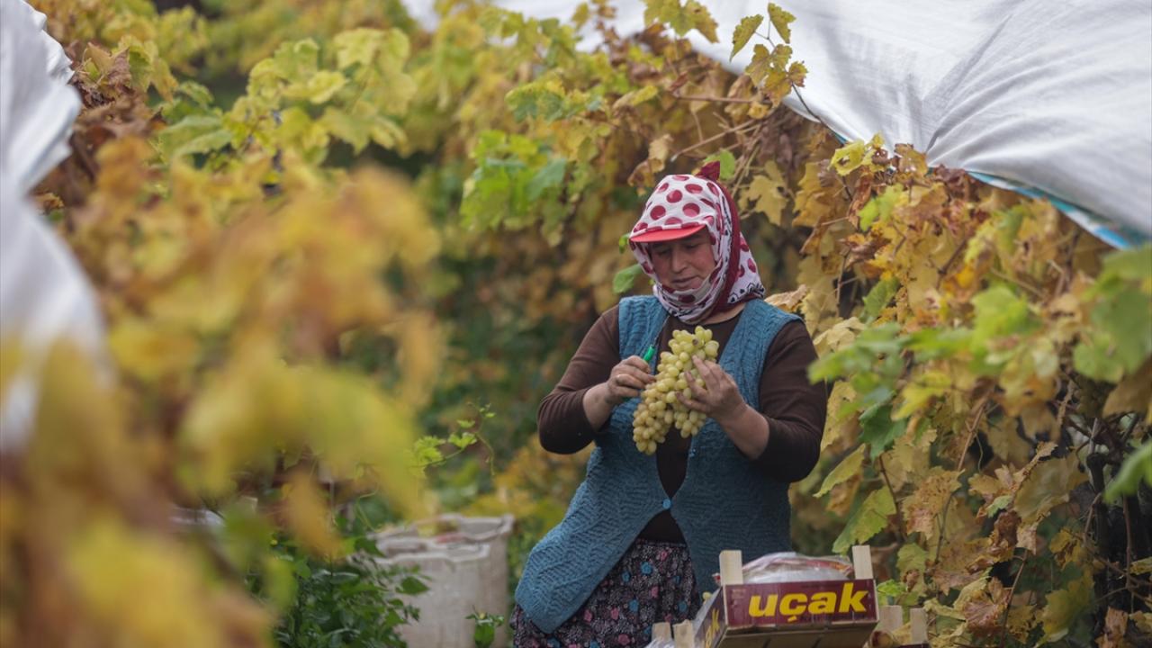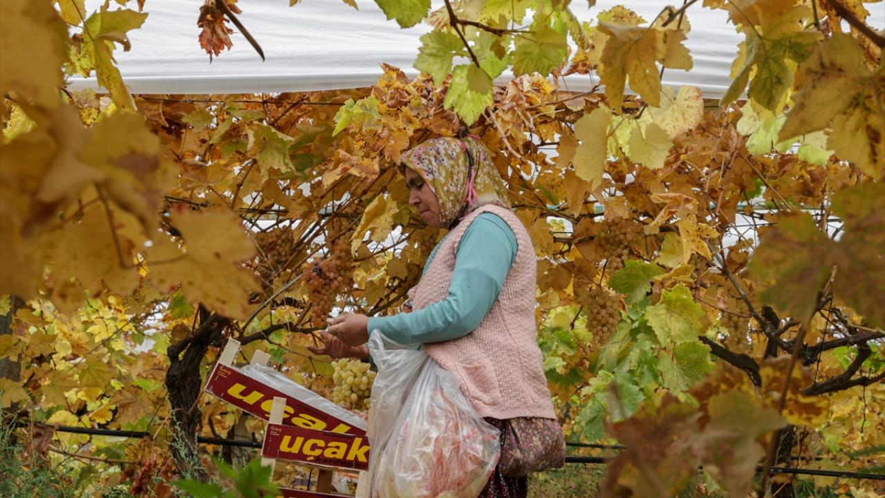 Kış mevsimiyle beraber erken saatlerde bağlara giren işçiler, asmaların üzerine örtülen kanaviçelerin altındaki son üzümleri topluyor.