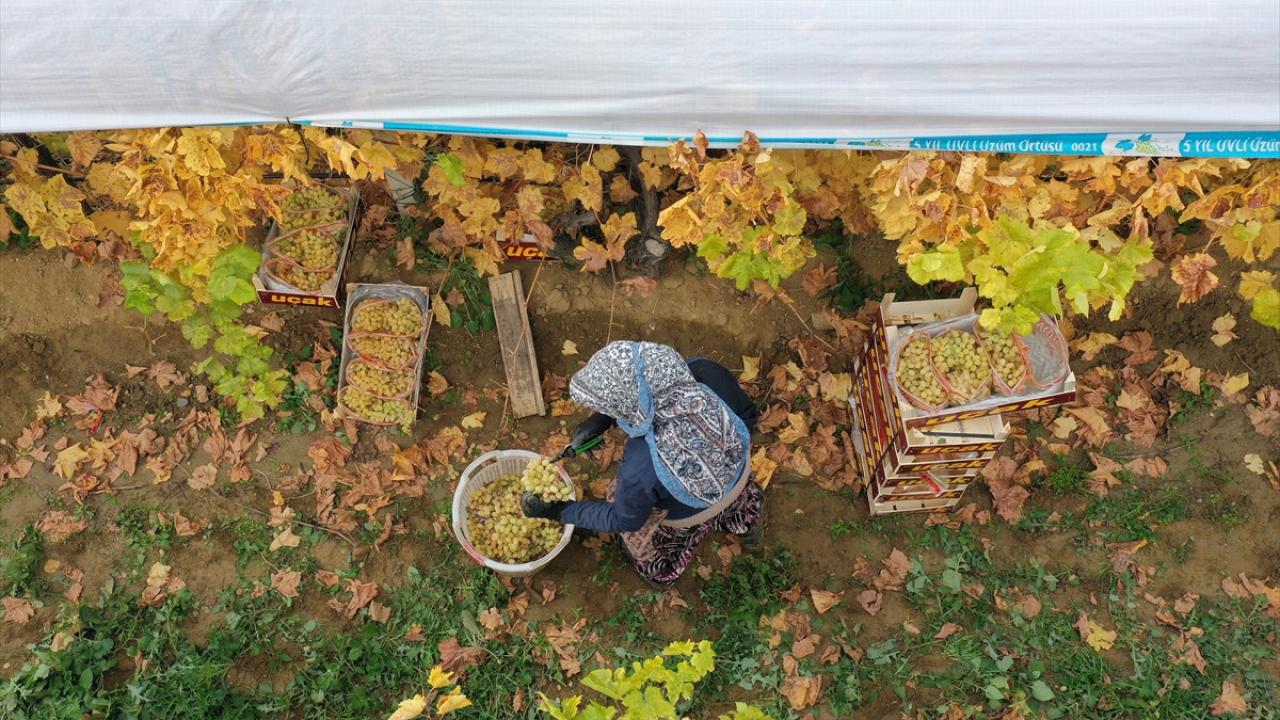 Manisa'nın Sarıgöl ilçesinde Ağustos ayında hasat edilmesi gereken ama örtü altına alınarak olgunlaşması geciktirilen sofralık üzümler, yılbaşı öncesi pazara sunuluyor.