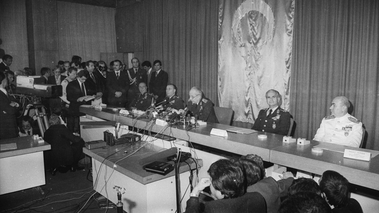 MGK Başkanı ve Genelkurmay Başkanı Orgeneral Kenan Evren (sağ 3) basına ilk açıklamasını 12 Eylül 1980`de TBMM`de yaptı. TBMM`deki açıklamada (sağdan sola) Deniz Kuvvetleri Komutanı Oramiral Nejat Tümer, Hava Kuvvetleri Komutanı Orgeneral Tahsin Şahinkaya, Kara Kuvvetleri Komutanı Orgeneral Nurettin Ersin ve Jandarma Genel Komutanı Orgeneral Sedat Celasun yer aldı. (Arşiv)