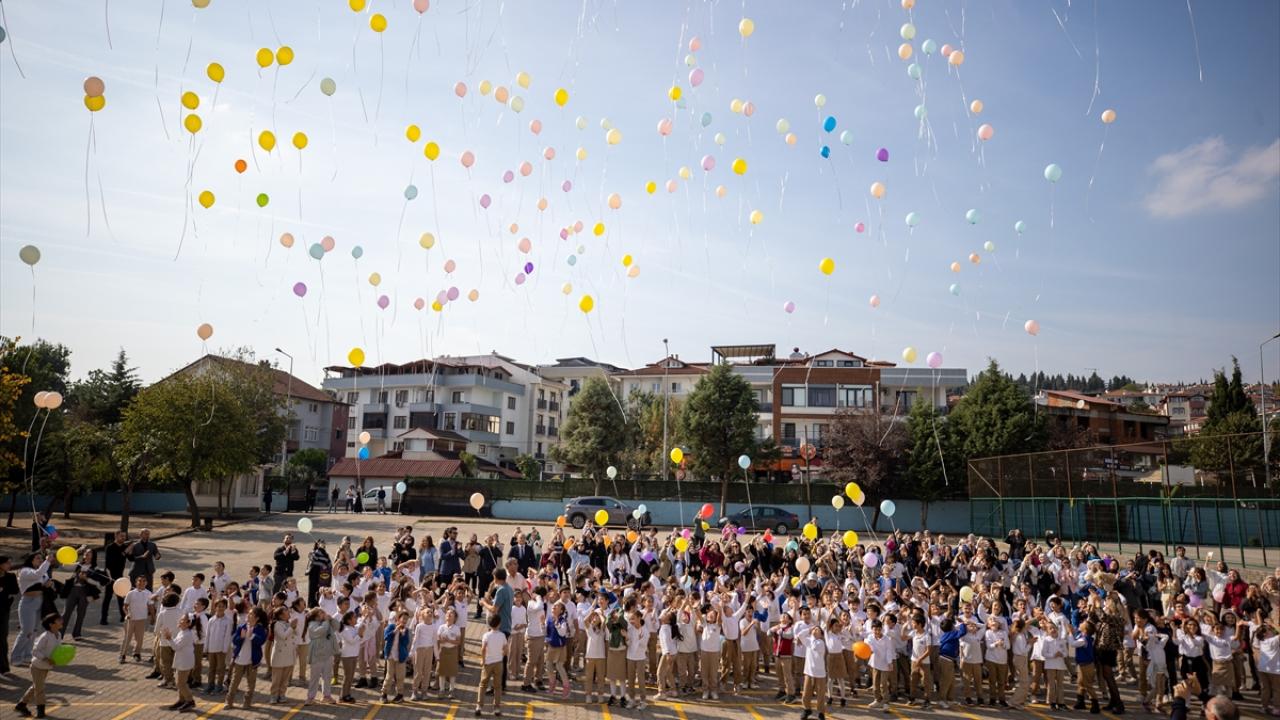 Karataş`ın eğitim gördüğü Mehmet Zorlu İlkokulu öğrencileri, ellerindeki rengarenk balonları küçük kızın geri sayımıyla gökyüzüne bıraktı.