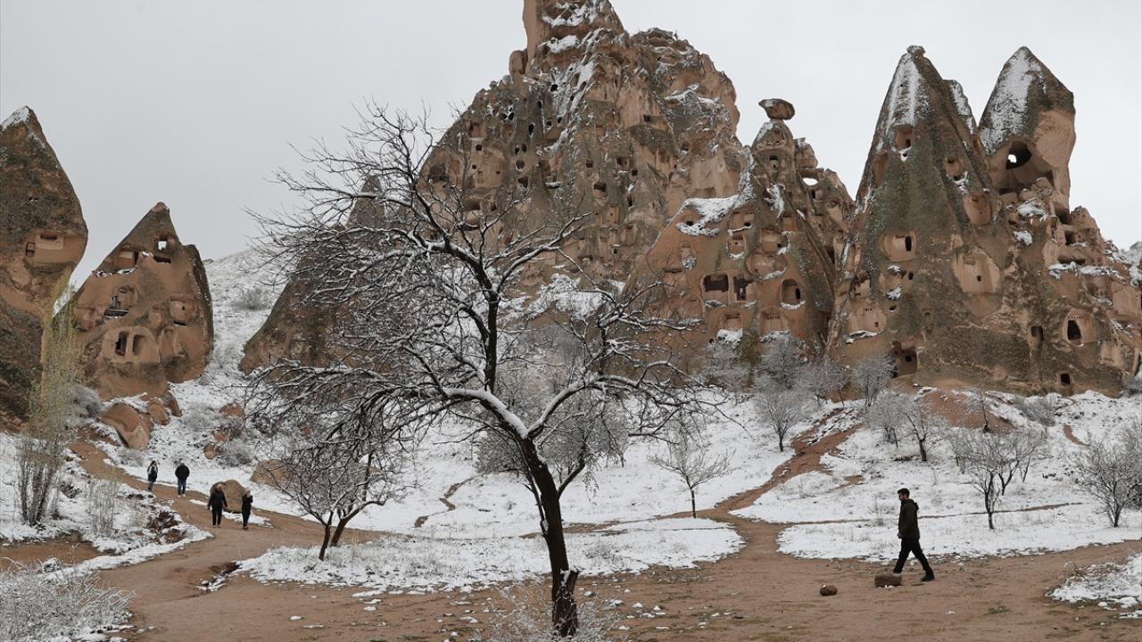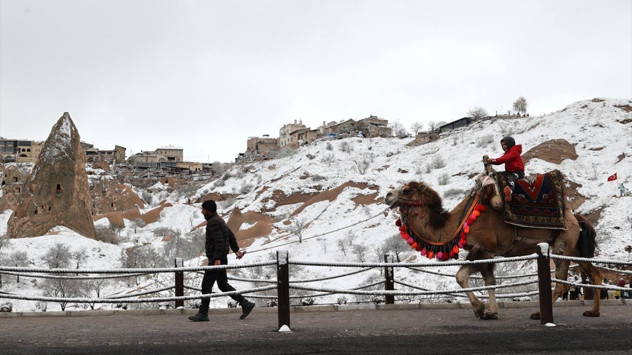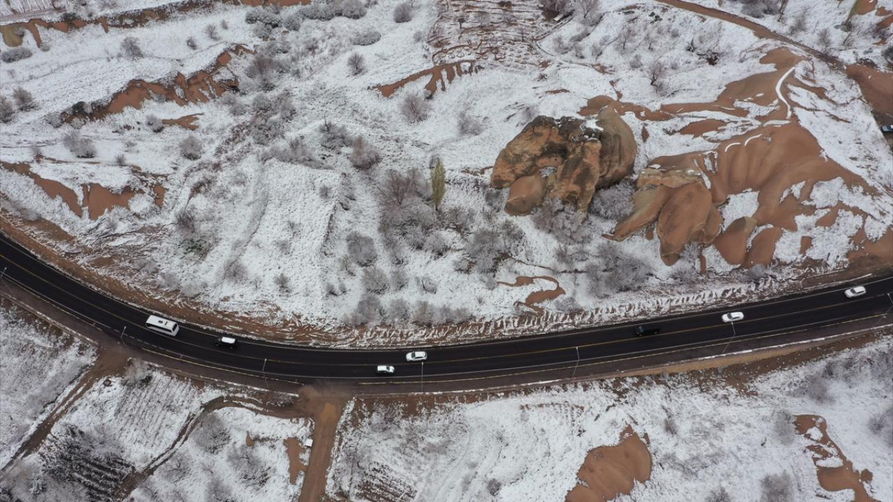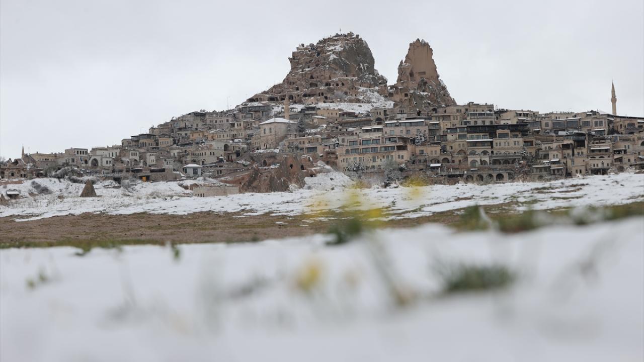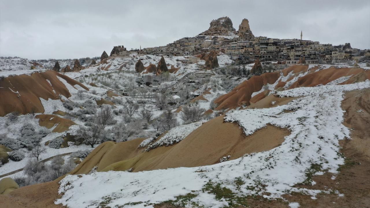 Peribacaları ve doğal kaya oluşumlarıyla her yıl milyonlarca turiste ev sahipliği yapan Kapadokya ve çevresinde sabah saatlerinden itibaren kar yağışı etkili oldu.