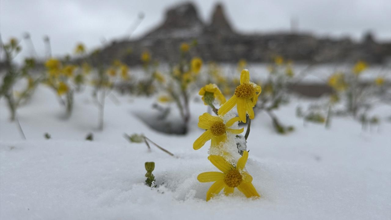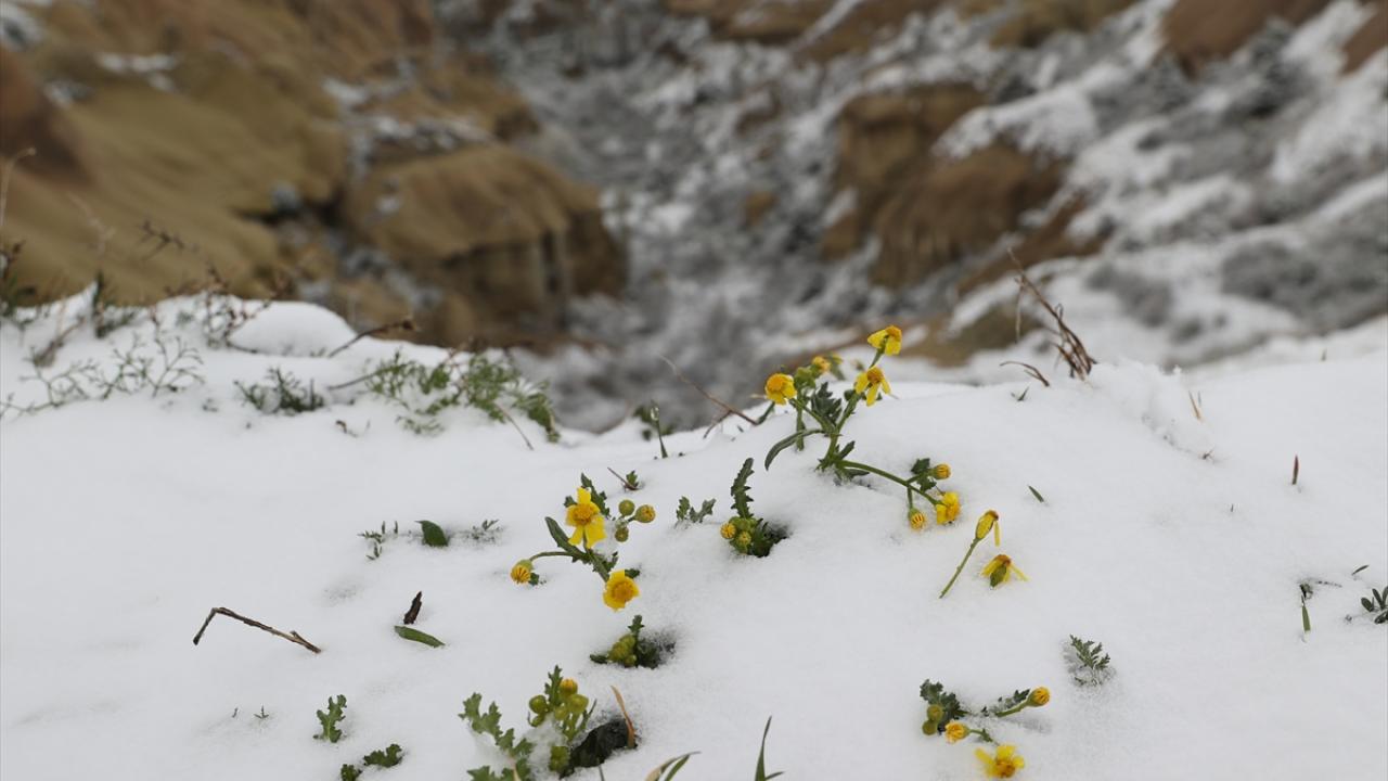 Güneşin yüzünü göstermesiyle açan çiçekler kar altında kaldı.