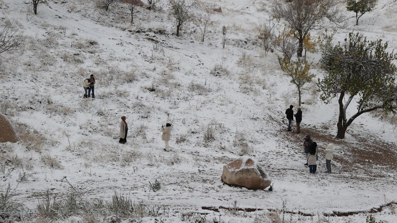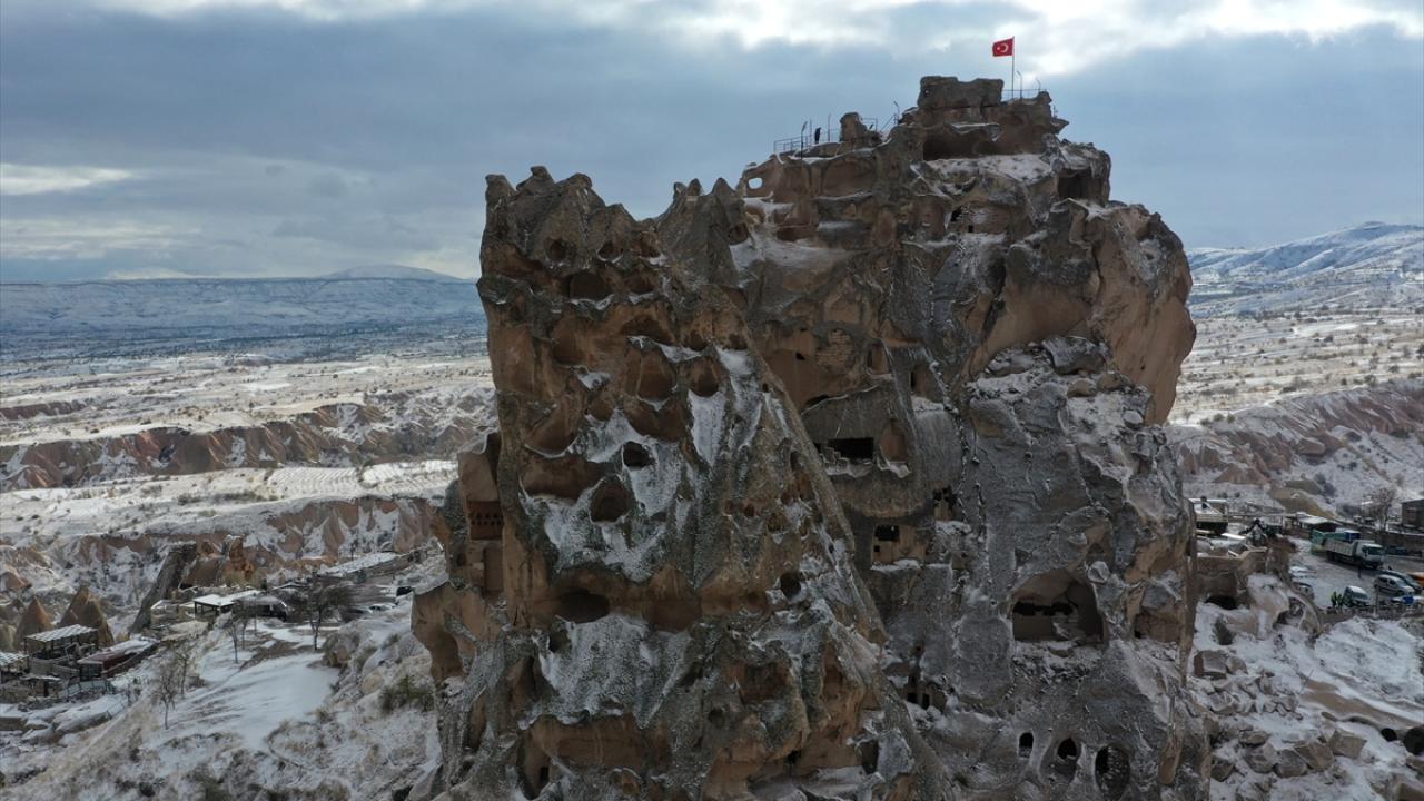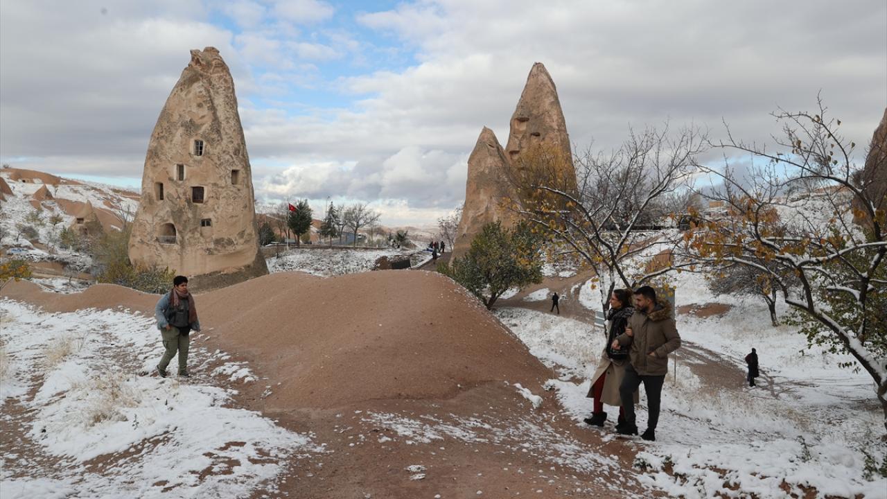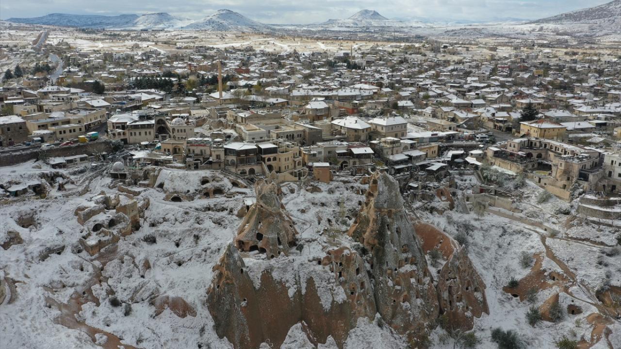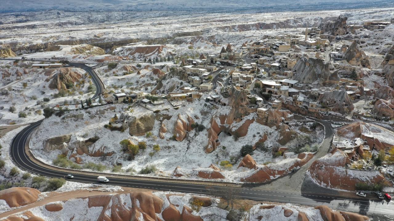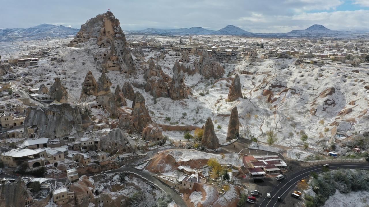 Yaklaşık 3 saat süren kar yağışının ardından UNESCO Dünya Mirasları Listesindeki Kapadokya`da peribacaları ve doğal kaya oluşumlu vadiler, kar yağışının ardından karla kaplandı.