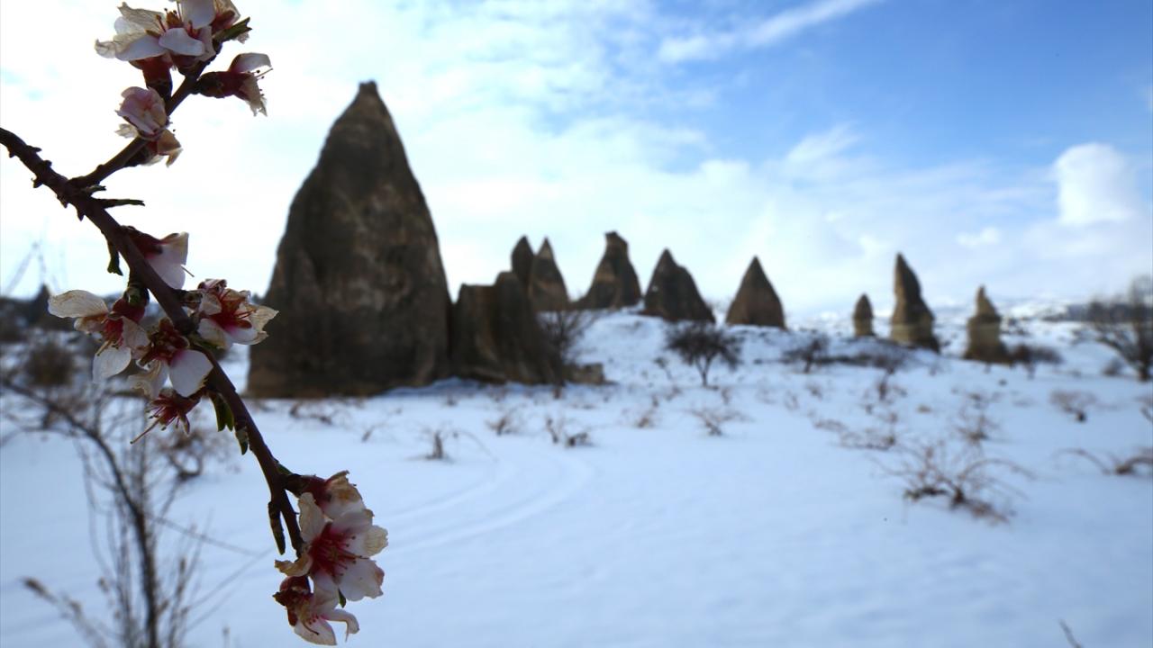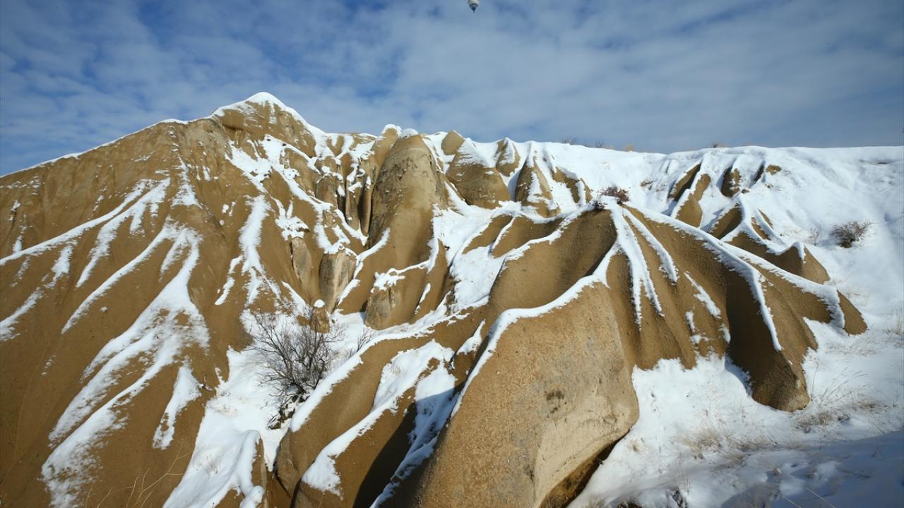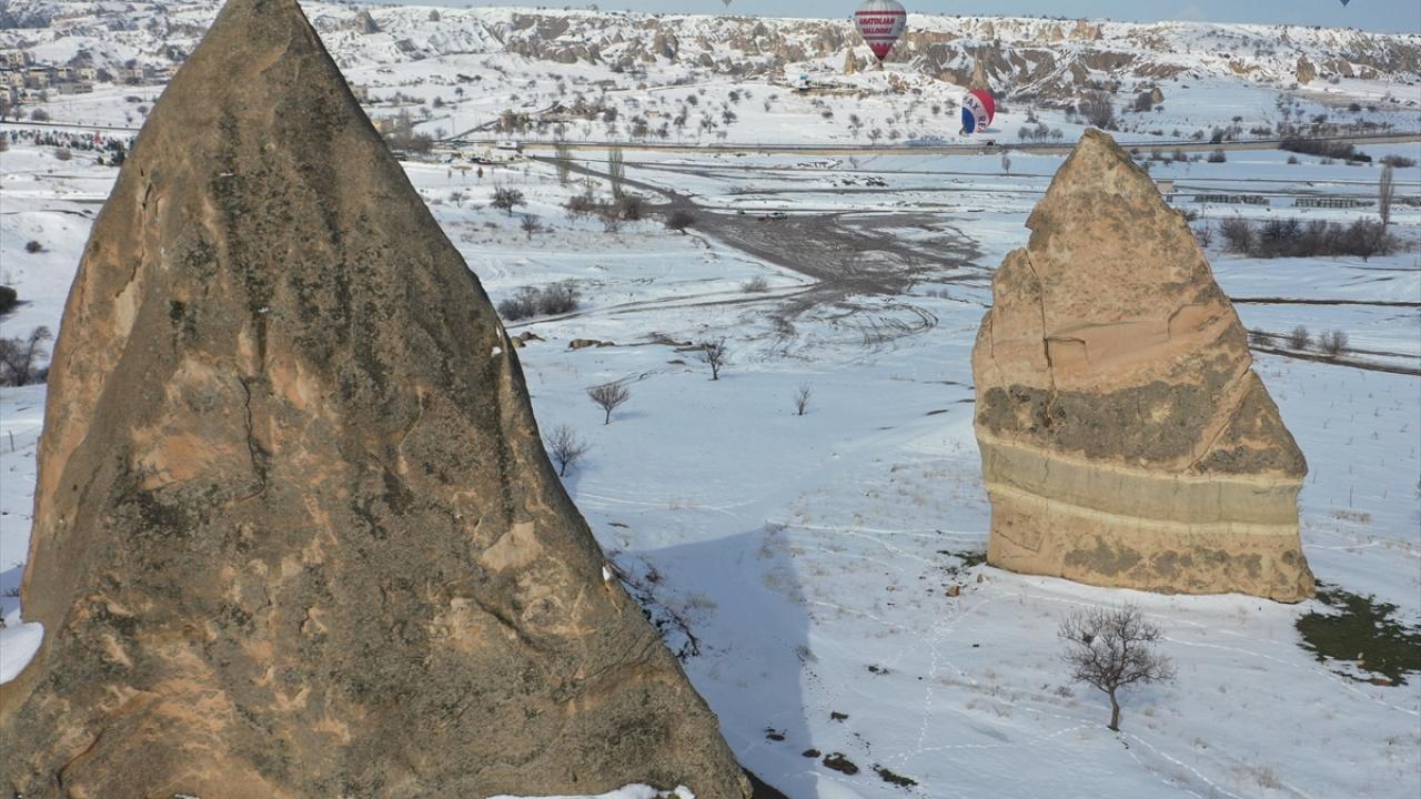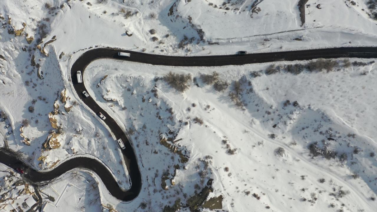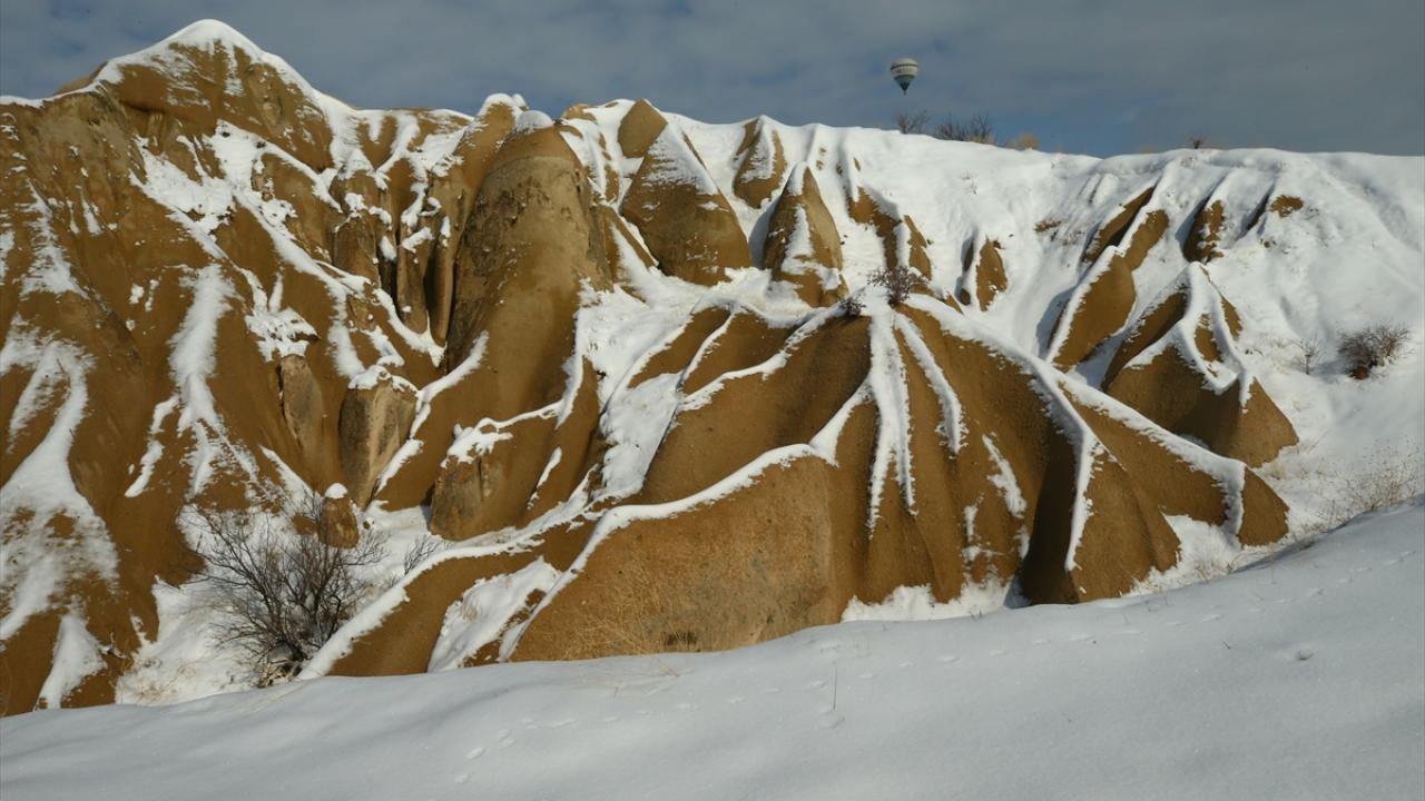 Peribacaları, doğal kaya oluşumlar ve kayadan oyma tarihi mekanların karla bütünleşmesi güzel görüntü ortaya çıkardı.