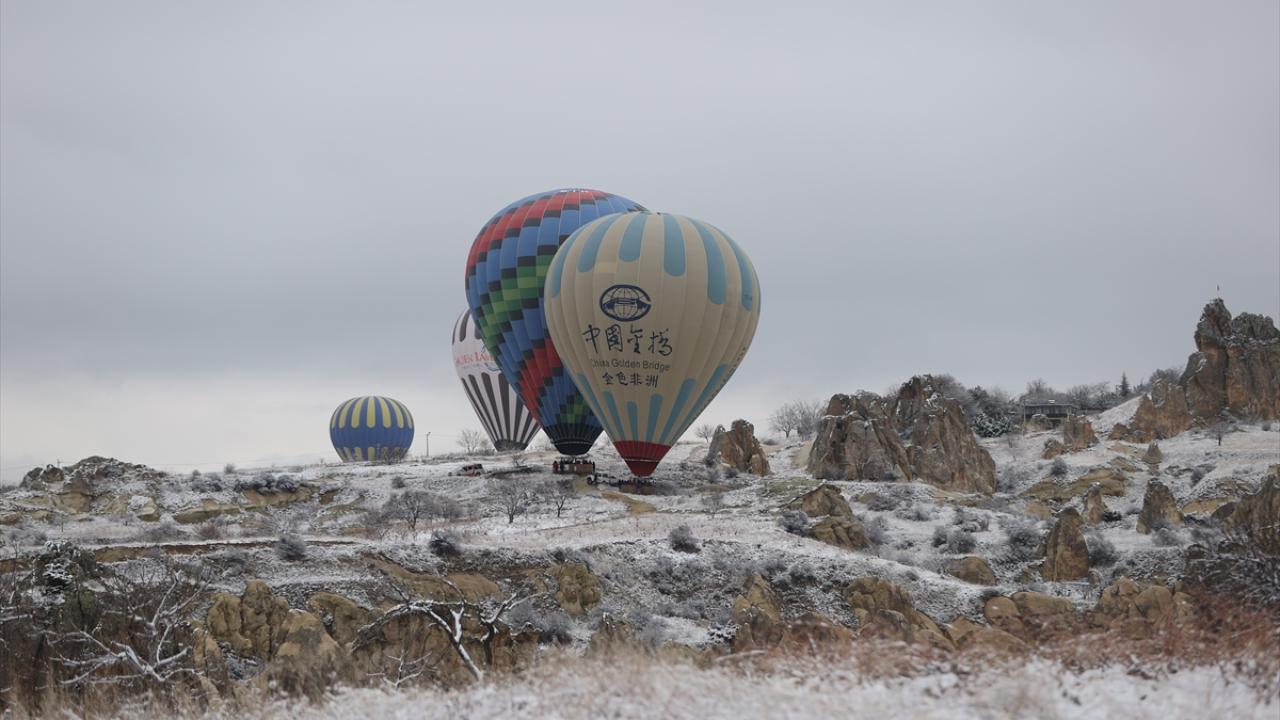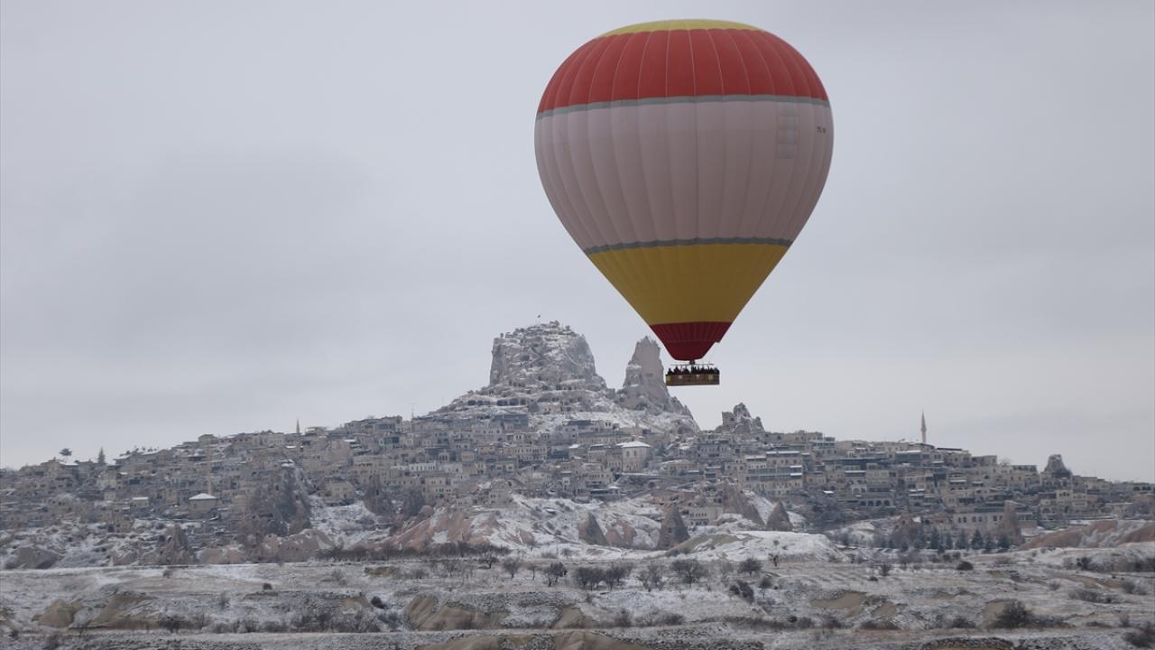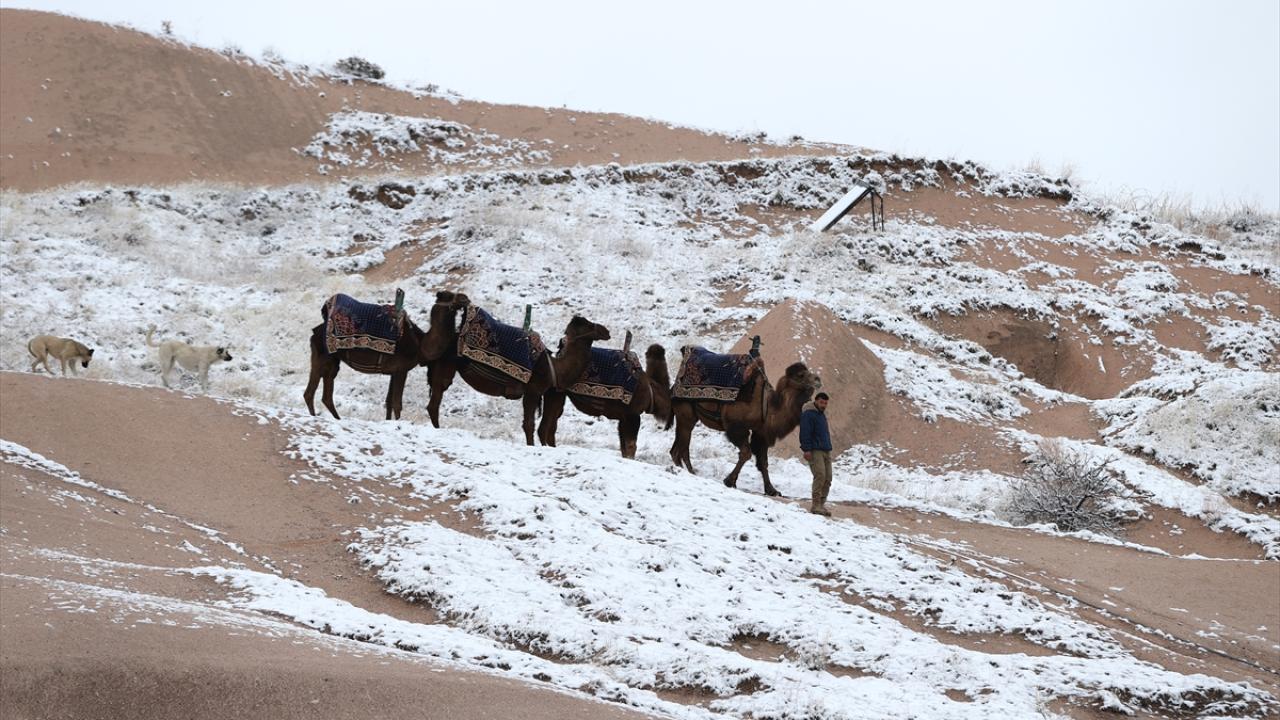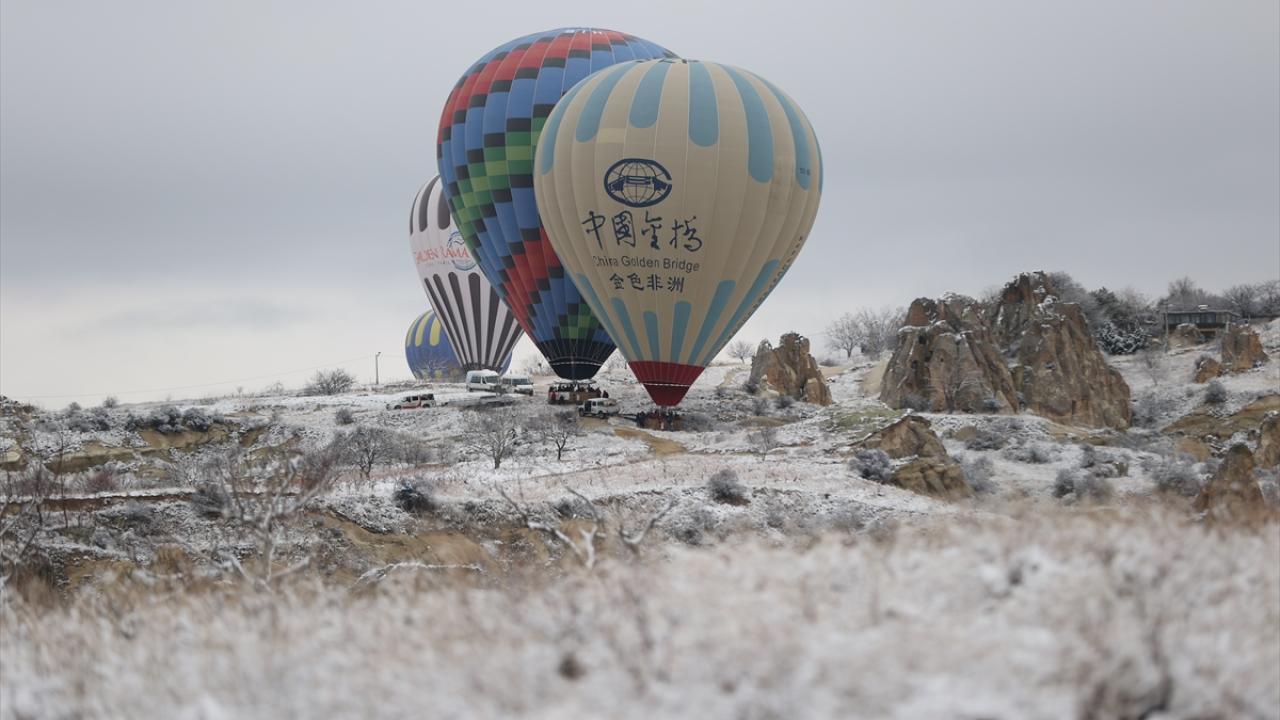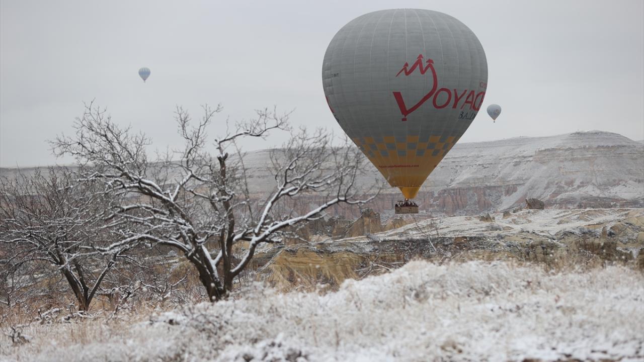 Türkiye’nin gözde turizm merkezi Kapadokya'da etkili olan kar yağışı, milyonlarca yıl önce oluşan peribacaları ve doğal kaya oluşumlarını beyaza bürüdü.