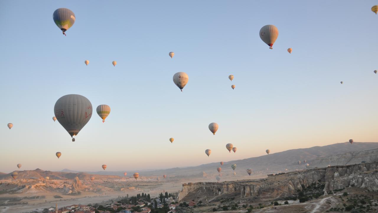 Kapadokya`nın eşsiz güzelliğini ve güneşin doğuşunu izleme fırsatı bulan turistler, çektikleri fotoğraflarla "Büyük Zafer`in 100. yıl dönümü"nü ölümsüzleştirdi.