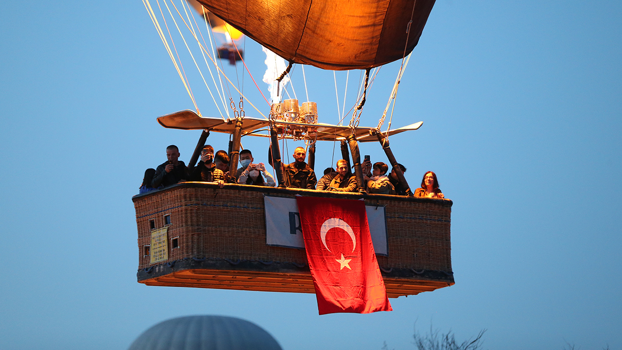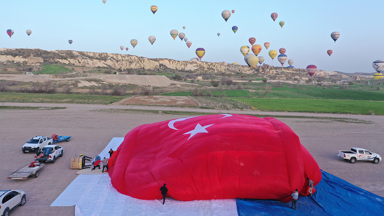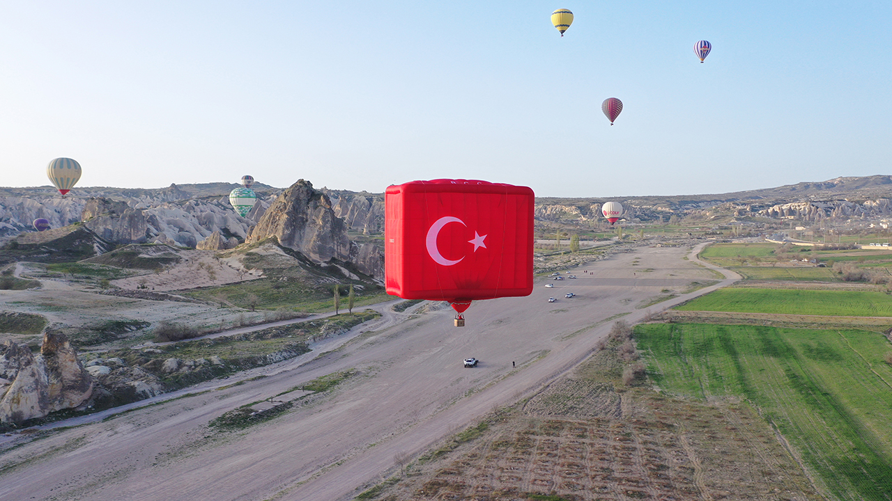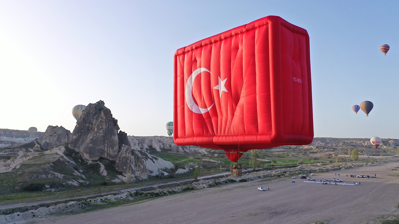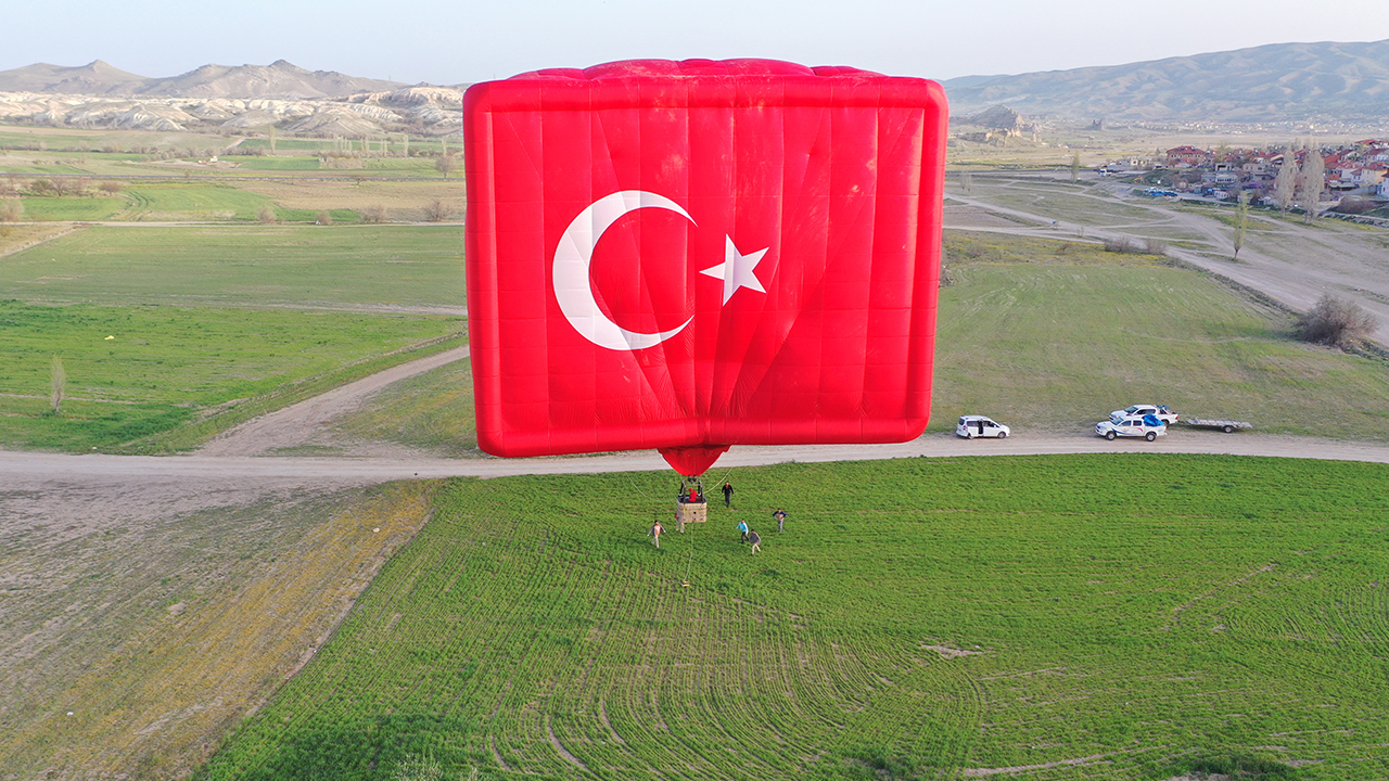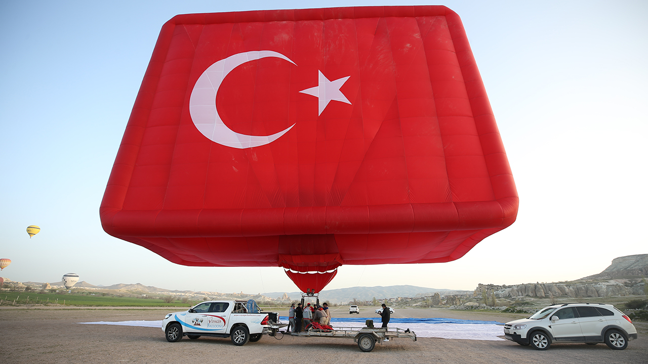 Nevşehir`in Ürgüp ilçesine bağlı Ortahisar beldesinde yerli balon üretimi yapan Pasha Balloons tarafından hazırlanan Türk bayrağı figürlü sıcak hava balonu da gün dolayısıyla özel uçuş gerçekleştirdi.