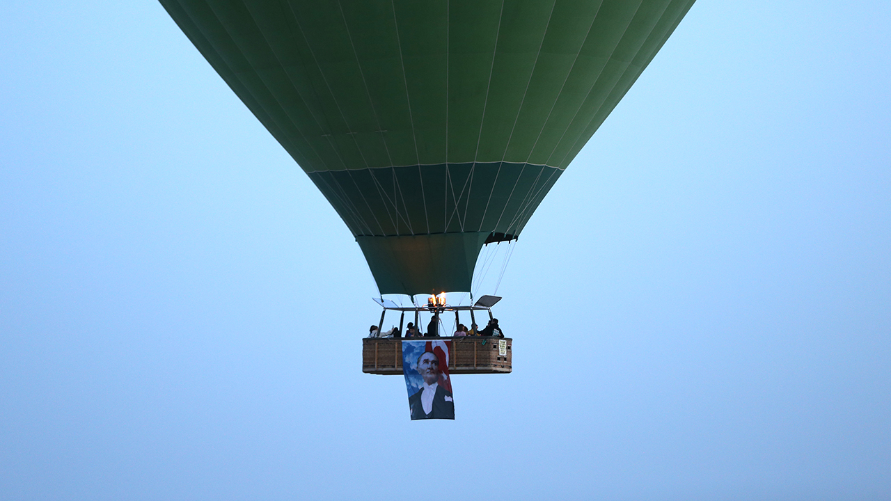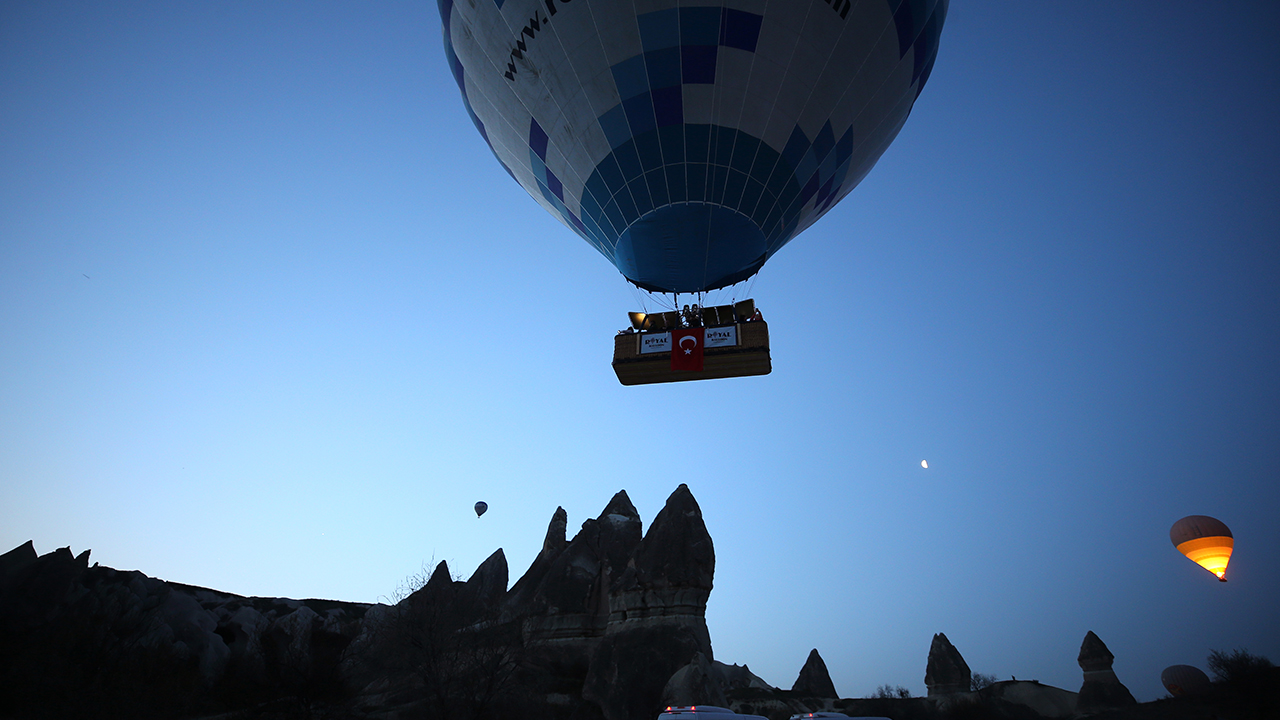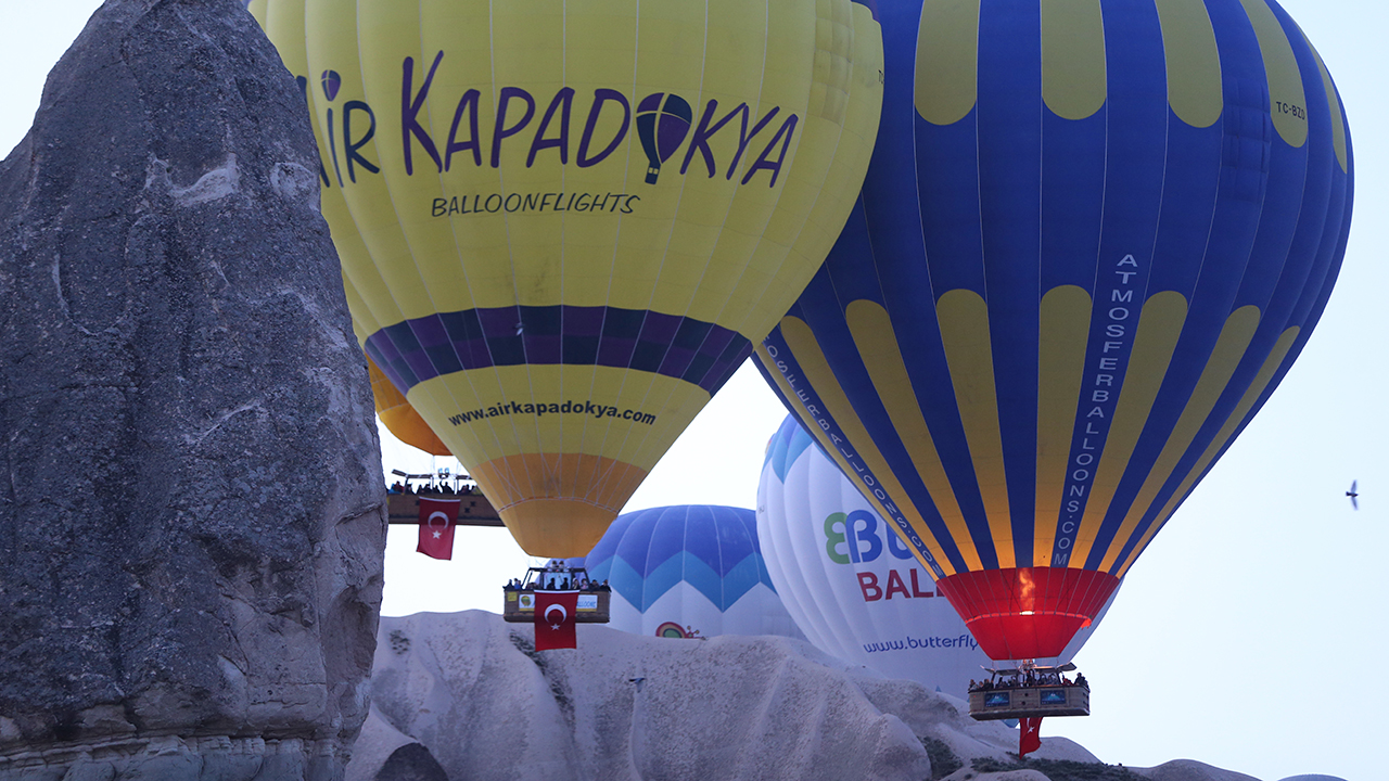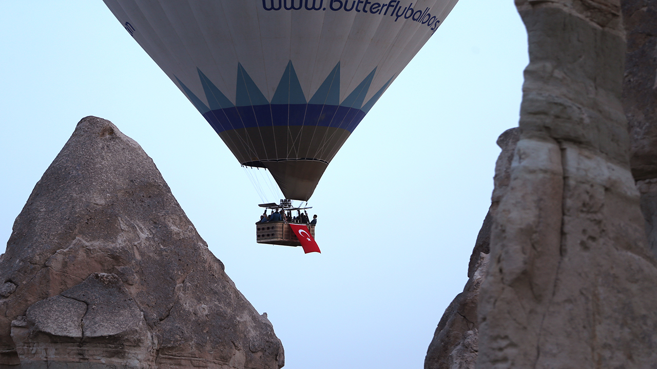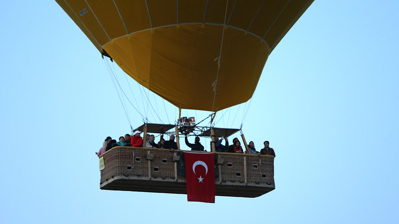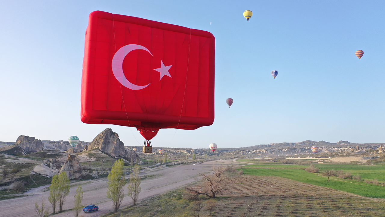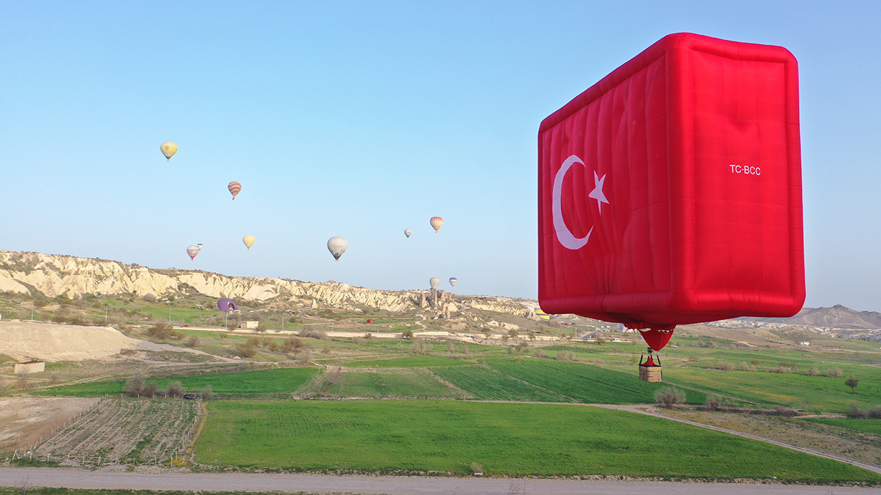 Nevşehir`in Ürgüp ilçesine bağlı Ortahisar beldesinde yerli balon üretimi yapan Pasha Balloons tarafından hazırlanan Türk bayrağı figürlü sıcak hava balonu da gün dolayısıyla özel uçuş gerçekleştirdi.