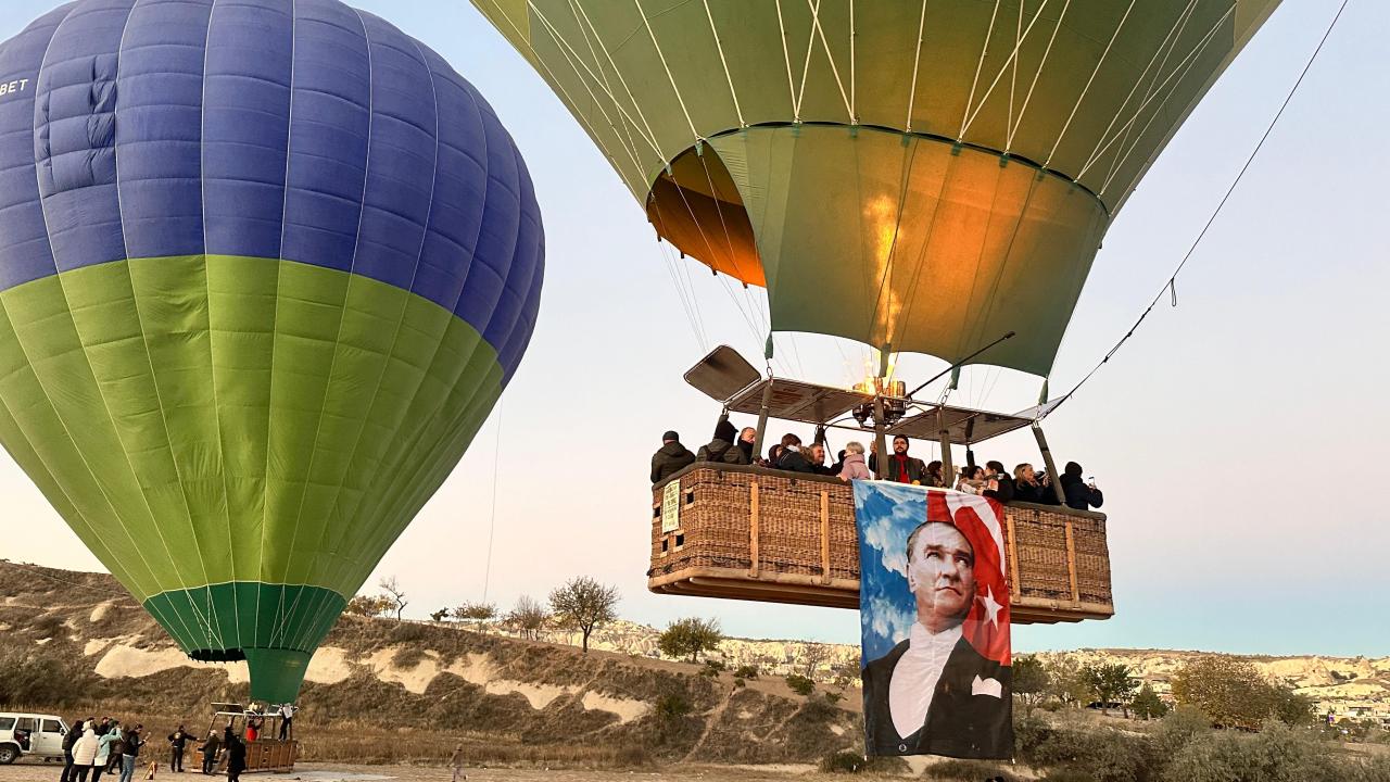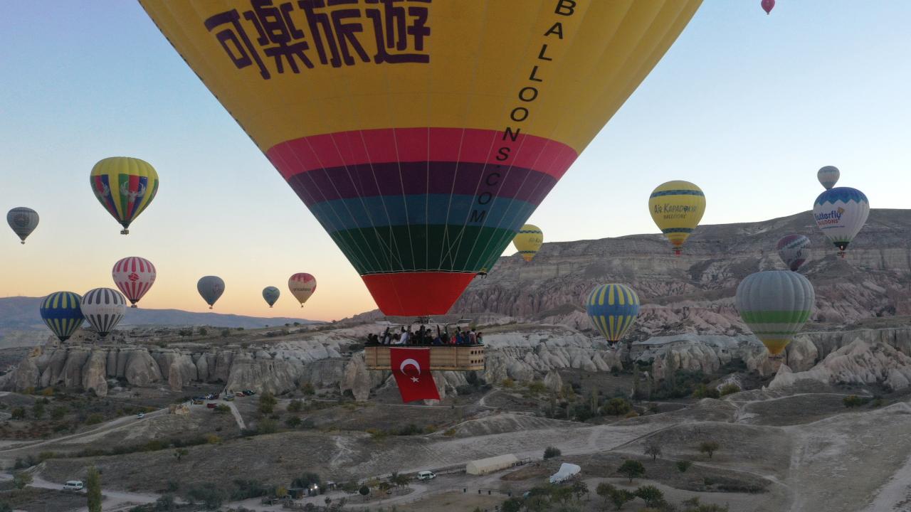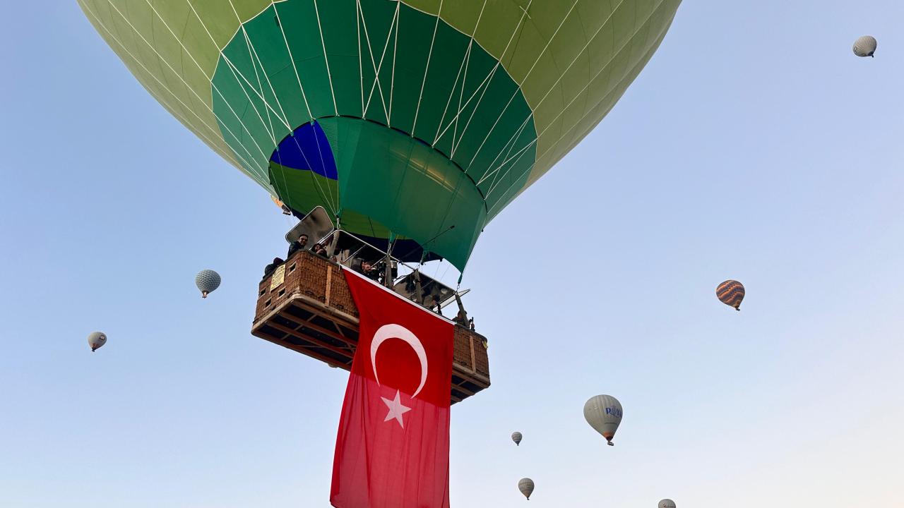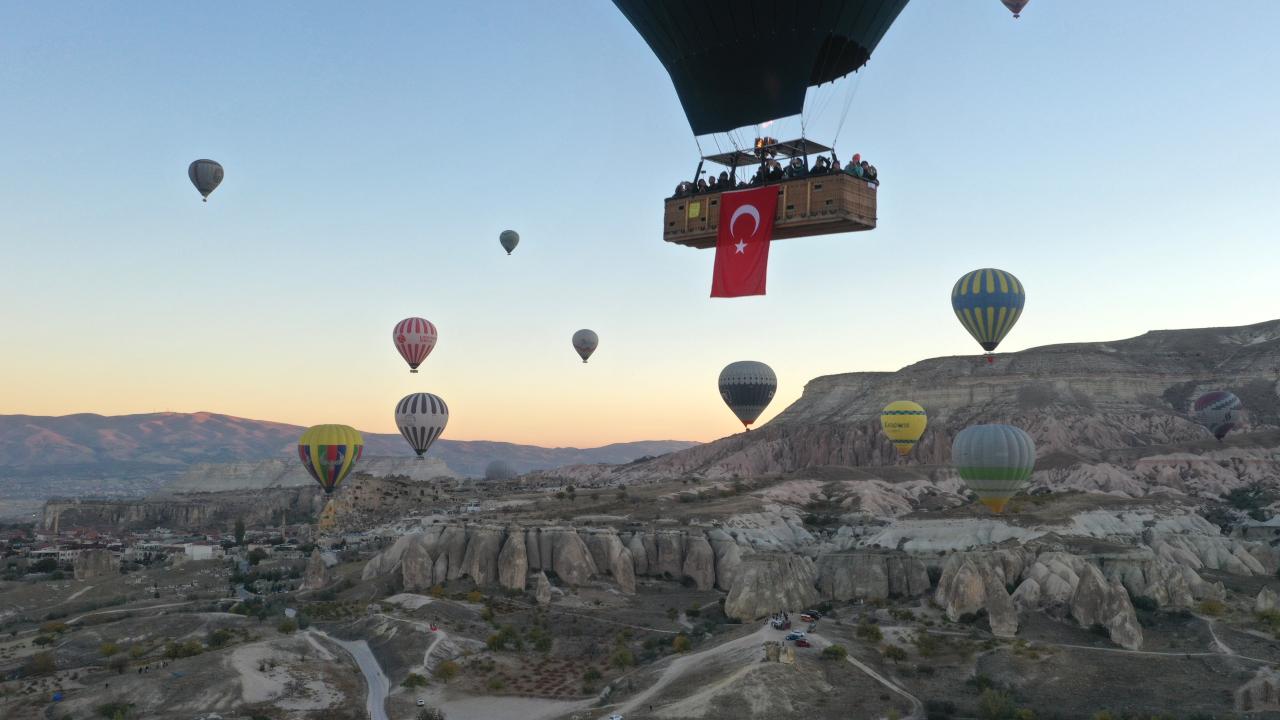 Turistlerin bölgenin doğal güzelliklerini gökyüzünden izlemesine imkan sunan sıcak hava balonları, 29 Ekim Cumhuriyet Bayramı dolayısıyla sepetlerine asılan Türk bayrakları ve Atatürk posterleri ile uçuş gerçekleştirdi.