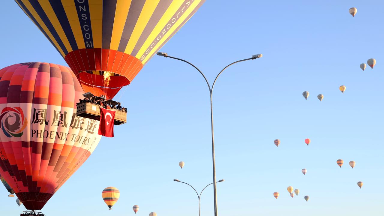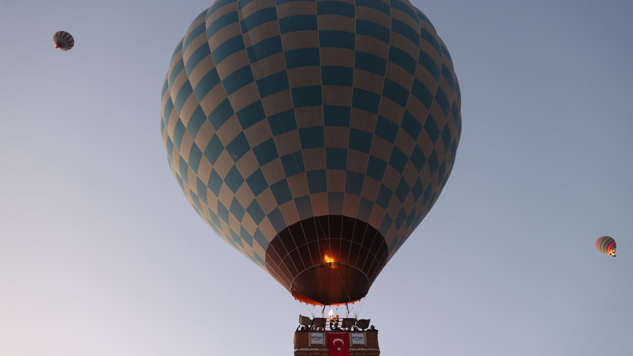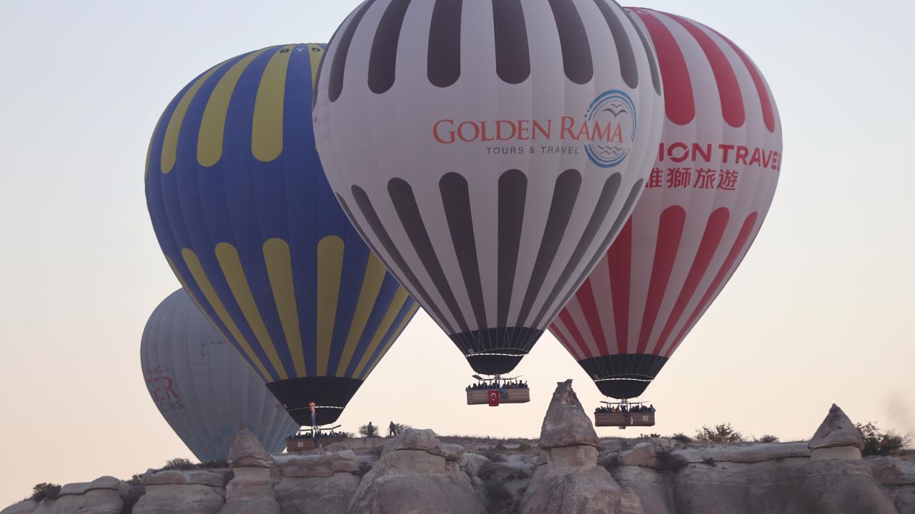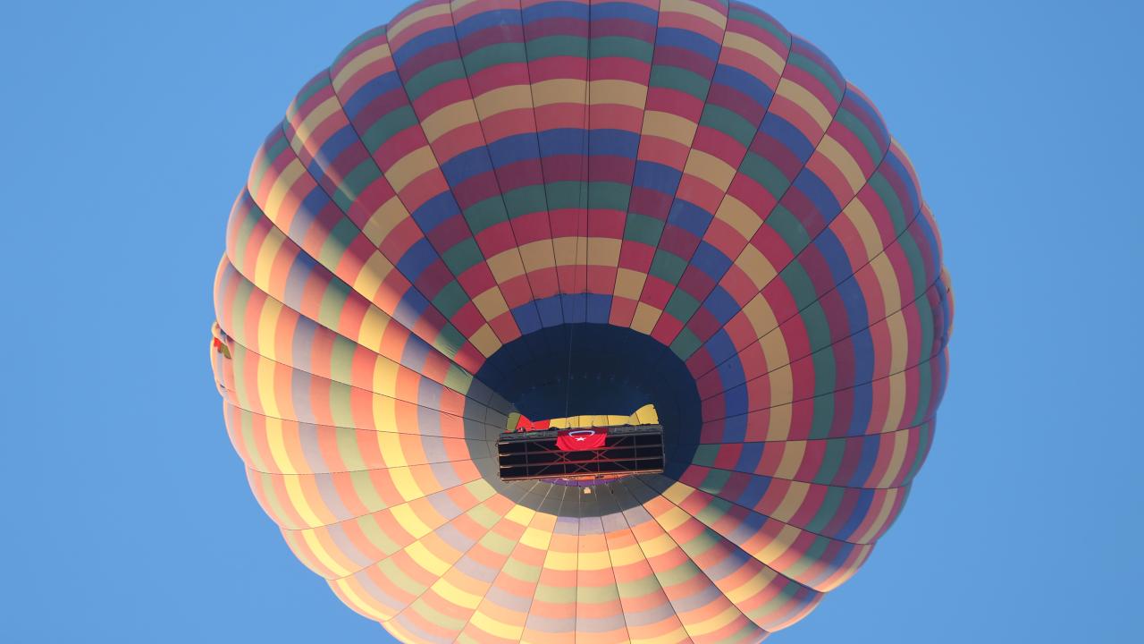 Turistlerin bölgenin doğal güzelliklerini gökyüzünden izlemesine imkan sunan sıcak hava balonları, 29 Ekim Cumhuriyet Bayramı dolayısıyla sepetlerine asılan Türk bayrakları ve Atatürk posterleri ile uçuş gerçekleştirdi.