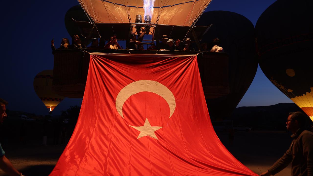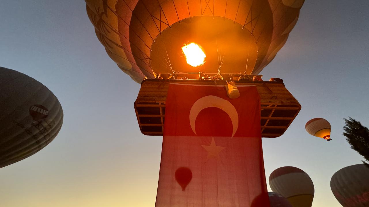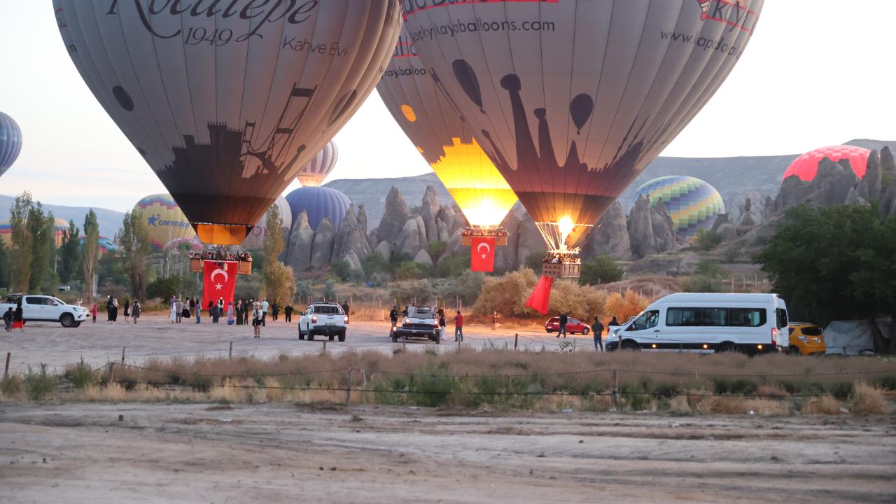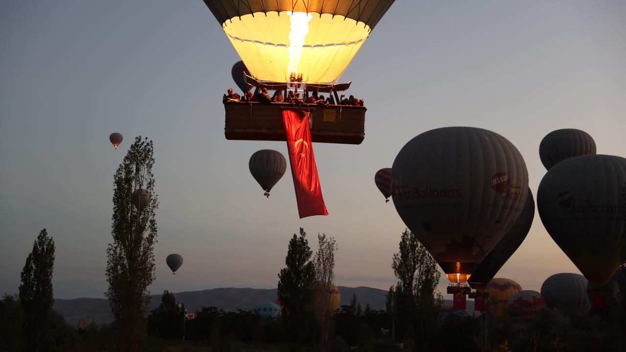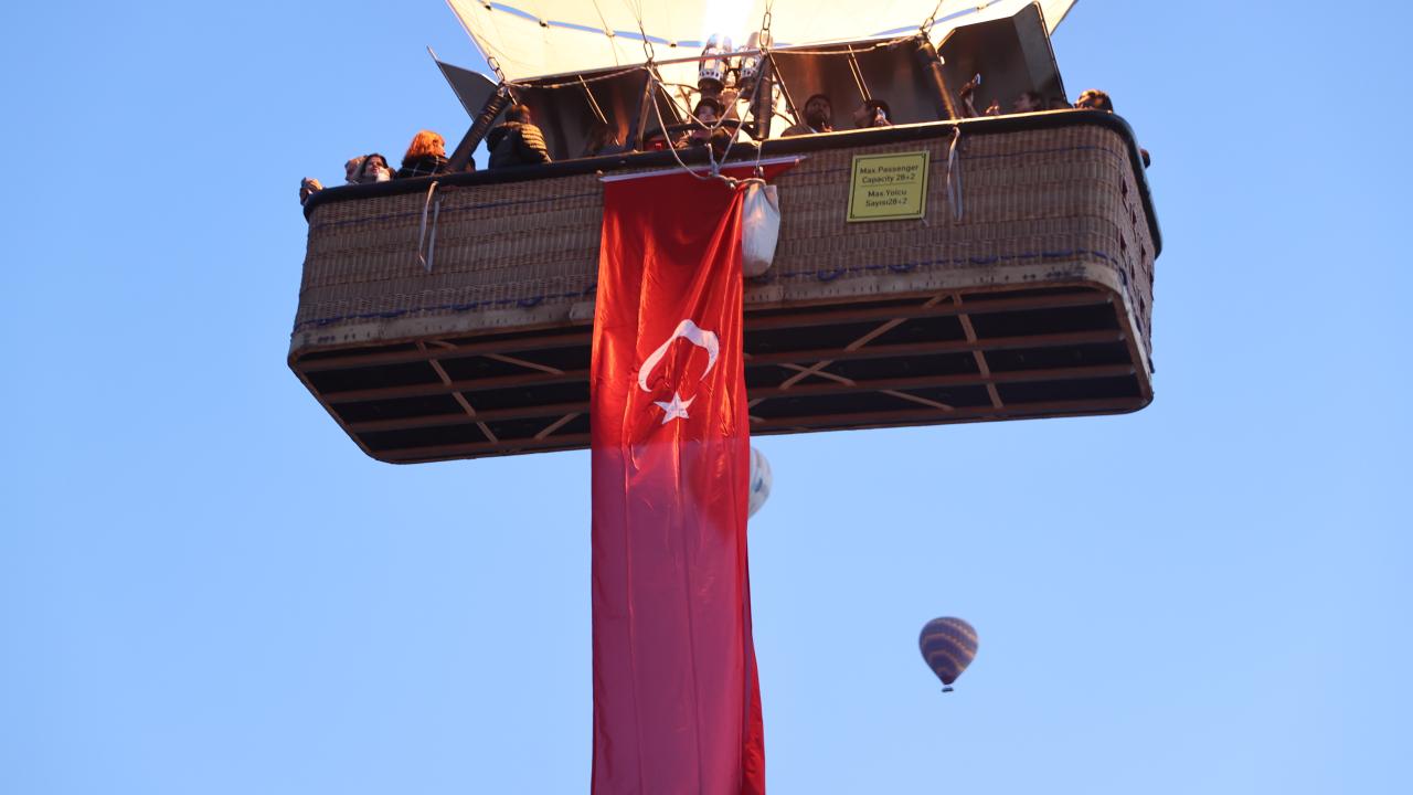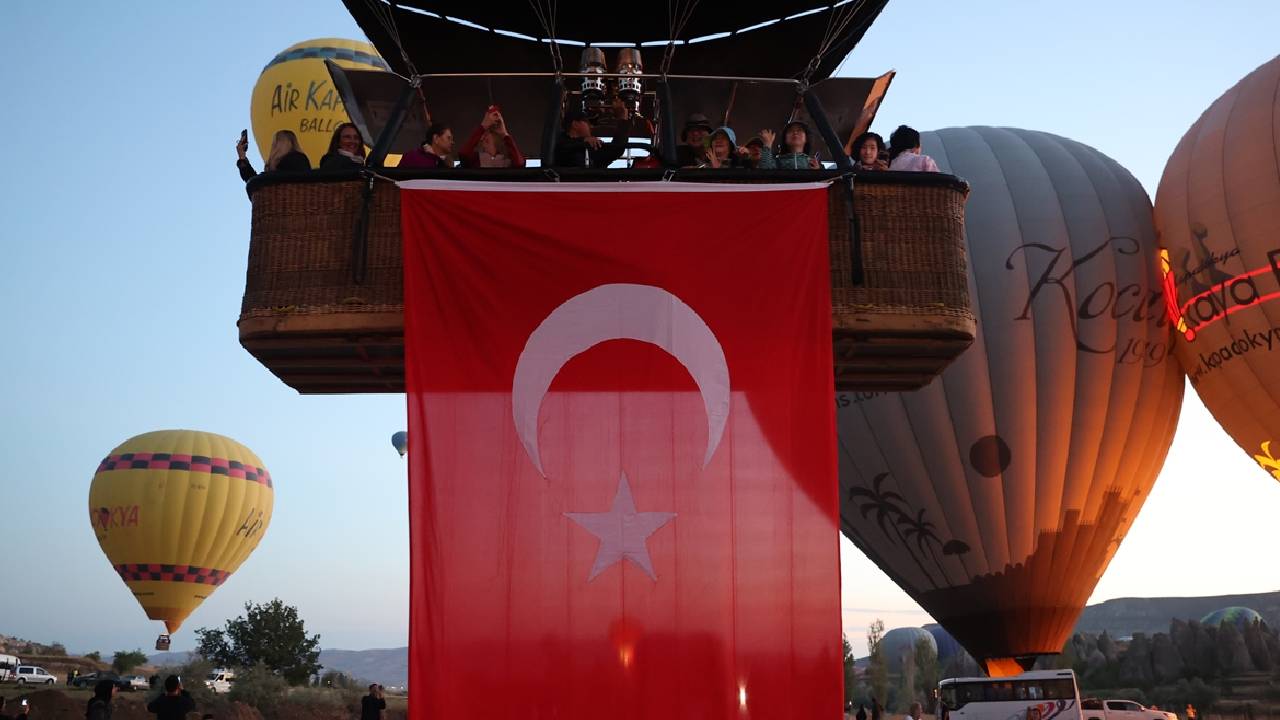 Doğal, tarihi, kültürel zenginlikleri ve ilginç coğrafyası ile yerli ve yabancı turistlerin ilgisini çeken turizm bölgesi Kapadokya`da, sıcak hava balonları sepetlerine asılan Türk bayraklarıyla uçtu.