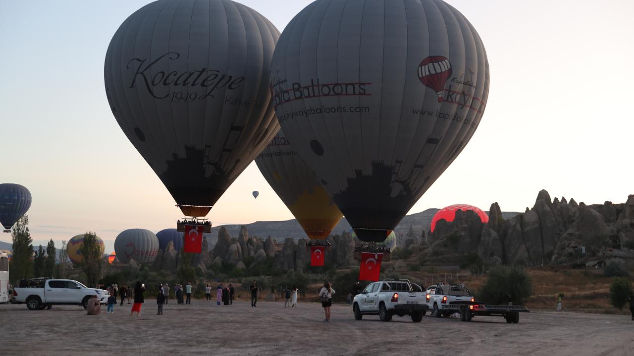 Nevşehir`in Göreme beldesindeki balona kalkış alanındaki hazırlıkların ardından görevlilerce sepetlere Türk bayrakları asıldı.
