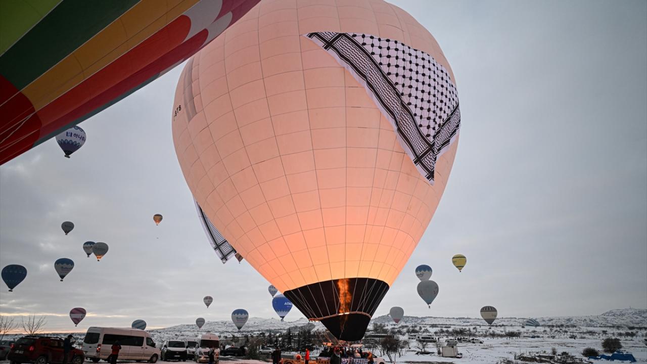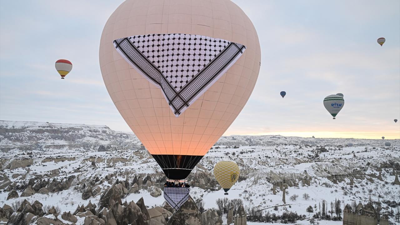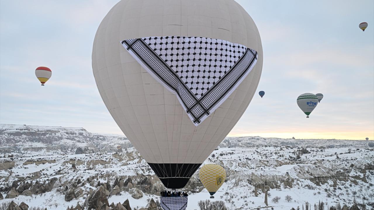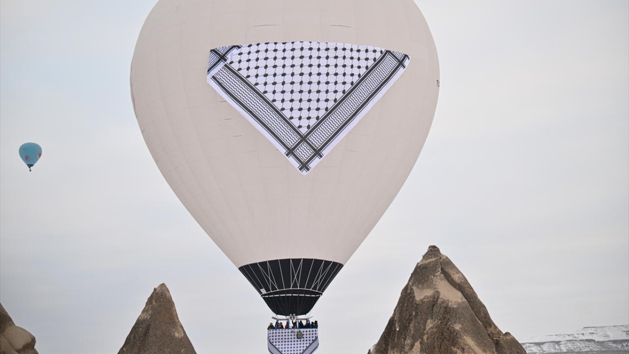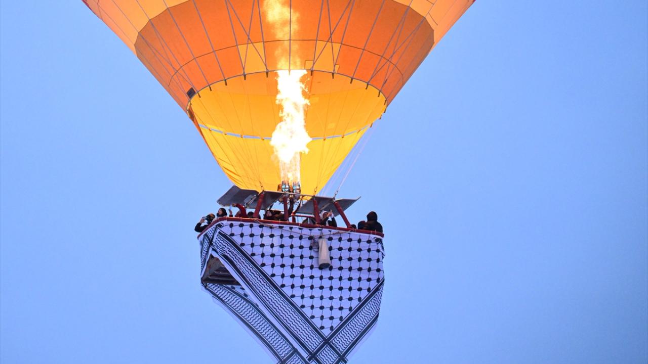 Gazze'de yaşanan soykırım Kapadokya'da özgürlüğü simgeleyen kefiye desenli sıcak hava balonlarıyla protesto edildi.