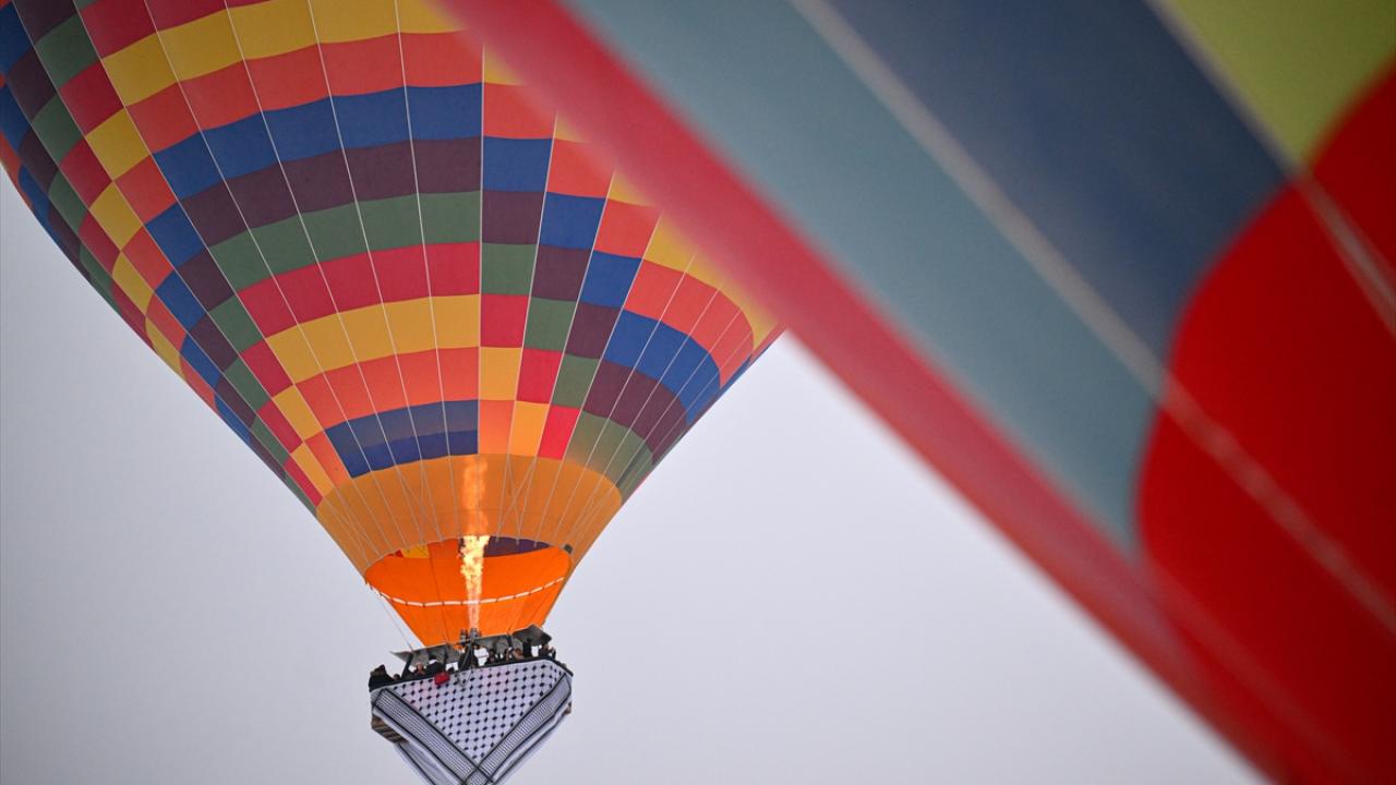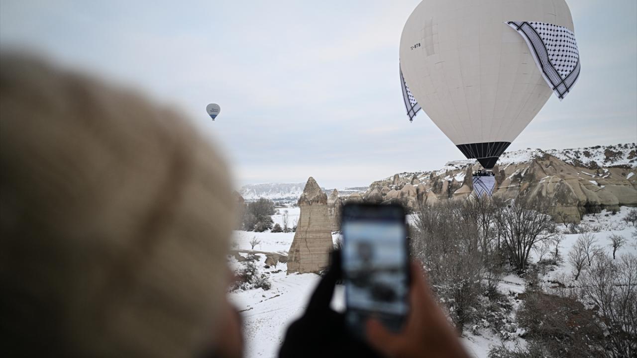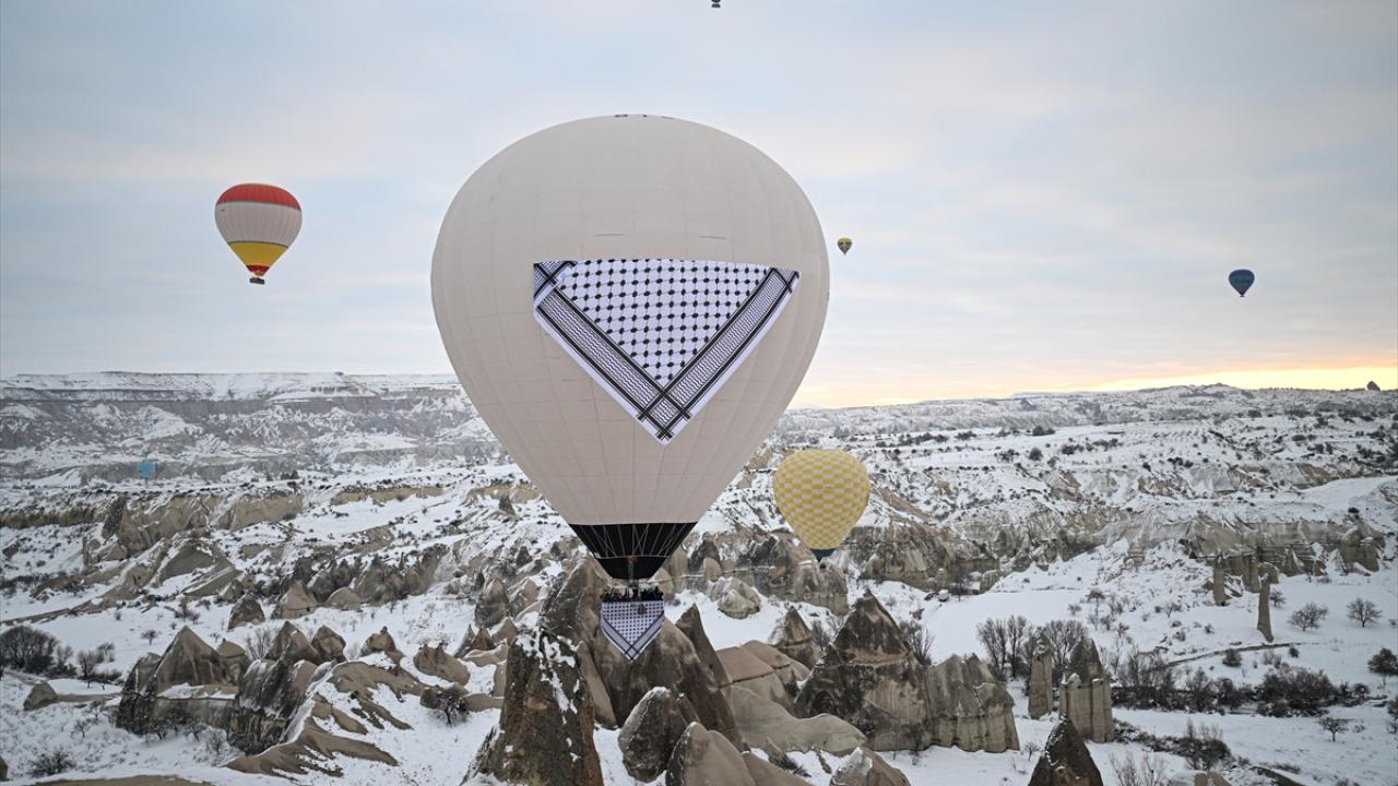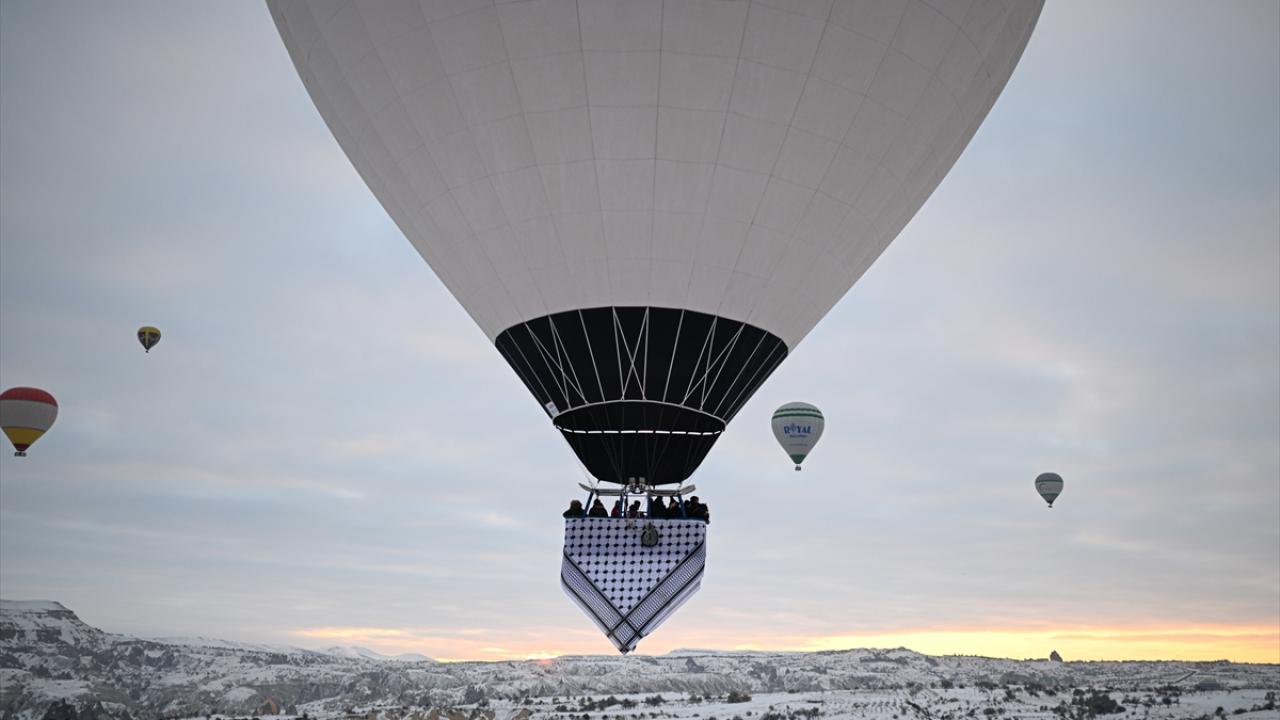 Gazze'de yaşanan soykırım Kapadokya'da özgürlüğü simgeleyen kefiye desenli sıcak hava balonlarıyla protesto edildi.