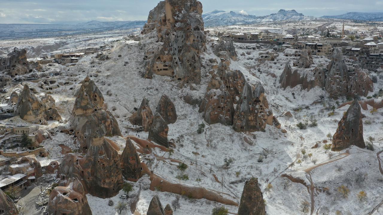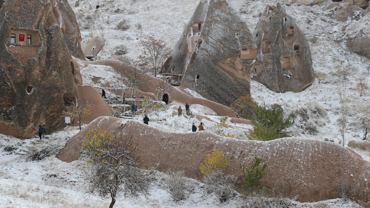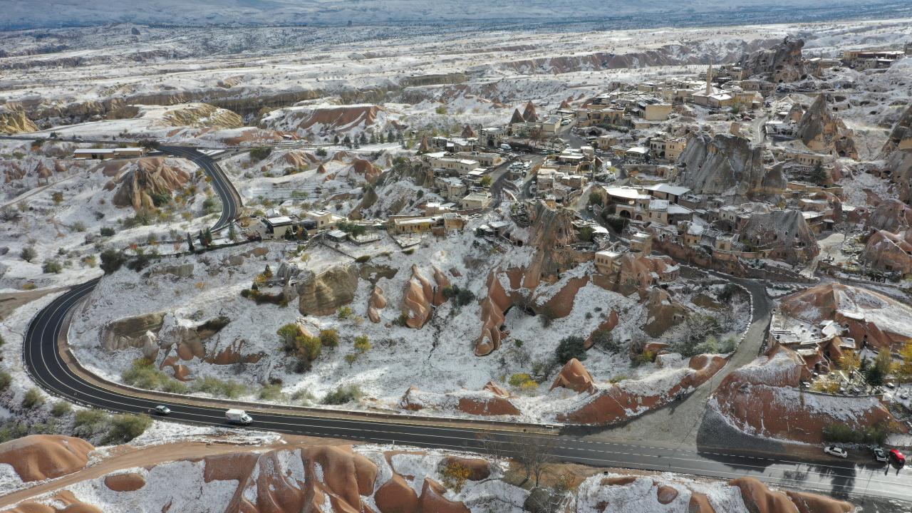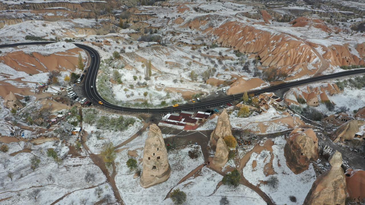 Yaklaşık 3 saat süren kar yağışının ardından UNESCO Dünya Mirasları Listesindeki Kapadokya`da peribacaları ve doğal kaya oluşumlu vadiler, kar yağışının ardından karla kaplandı.