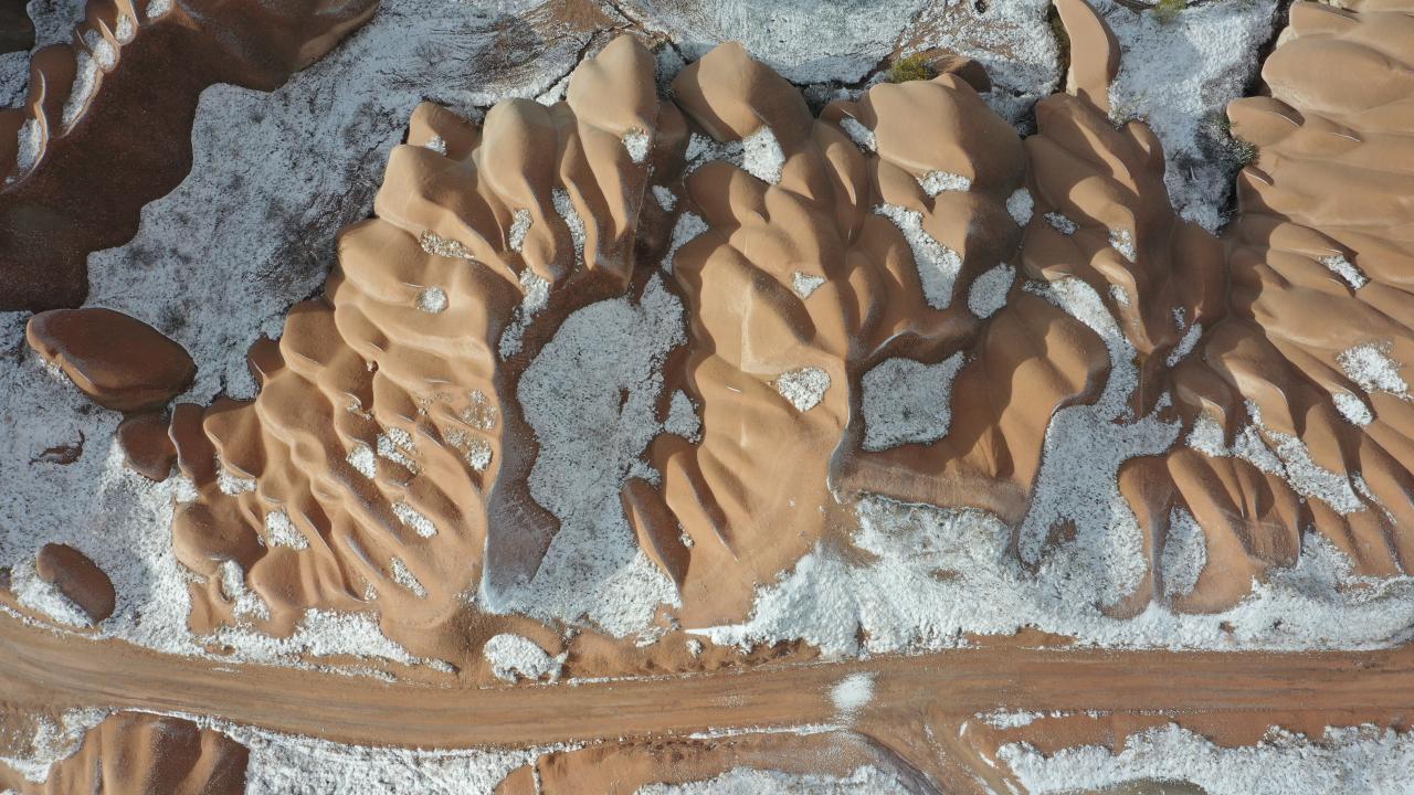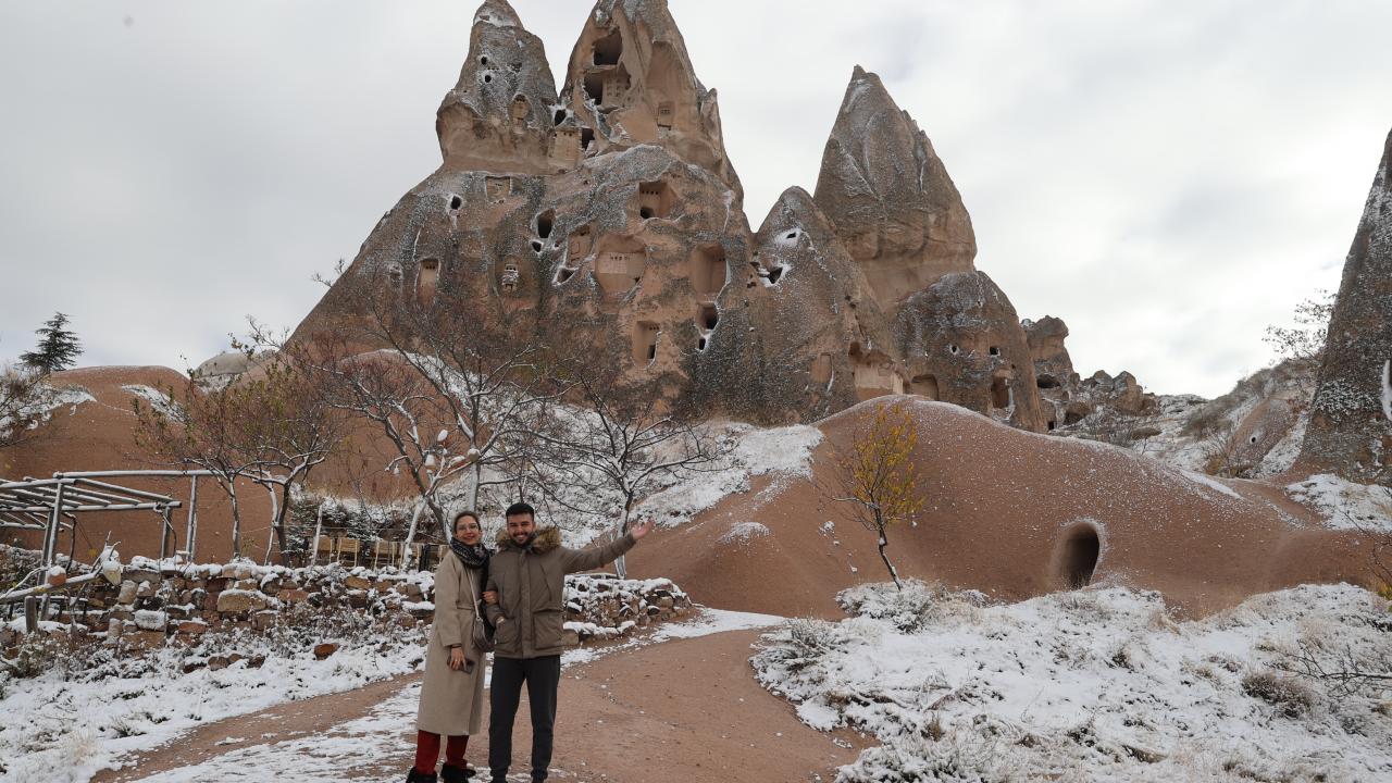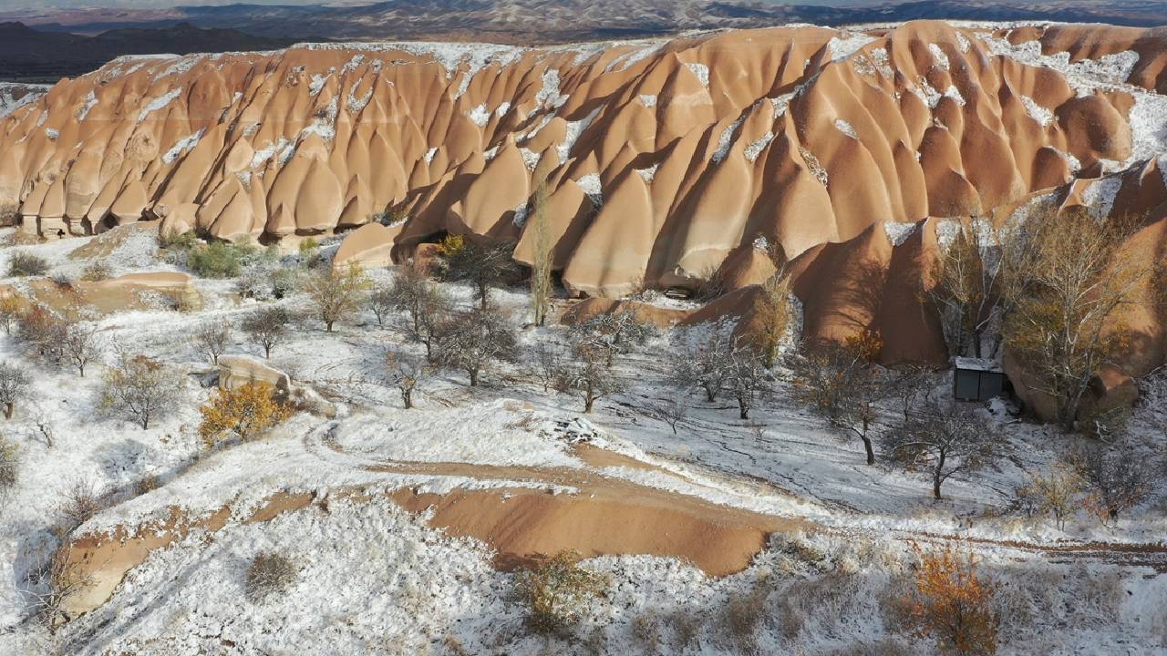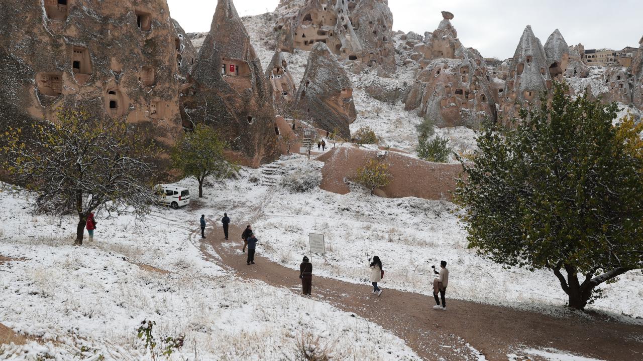 Yaklaşık 3 saat süren kar yağışının ardından UNESCO Dünya Mirasları Listesindeki Kapadokya`da peribacaları ve doğal kaya oluşumlu vadiler, kar yağışının ardından karla kaplandı.