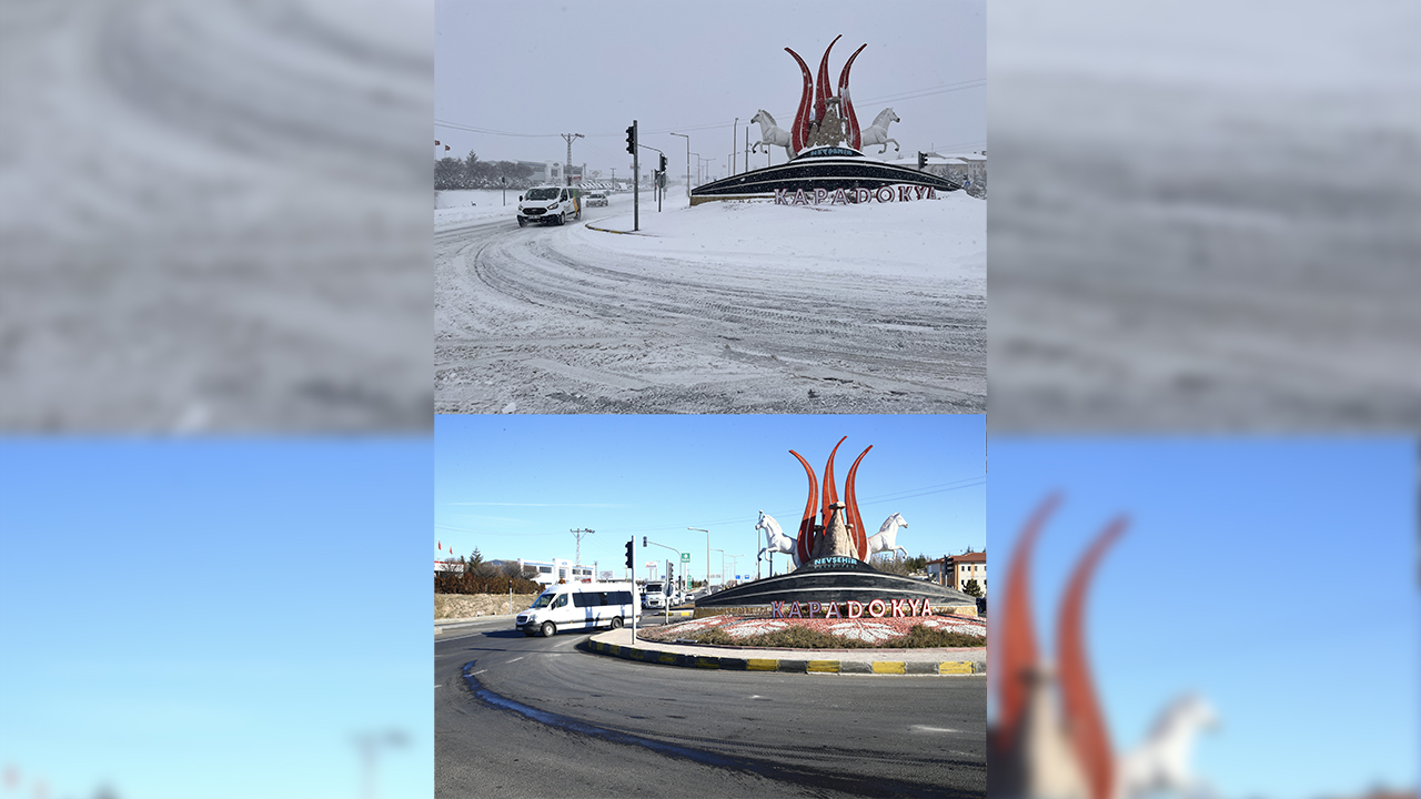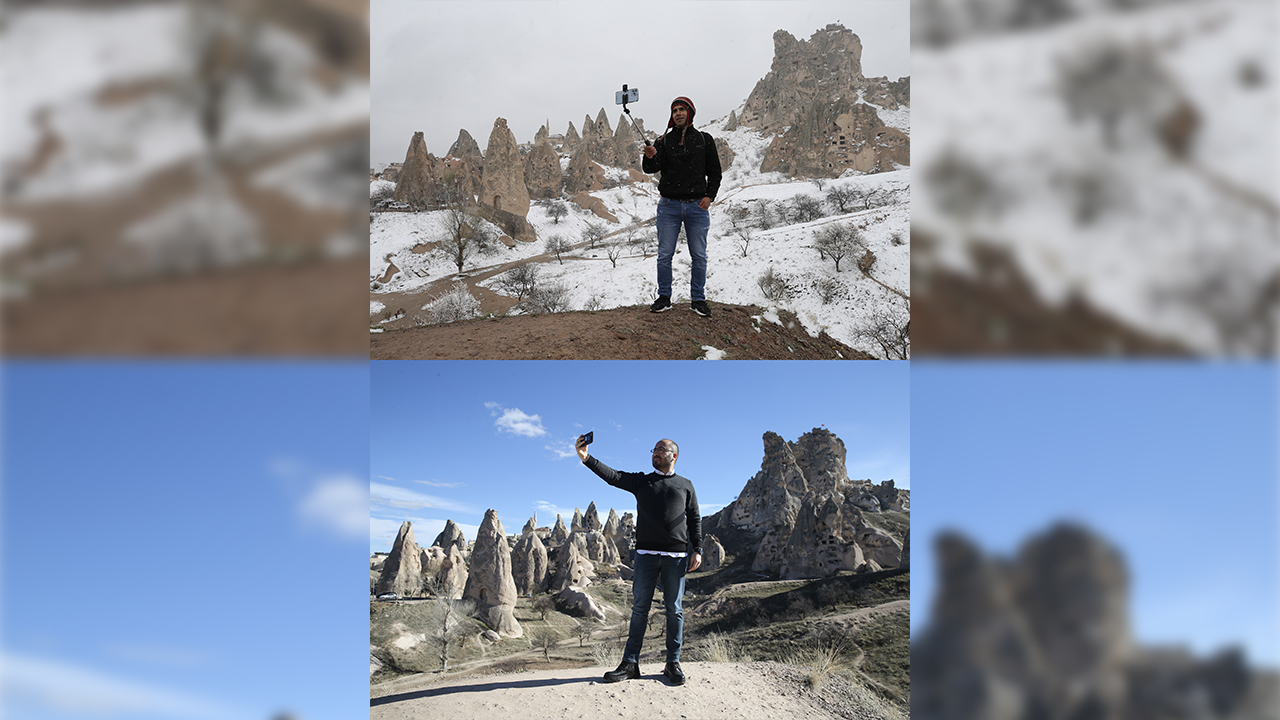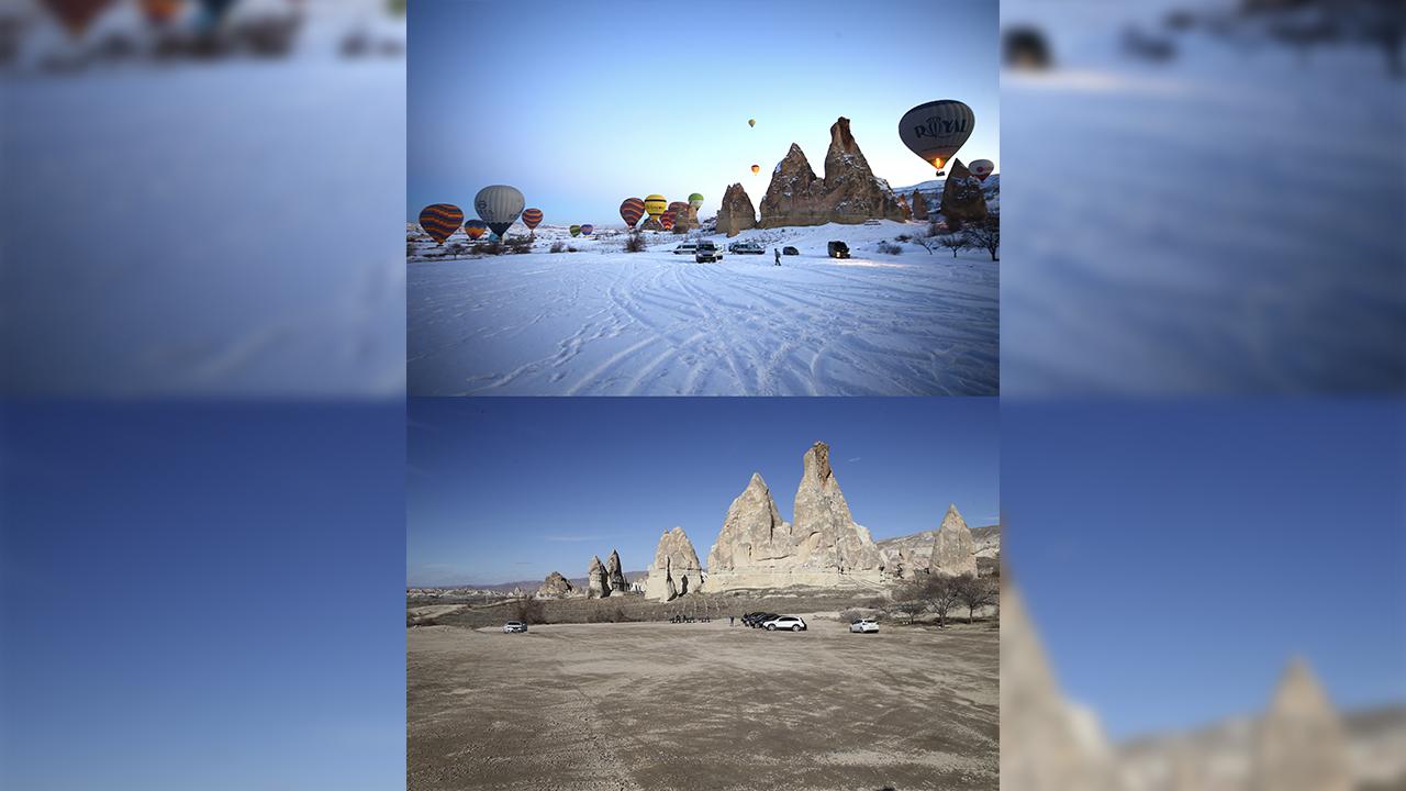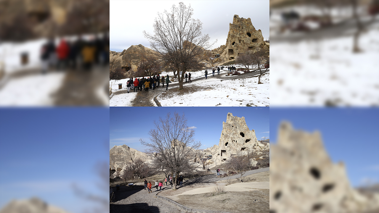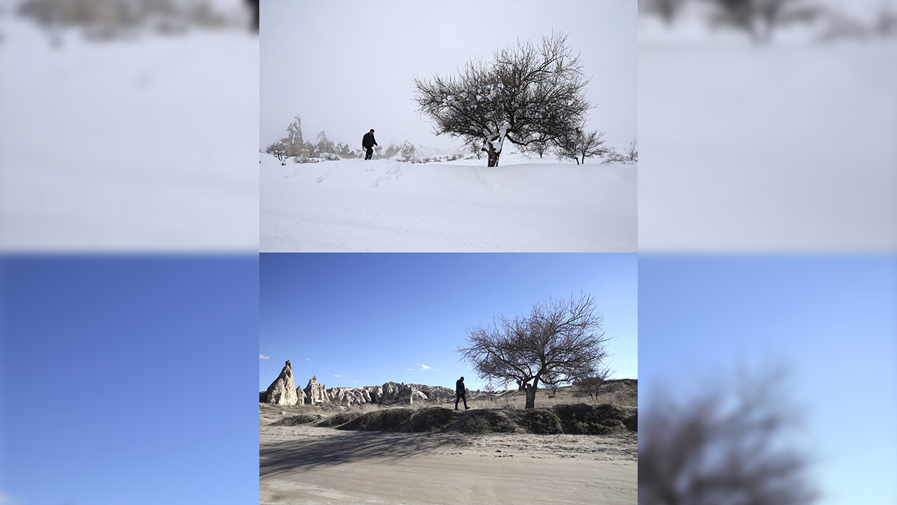 Kapadokya`da peribacaları ve doğal kaya oluşumlarıyla kaplı vadilerde, geçen kış ile bu yıl aynı noktalardan çekilen fotoğraf ve görüntüler bölgedeki kuraklığı gözler önüne seriyor.