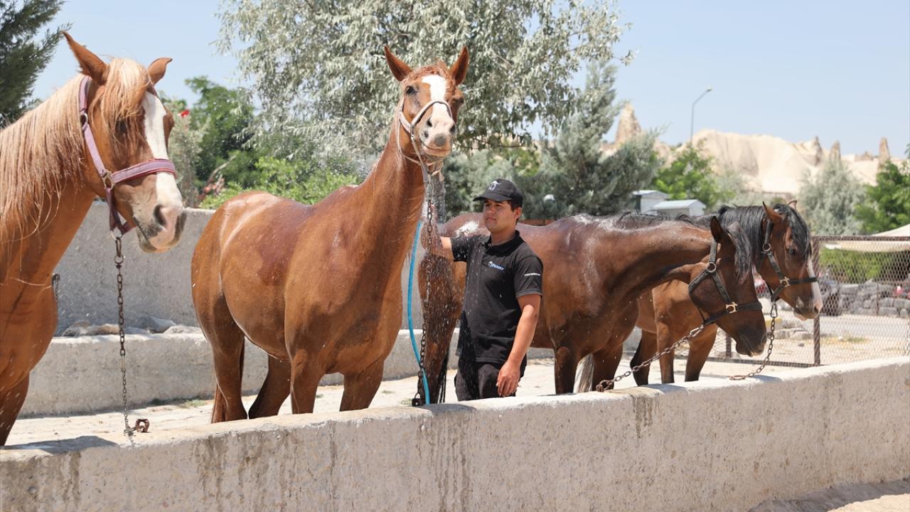 Kapadokya'ya gelen turistler, aşırı sıcaklardan dolayı özellikle öğle vaktinde otel odalarında dinlenmeyi tercih ederken, tur aktivitelerinde kullanılan atlar da suyla serinletiliyor.
