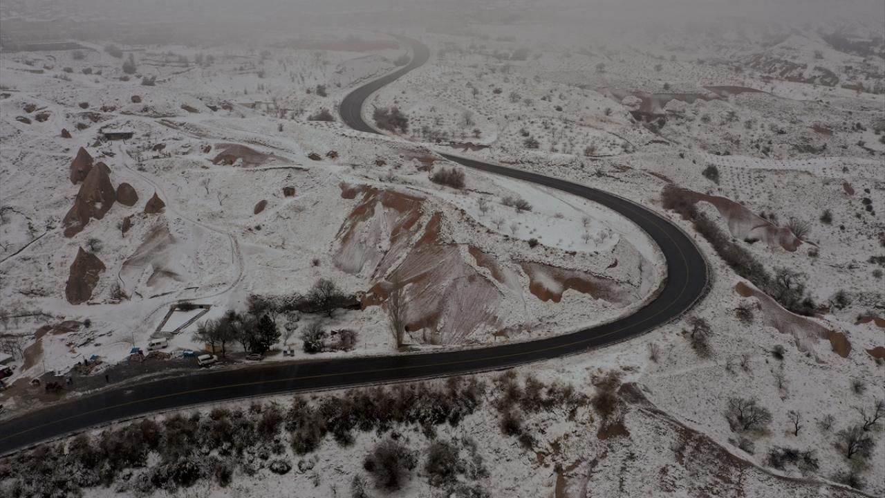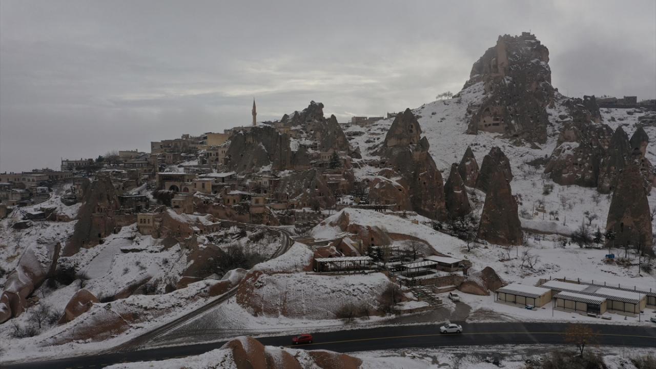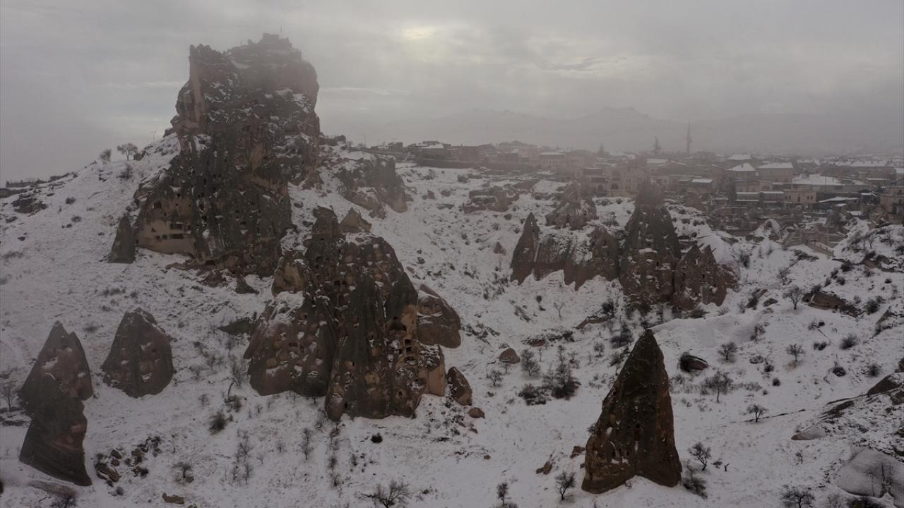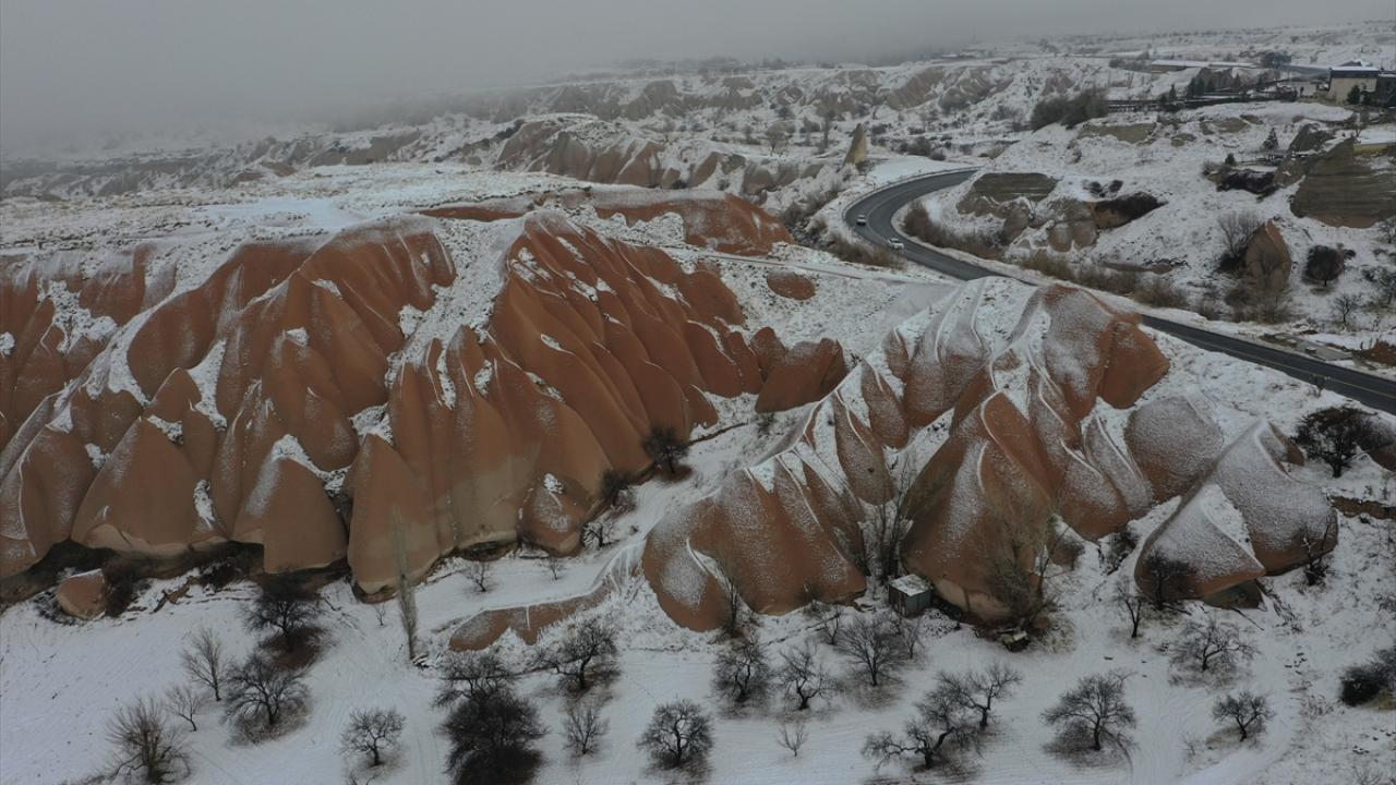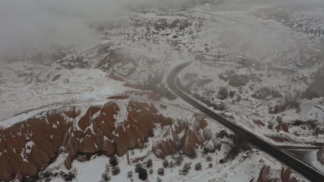 Nevşehir'in dünyaca ünlü turizm bölgelerinden Kapadokya'da, beyaza bürünen peribacaları, kar yağışının ardından etkili olan sis ile bütünleşince ortaya güzel görüntüler çıktı.