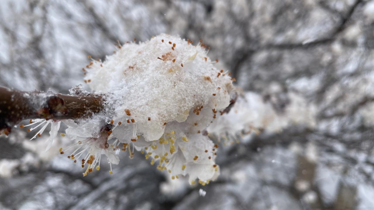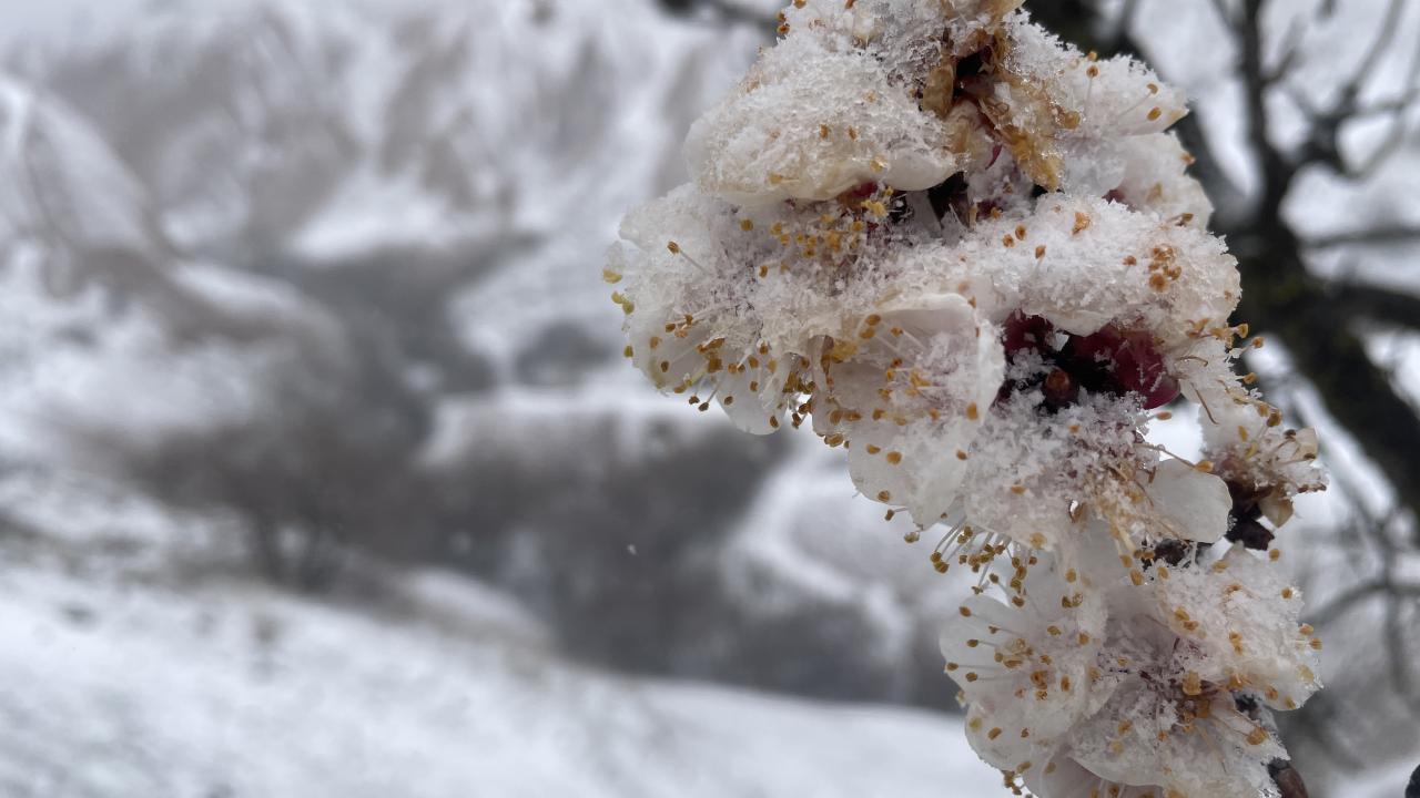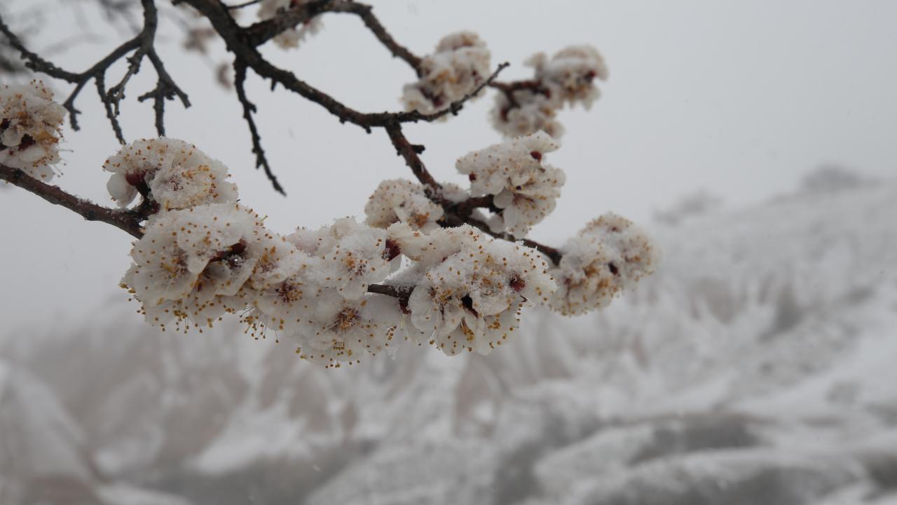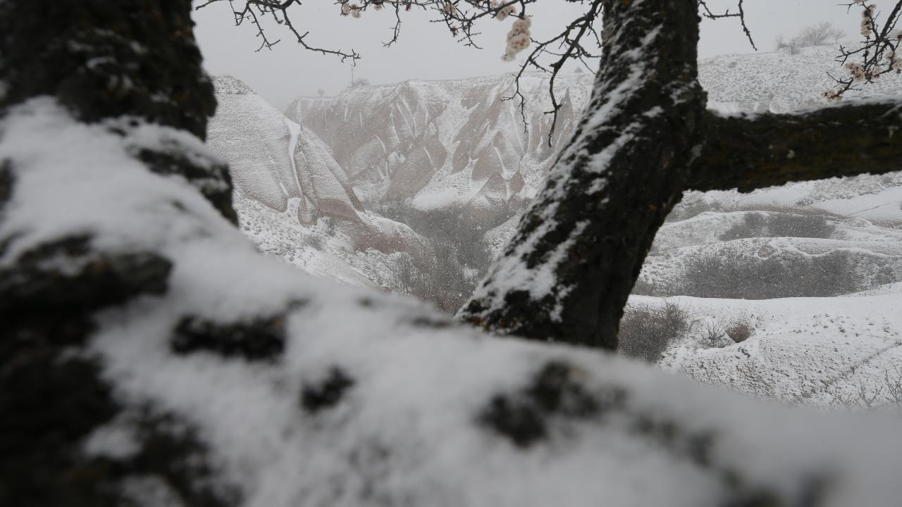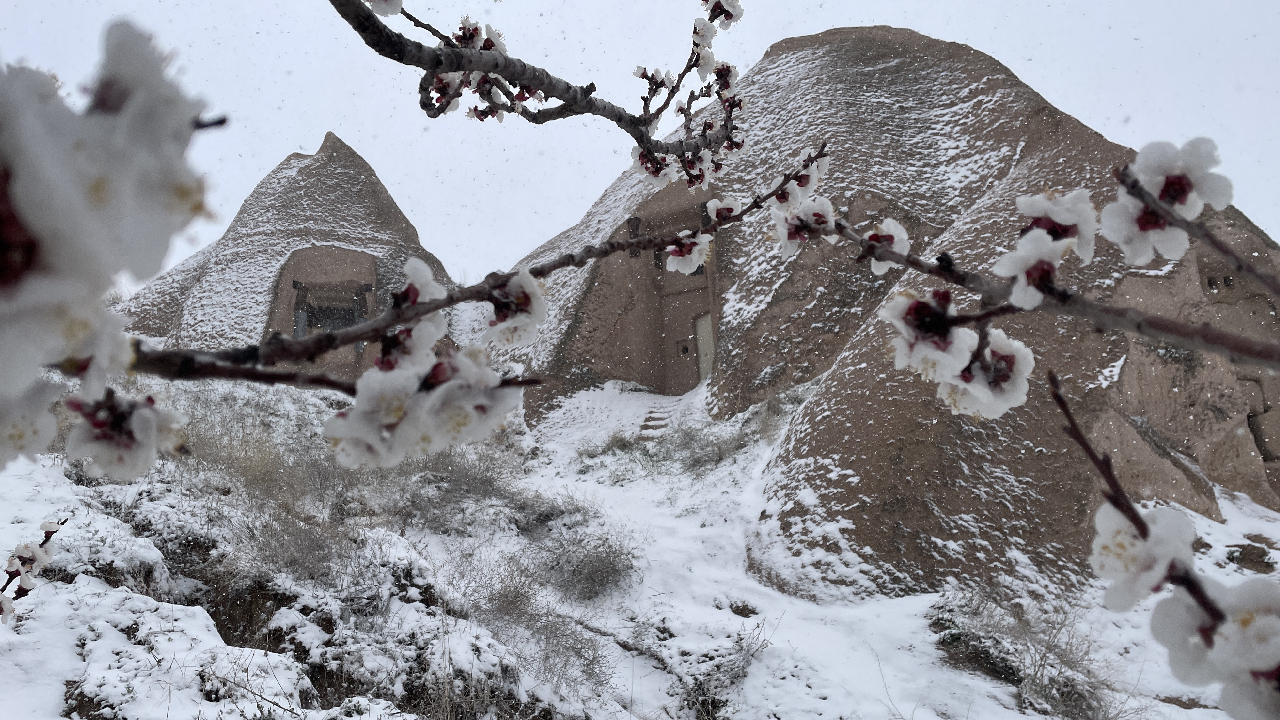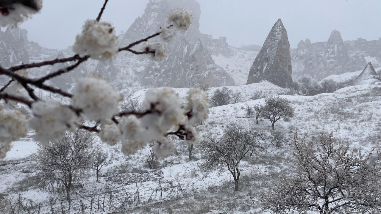 İlkbaharın gelişiyle açan çiçekler ile kar, Kapadokya`nın manzarasına farklı bir görünüm kattı.