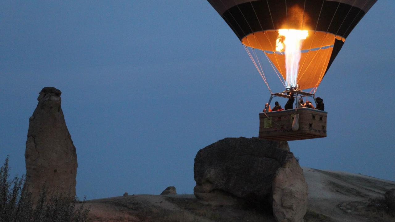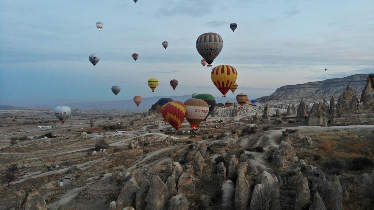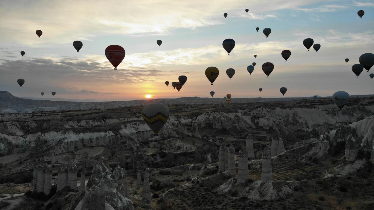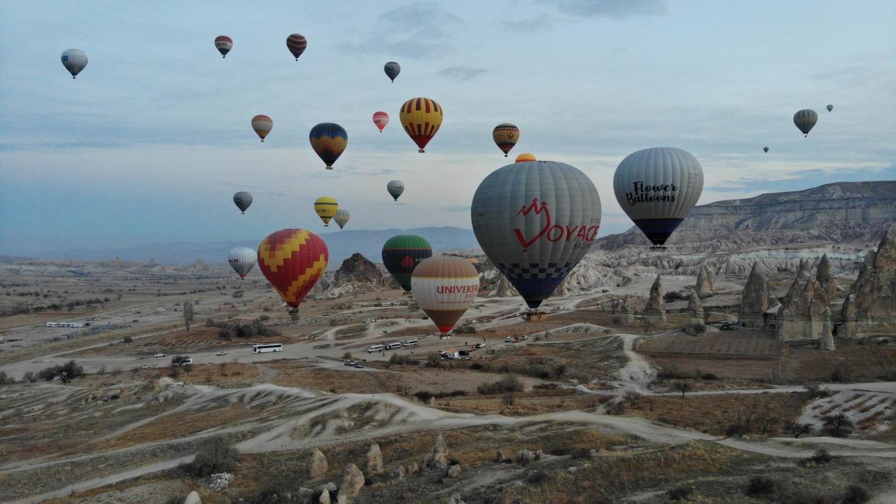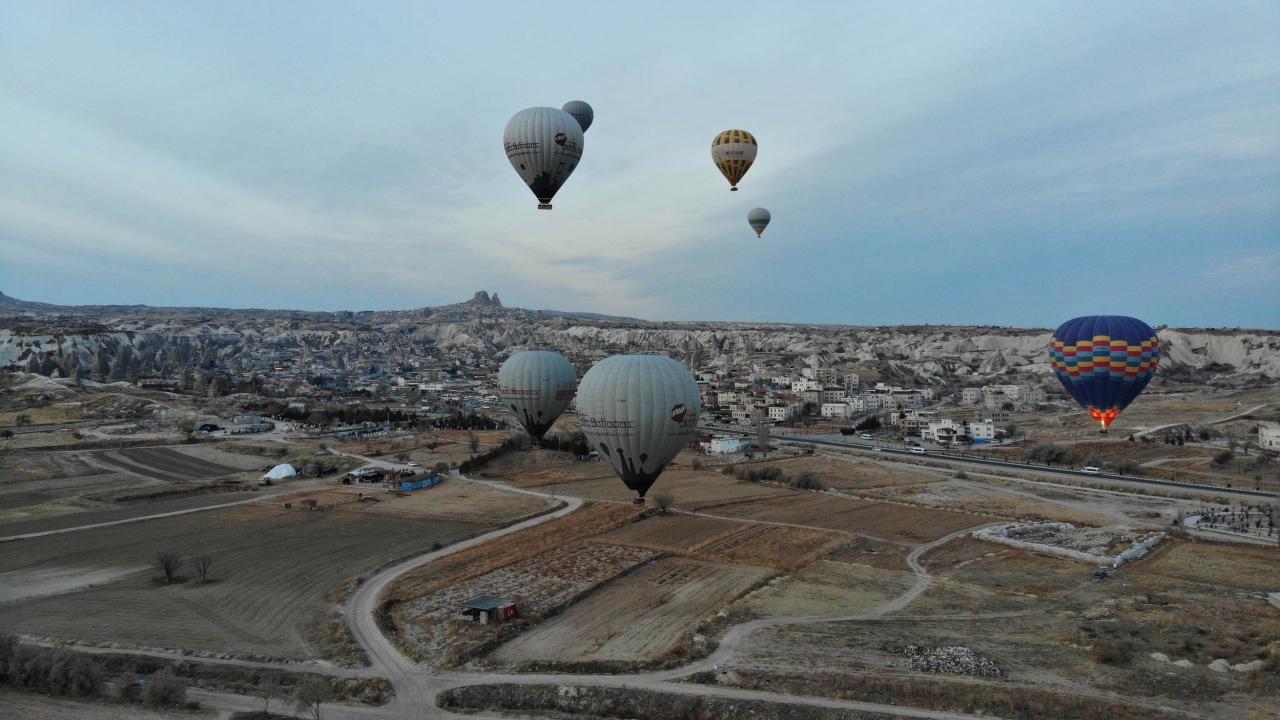 Türkiye’nin önemli turizm merkezlerinden Kapadokya bölgesinde sabahın ilk ışıklarıyla birlikte sıcak hava balonları yeni yılın ilk uçuşunu gerçekleştirdi.