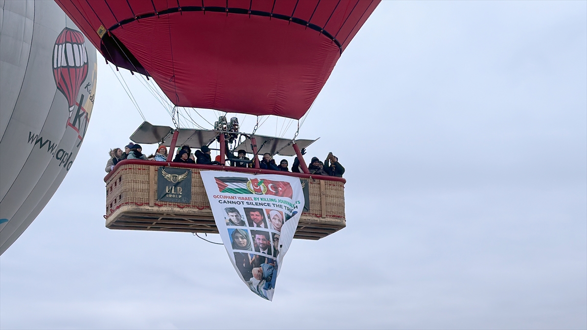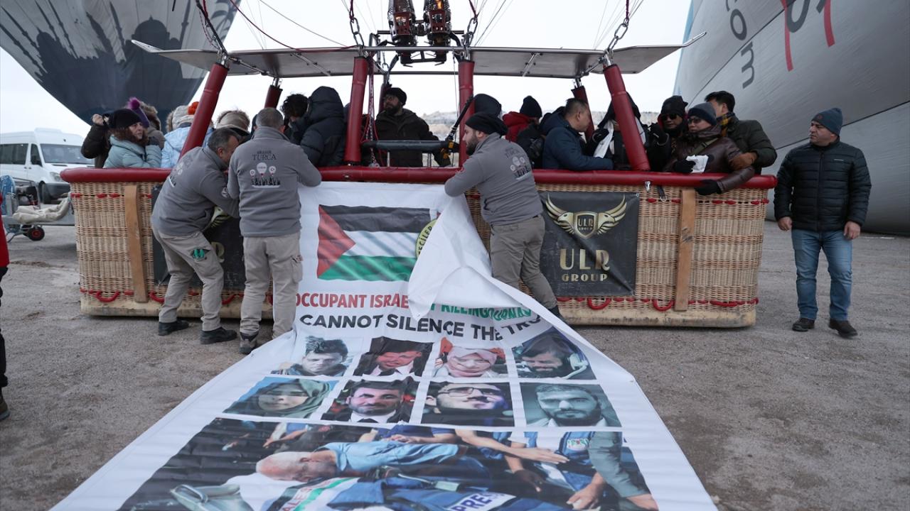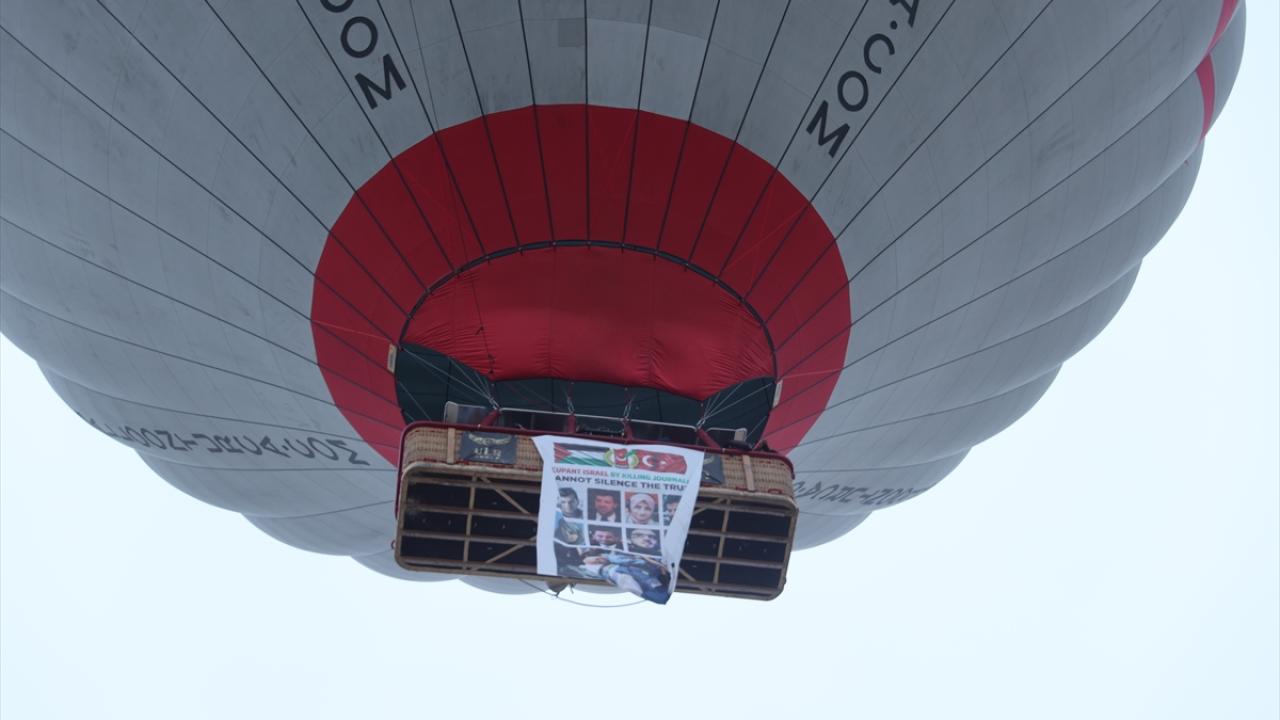 Kapadokya'da sıcak hava balonu, İsrail'in Gazze Şeridi'ne düzenlediği saldırılarda hayatını kaybeden gazetecilerden bazılarının fotoğraflarının bulunduğu afişle havalandı.