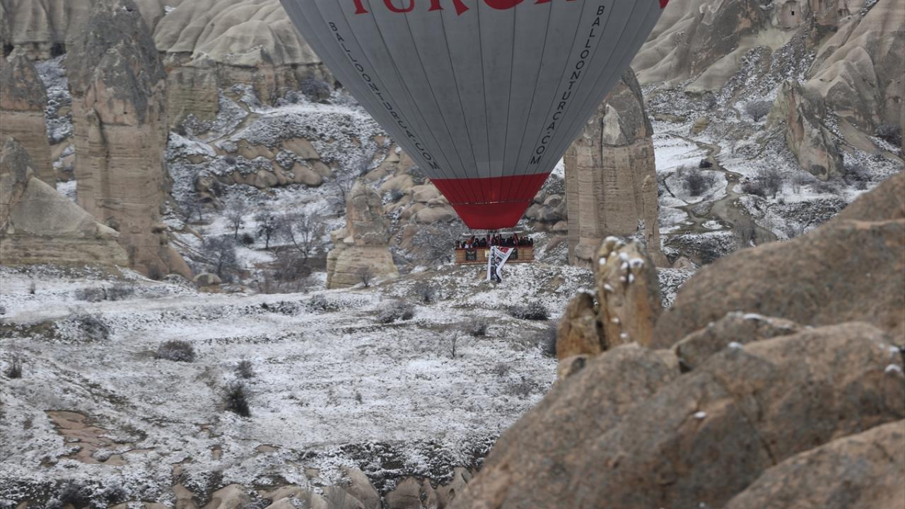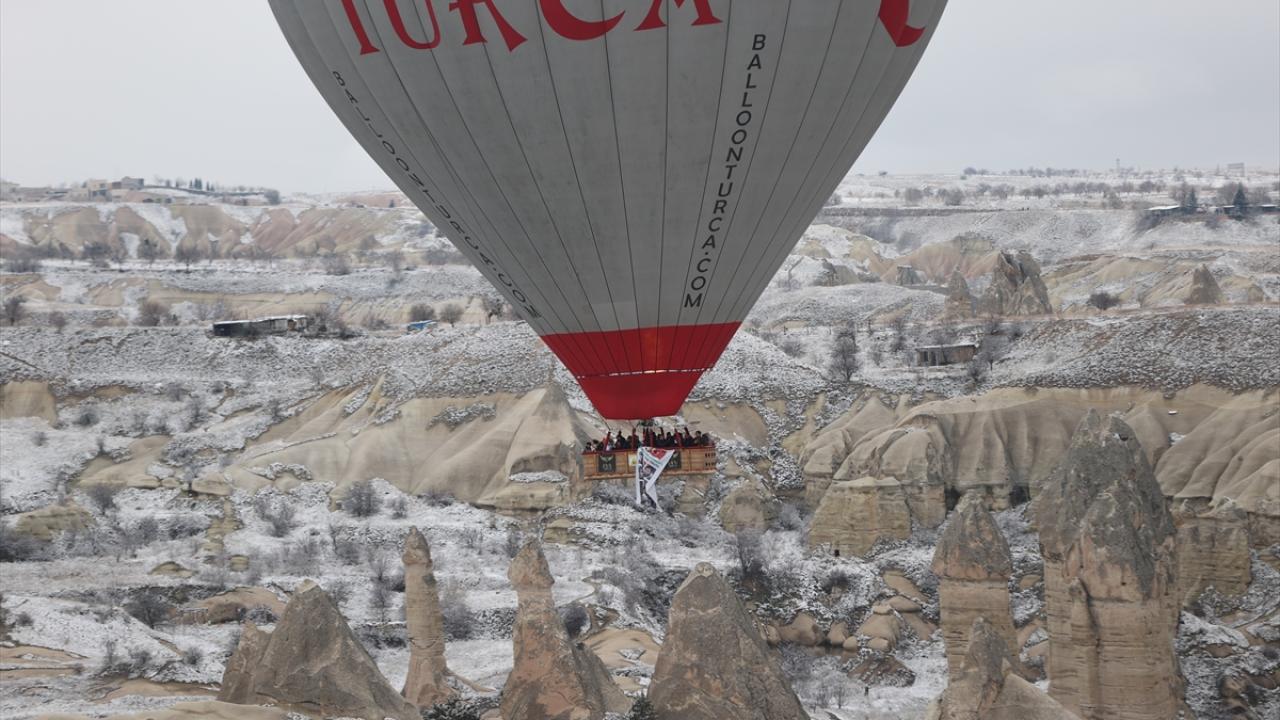 Sıcak hava balonu, sepetine asılı afiş ve pankartla peribacalarıyla kaplı vadiler üzerinde bir süre uçuş gerçekleştirdi.