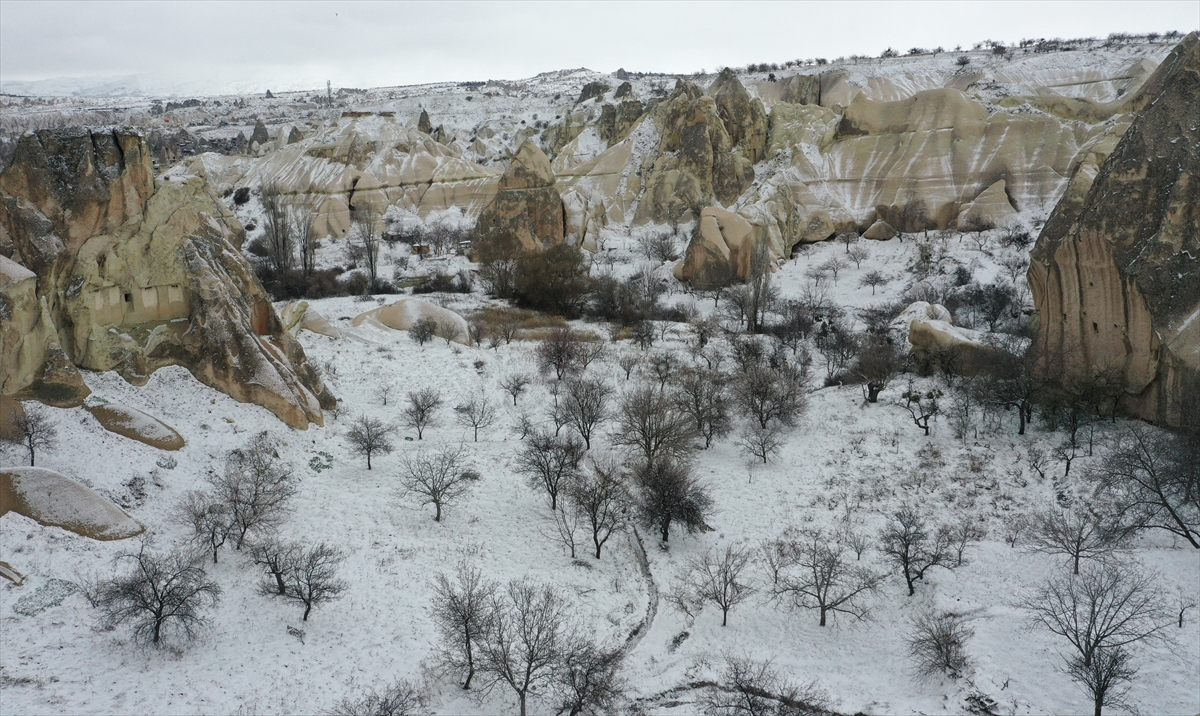 UNESCO Dünya Mirası Listesi`nde yer alan bölgedeki Uçhisar Kalesi çevresi ile Kılıçlar ve Güllüdere vadilerindeki peribacaları ve doğal kaya oluşumları çiçekler ve karla bütünleşerek ilgi çekici görüntüler oluşturdu.