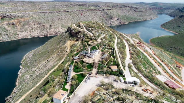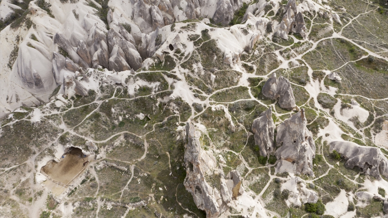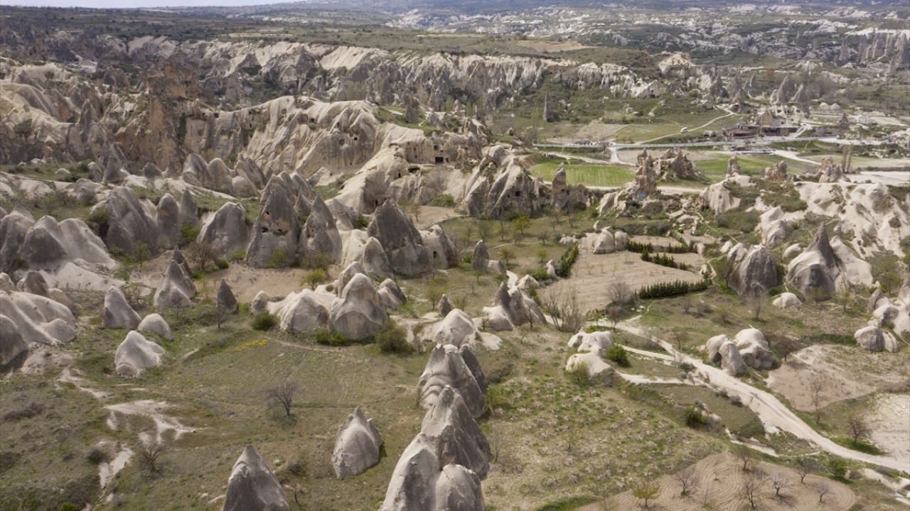 Kış aylarında kar yağışı ile beyaza, sonbaharda sarının tonlarına bürünen Kapadokya`da, ilkbaharda doğanın sunduğu manzara, drone ile gökyüzünden görüntülendi.