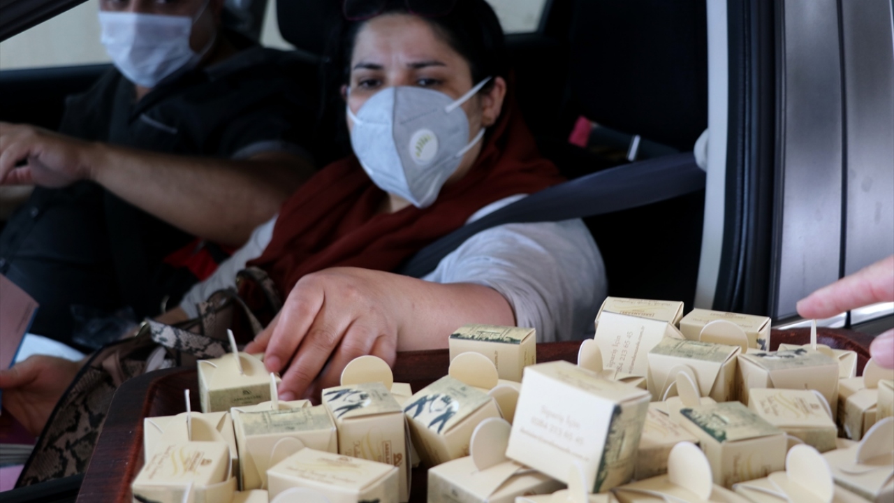 "Maske, mesafe ve hijyen diyoruz. Önce kolonya tutuyoruz gurbetçilerimize. Kapalı su ve tek tek paketlenmiş tatlılarımızı dezenfekte ettikten sonra misafirlerimize sunuyoruz" diye konuştu.