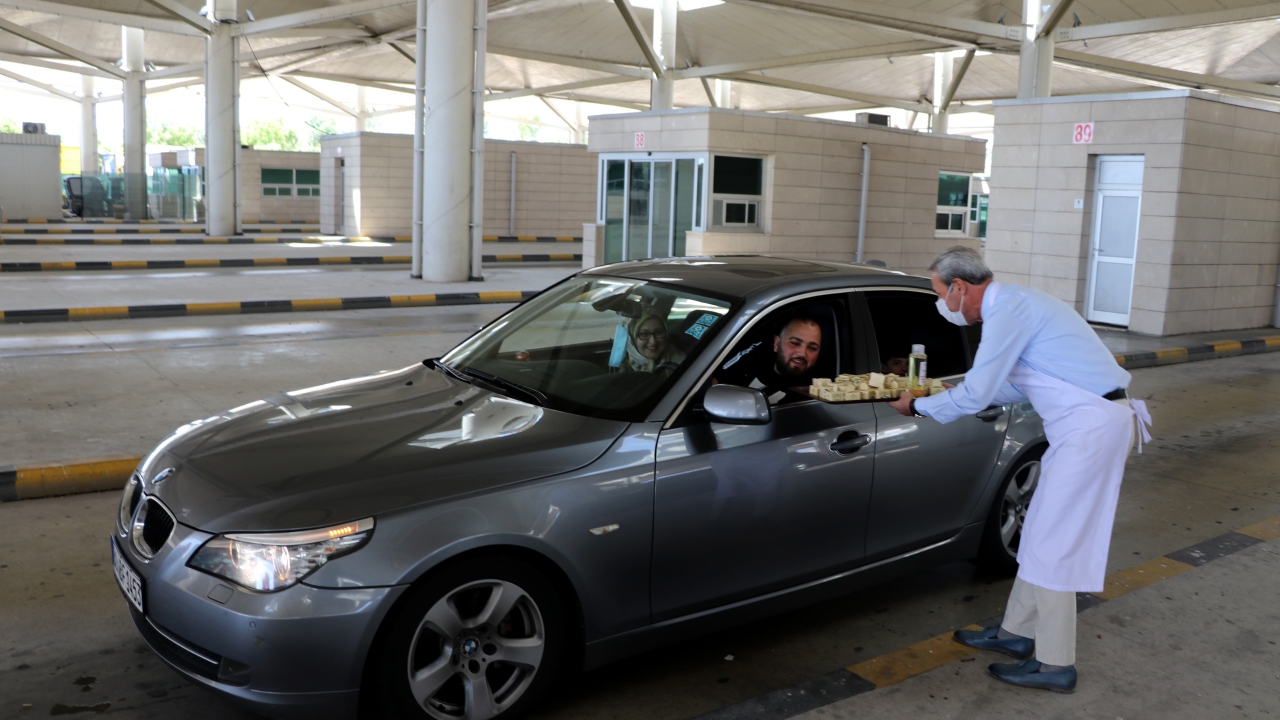 Türkiye giriş yapan gurbetçilere esnaf tarafından badem ezmesi ikram edildi, kolonya tutuldu.