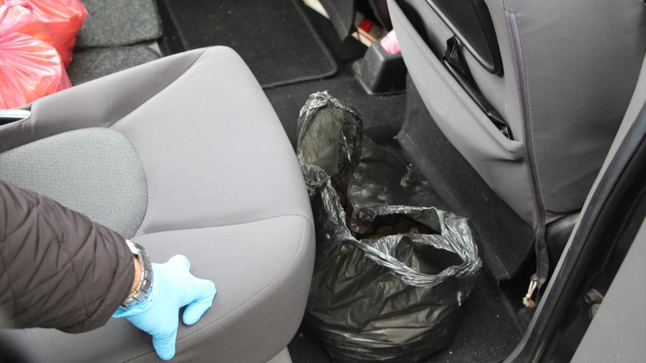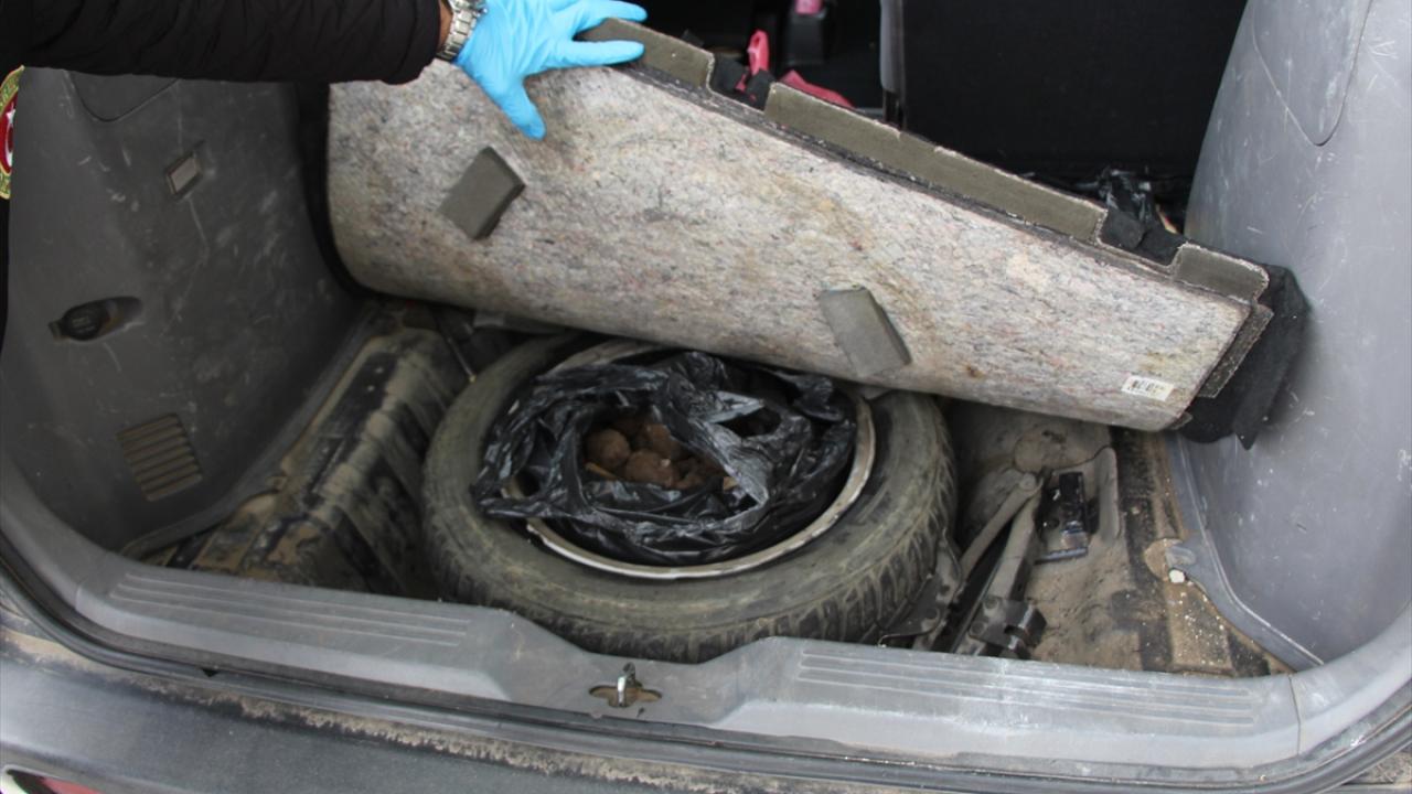 Şüpheli yoğunluklar olduğu tespit edilen araç, dedektör köpek "Fokus" kullanılarak detaylı arandı. Yapılan ayrıntılı kontrollerde aracın stepne boşluğunda ve yolcu koltuğunun ön kısmındaki poşetlerde 12 kilogram trüf mantarı bulundu.
