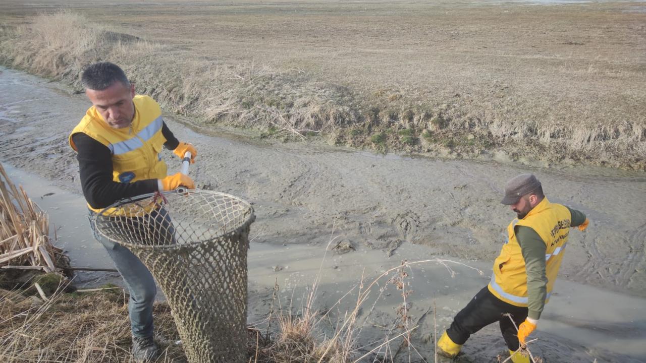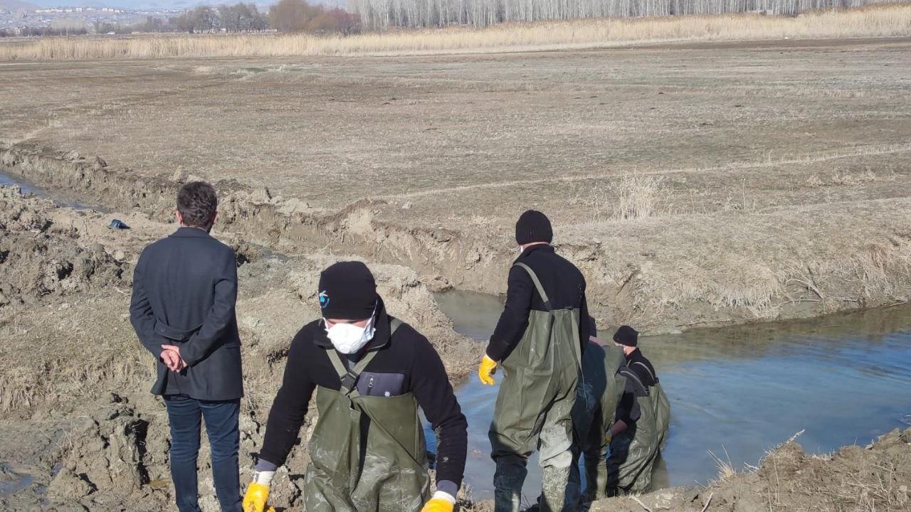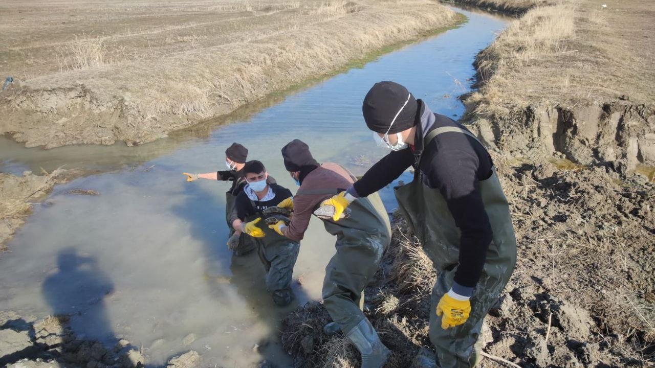 Van'da, kurumaya yüz tutan derelerde ıslah çalışması yapan ekipler, kanaldan taşan suda su kaplumbağası gördü. Su kaplumbağası sedyeler ile sulak alana taşındı.