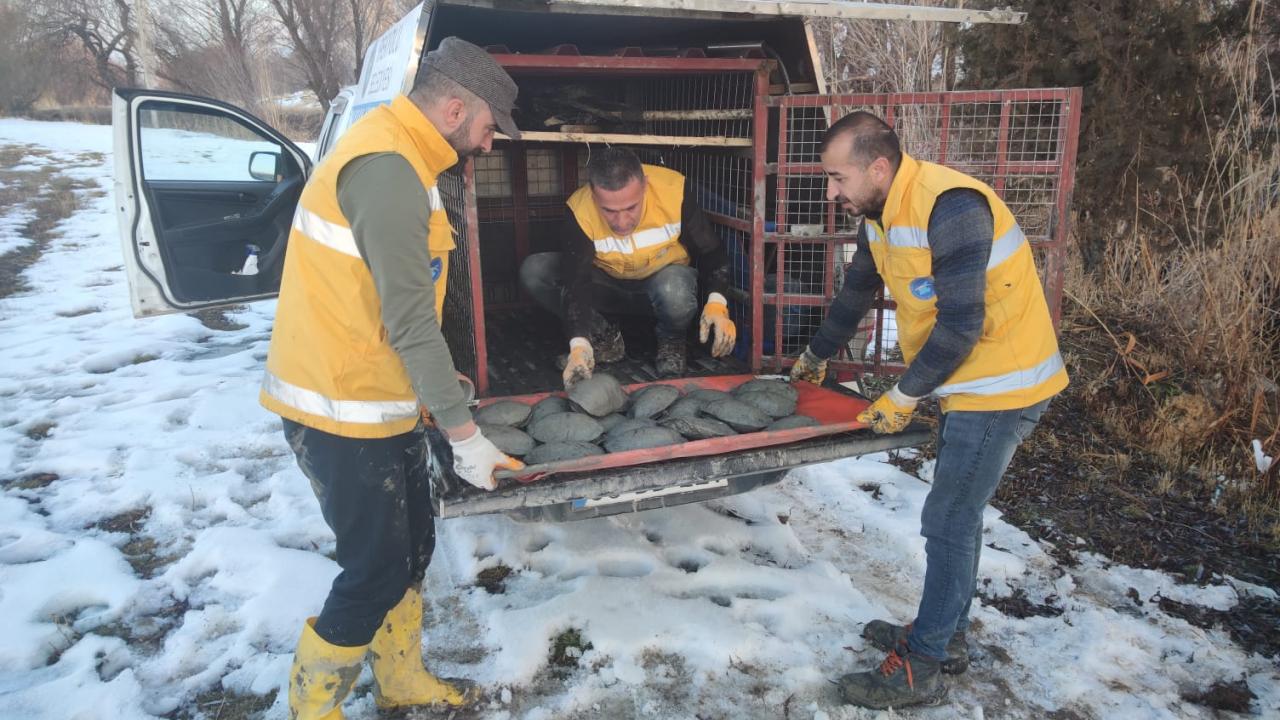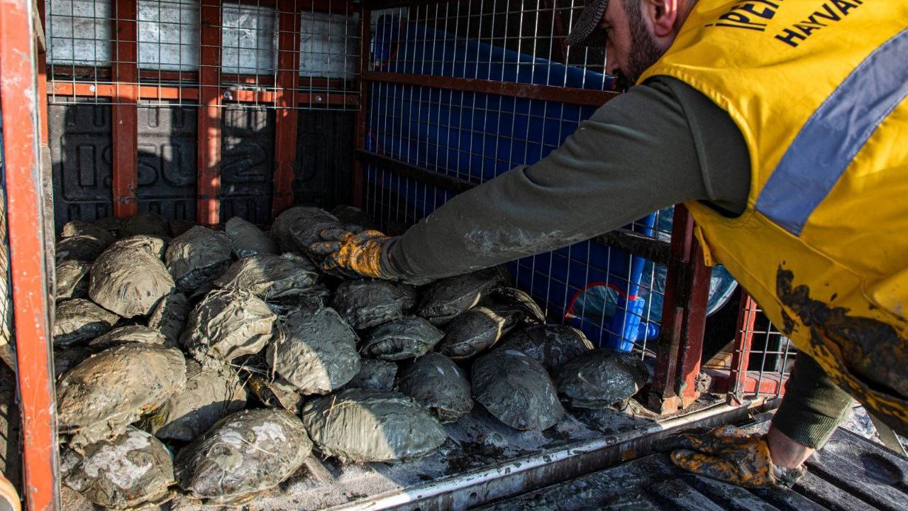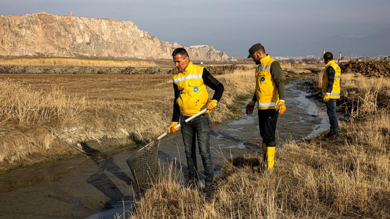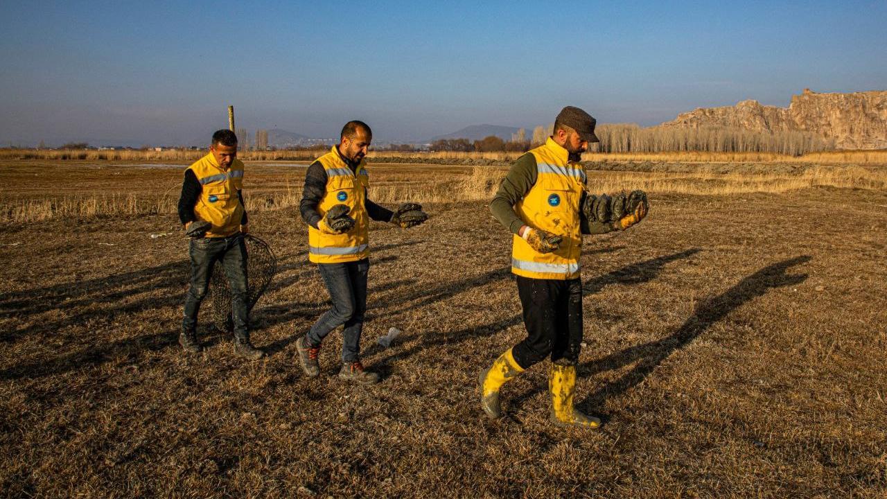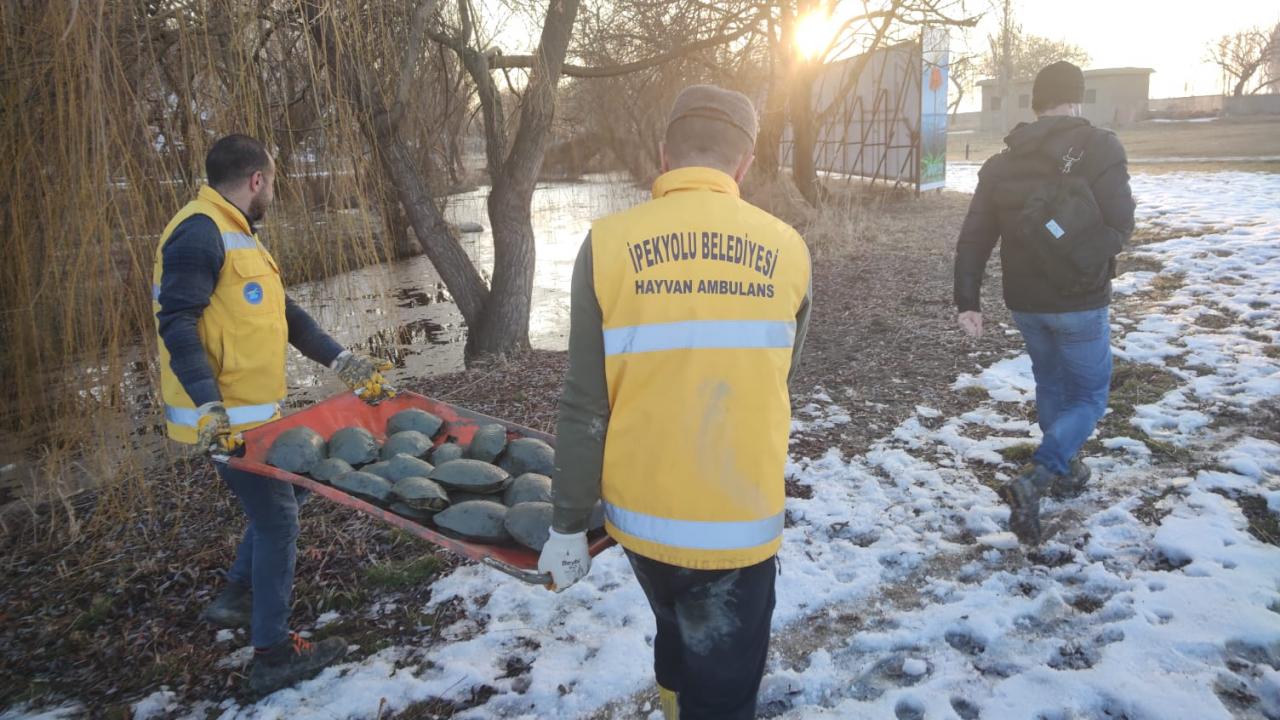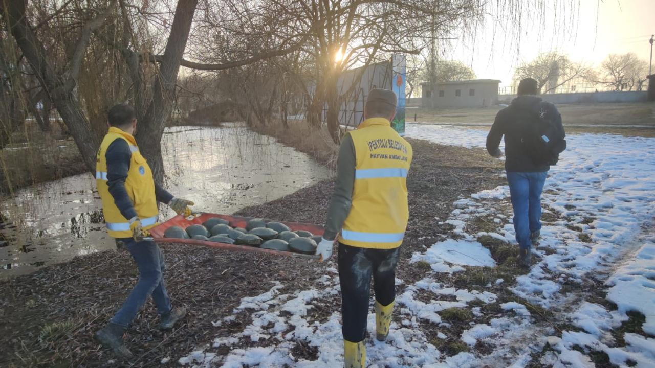 Bölgeye gelen görevlilerle ekiplerin saatlerce yaptığı detaylı incelemede bulunan onlarca su kaplumbağası da sedyeler ile Van Kalesi çevresinde yer alan ve daha önce ıslahı yapılan sulak alana taşındı.