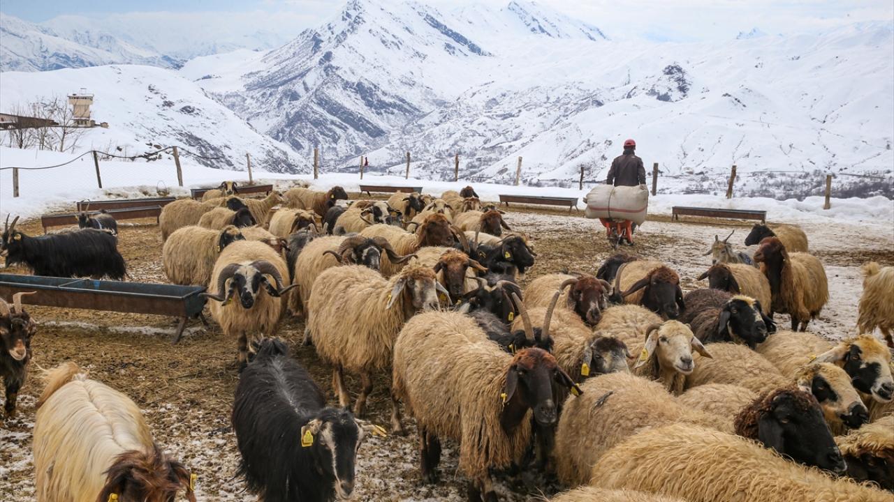 Yeni doğan kuzuların bakımını özenle yapan vatandaşlar, küçükbaş hayvanlarını da kar örtüsü üzerinde besliyor.