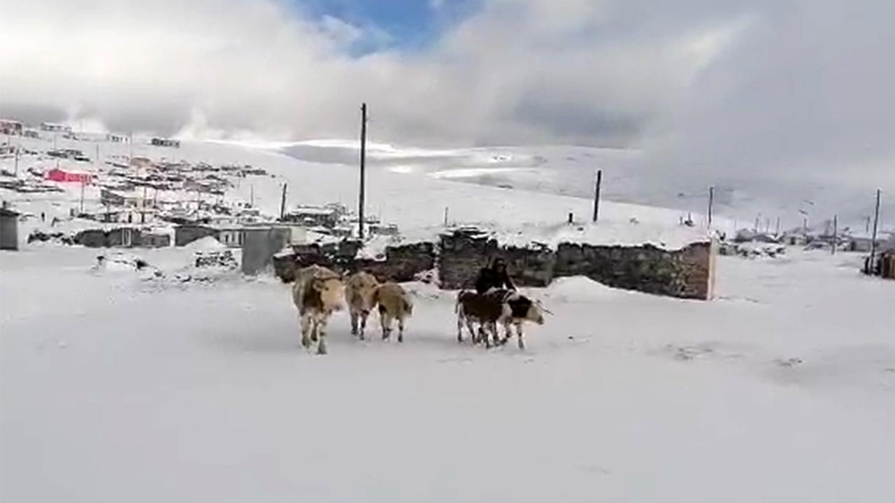 Ardahan’da havaların soğumasıyla birlikte yüksek rakımlı yaylalar beyaza büründü. Yaylalarda besicilik yapan vatandaşlar kar yağışı sonrası büyükbaş hayvanlarını köylere indirmek zorunda kaldı.