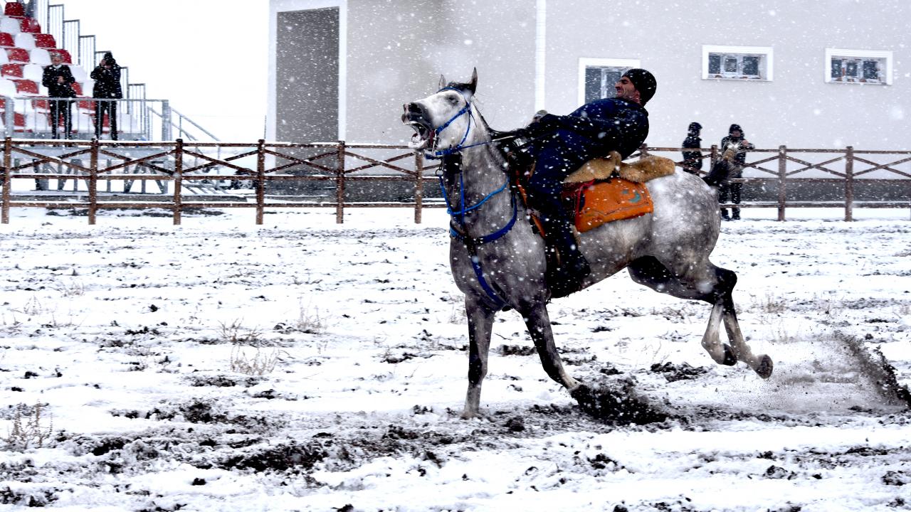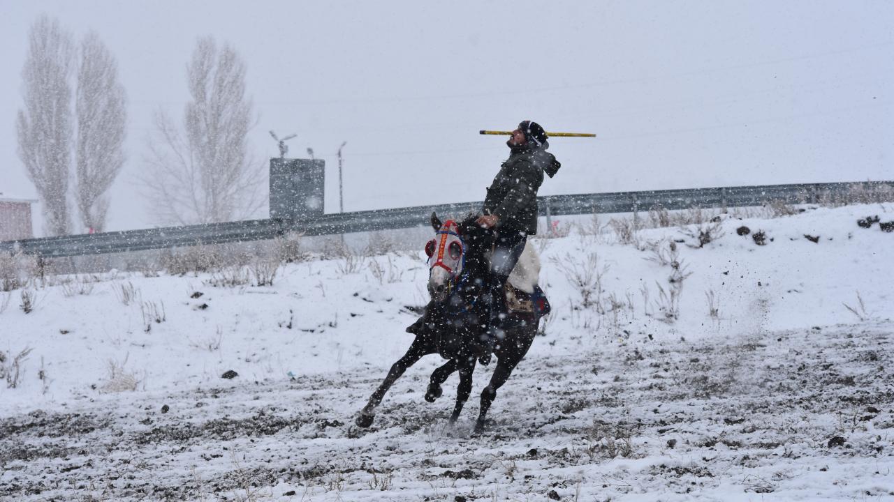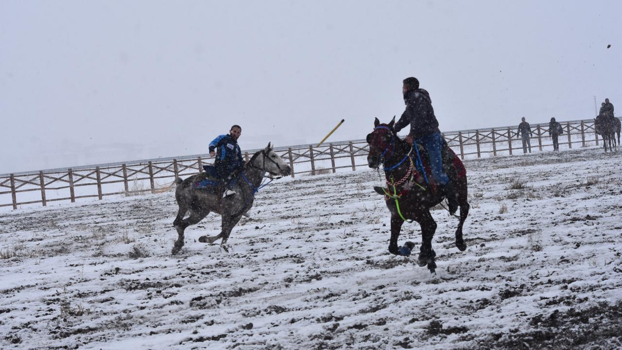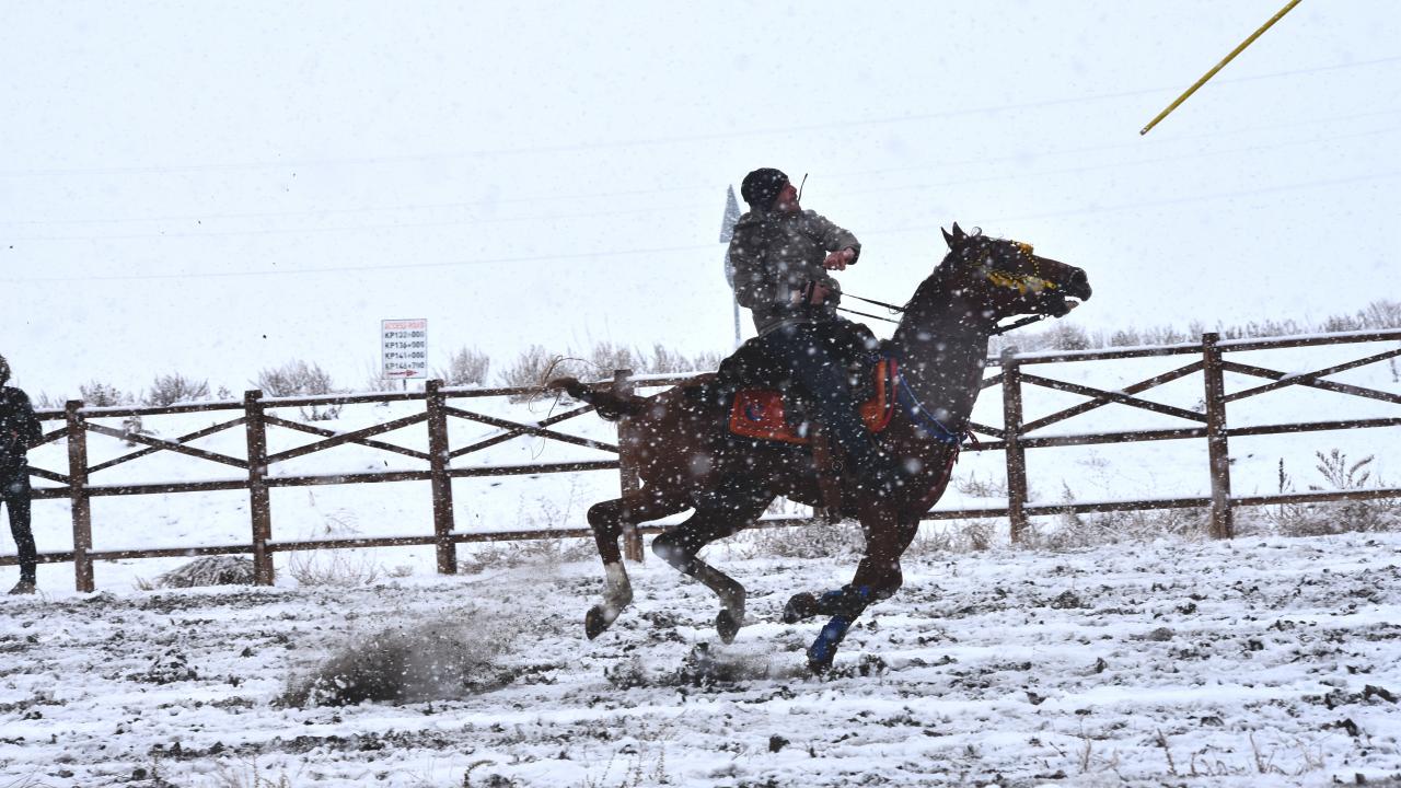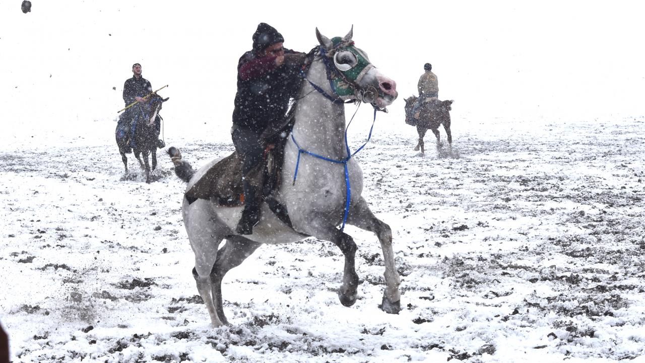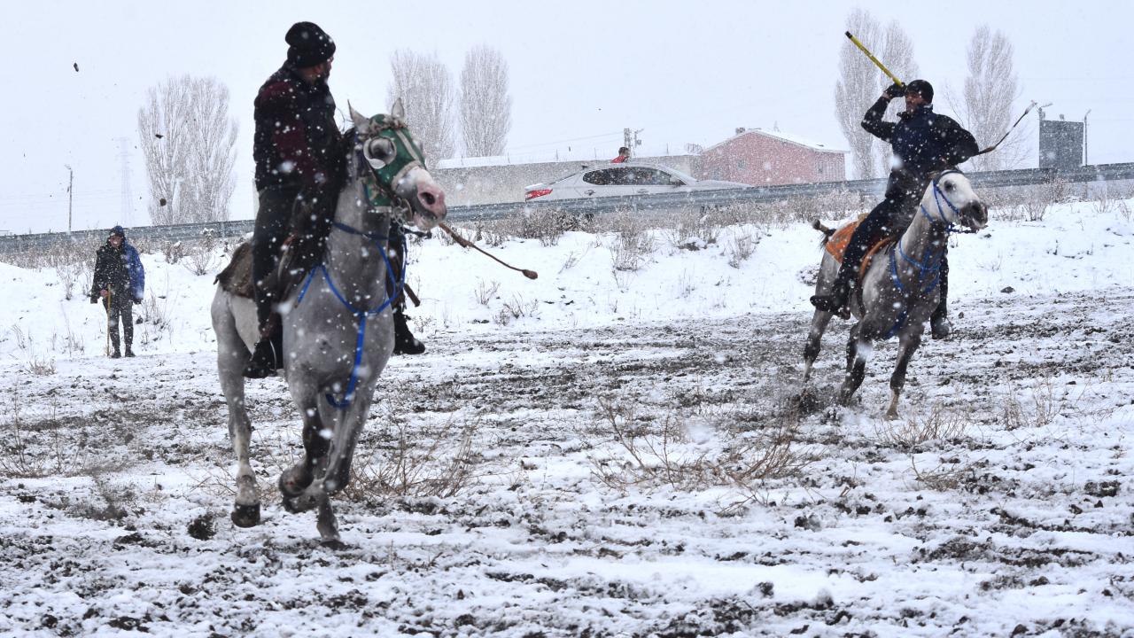 Kars'ta aralıklı yağışlarla etkisini gösteren kar, cirit oynayan köylülerin eğlencesine eğlence kattı. Köylüler kar üstünde at sürmenin tadını çıkardı.