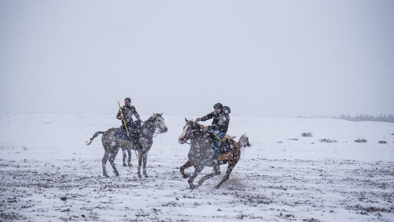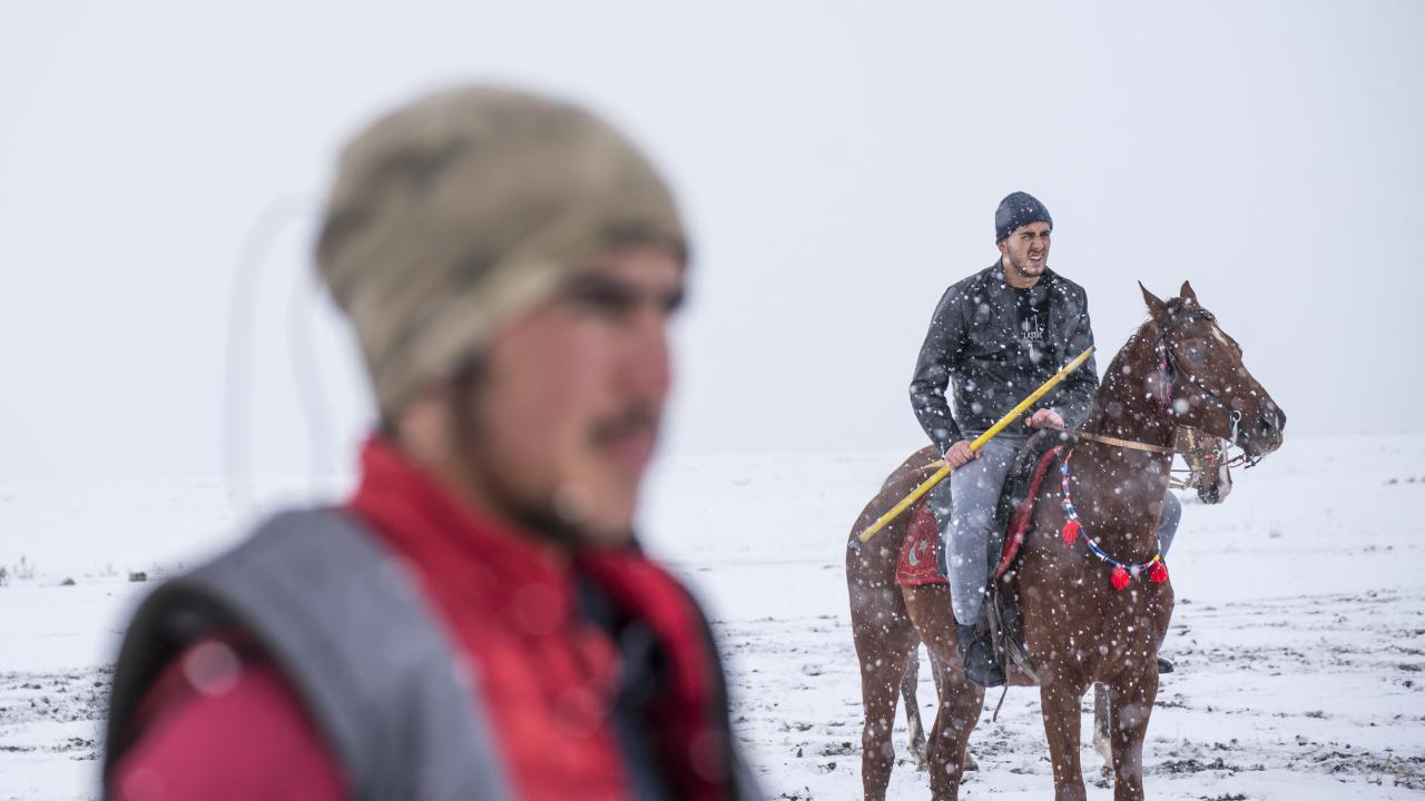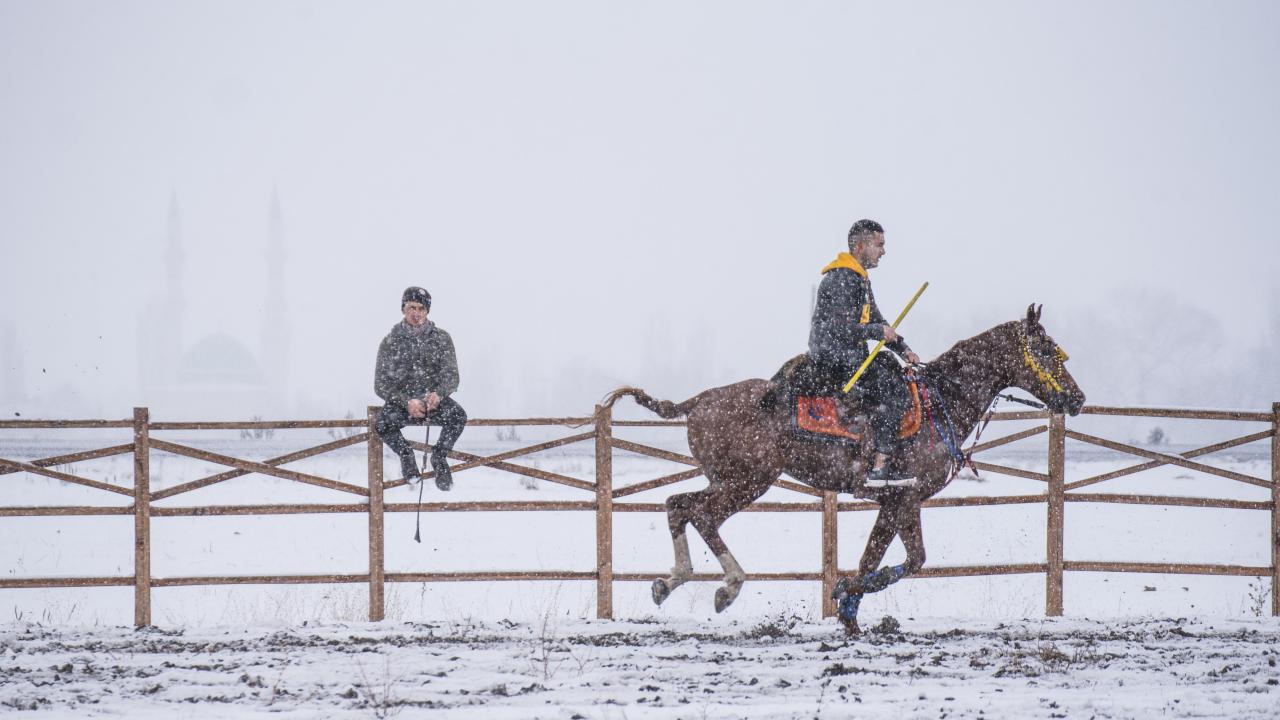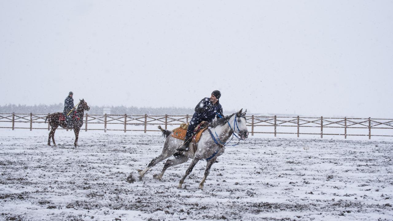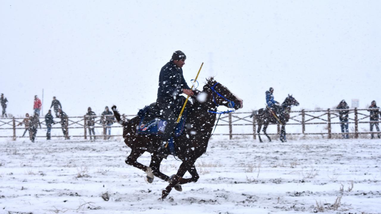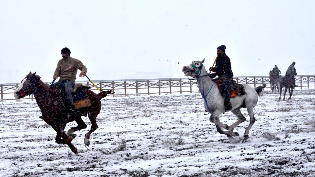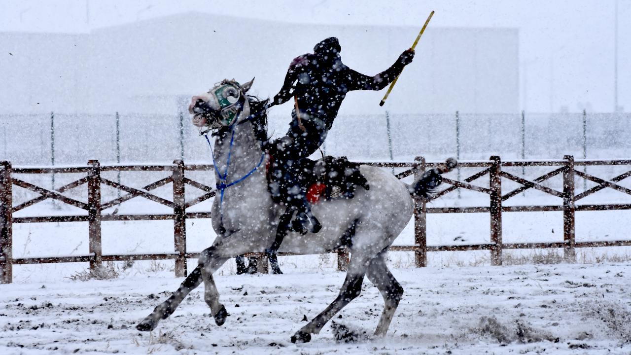 Kars'ta aralıklı yağışlarla etkisini gösteren kar, cirit oynayan köylülerin eğlencesine eğlence kattı. Köylüler kar üstünde at sürmenin tadını çıkardı.