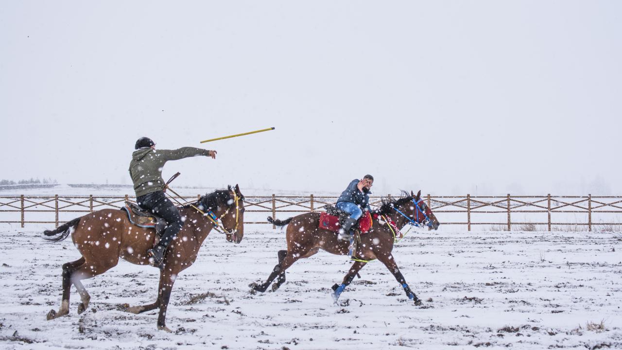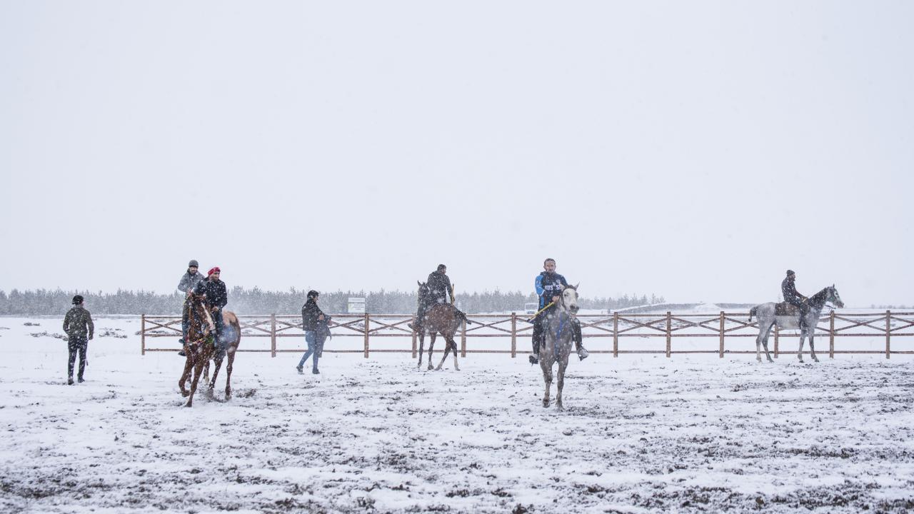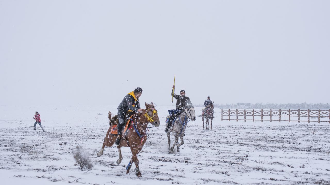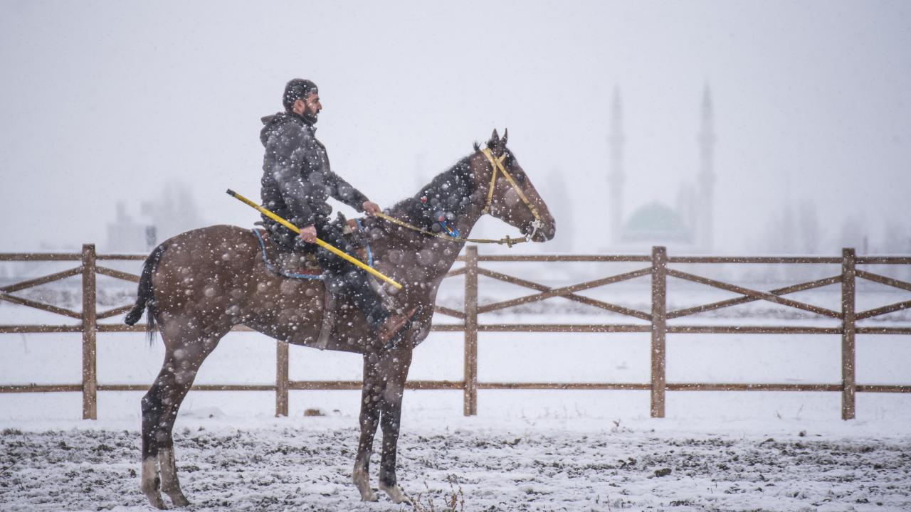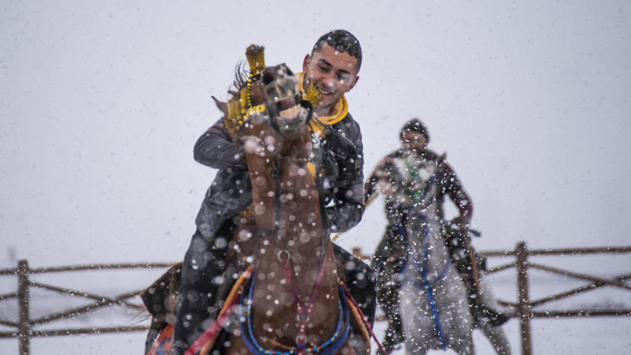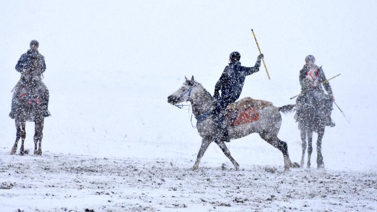 Kars'ta aralıklı yağışlarla etkisini gösteren kar, cirit oynayan köylülerin eğlencesine eğlence kattı. Köylüler kar üstünde at sürmenin tadını çıkardı.