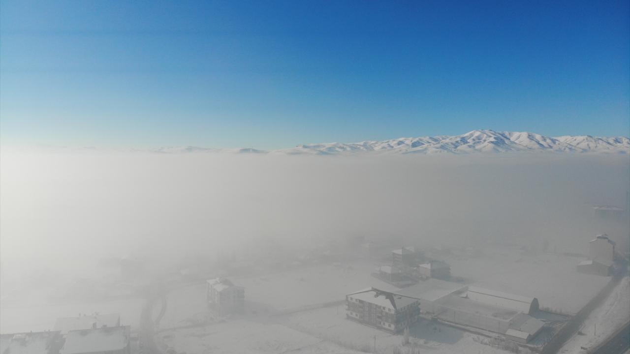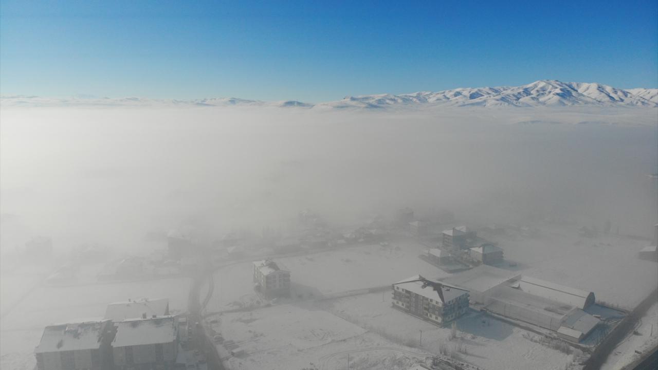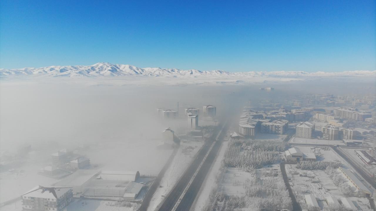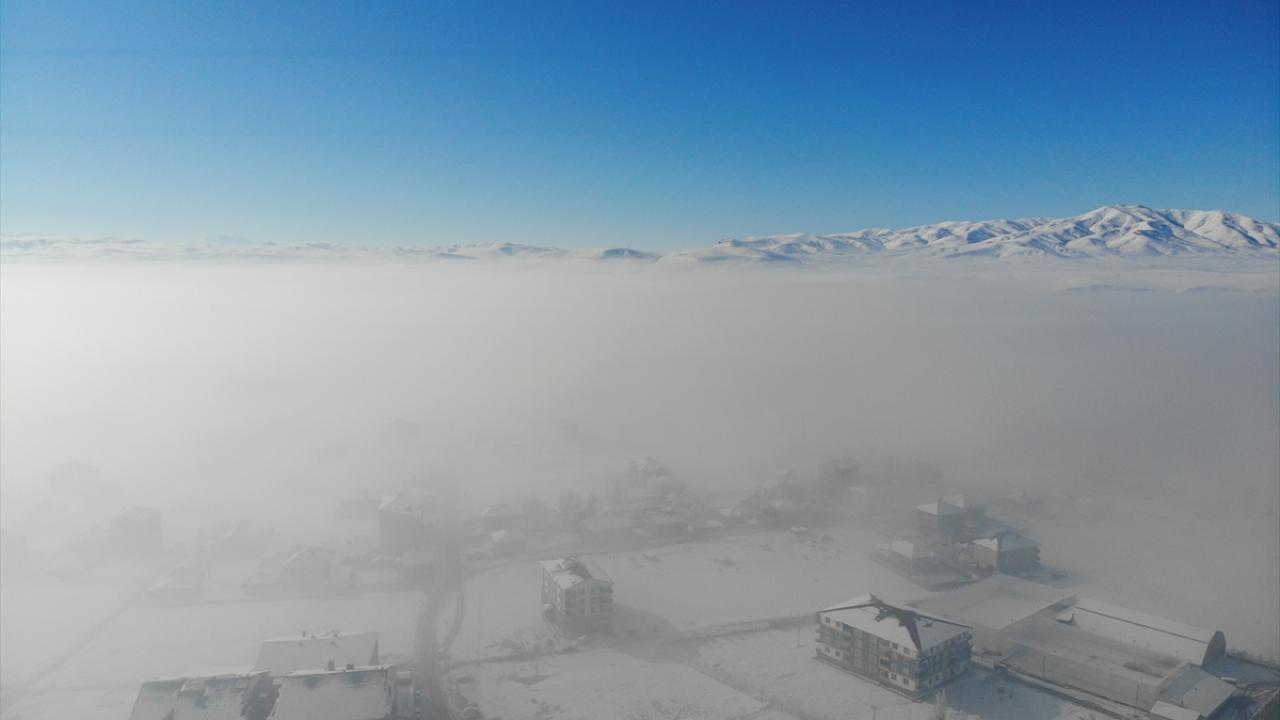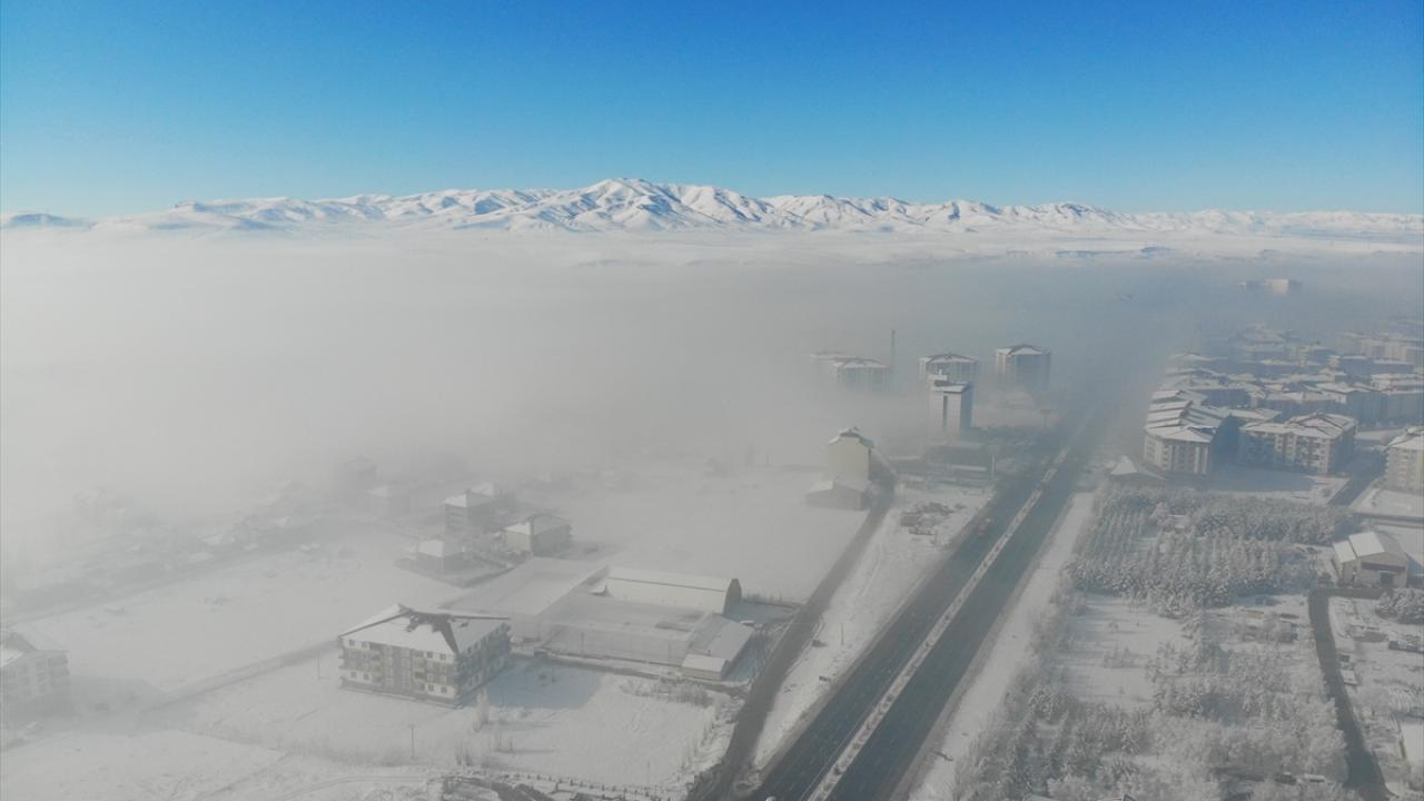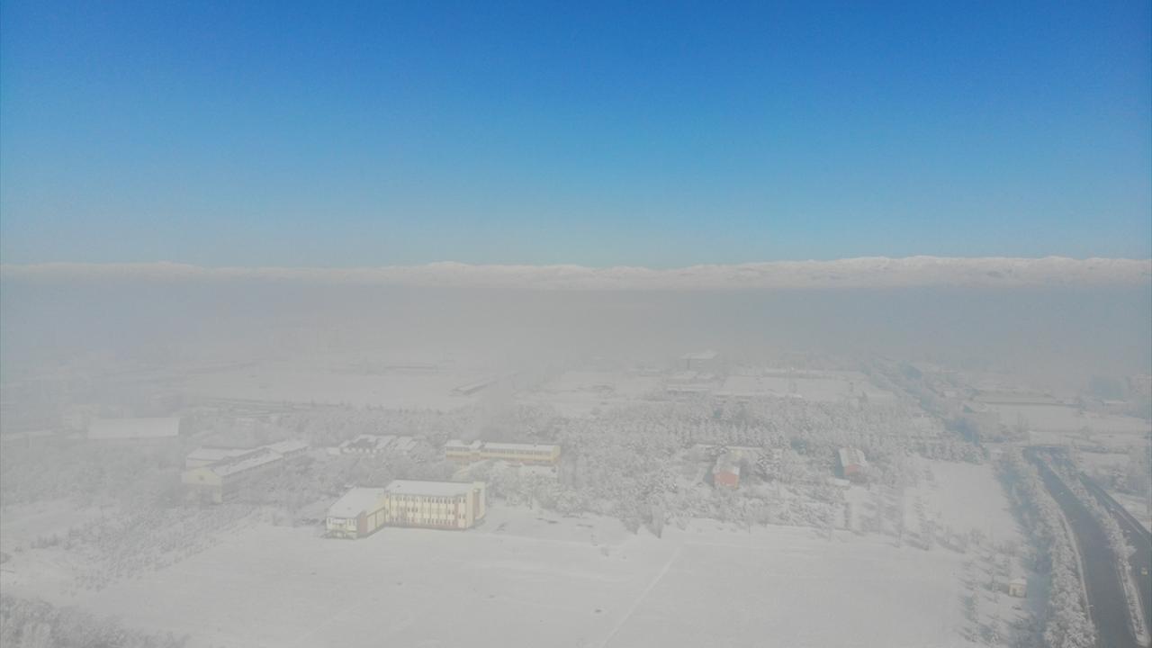 Büyük kısmı sis altında kalan şehrin sis ve karla bütünleşen manzarası dronla görüntülendi.