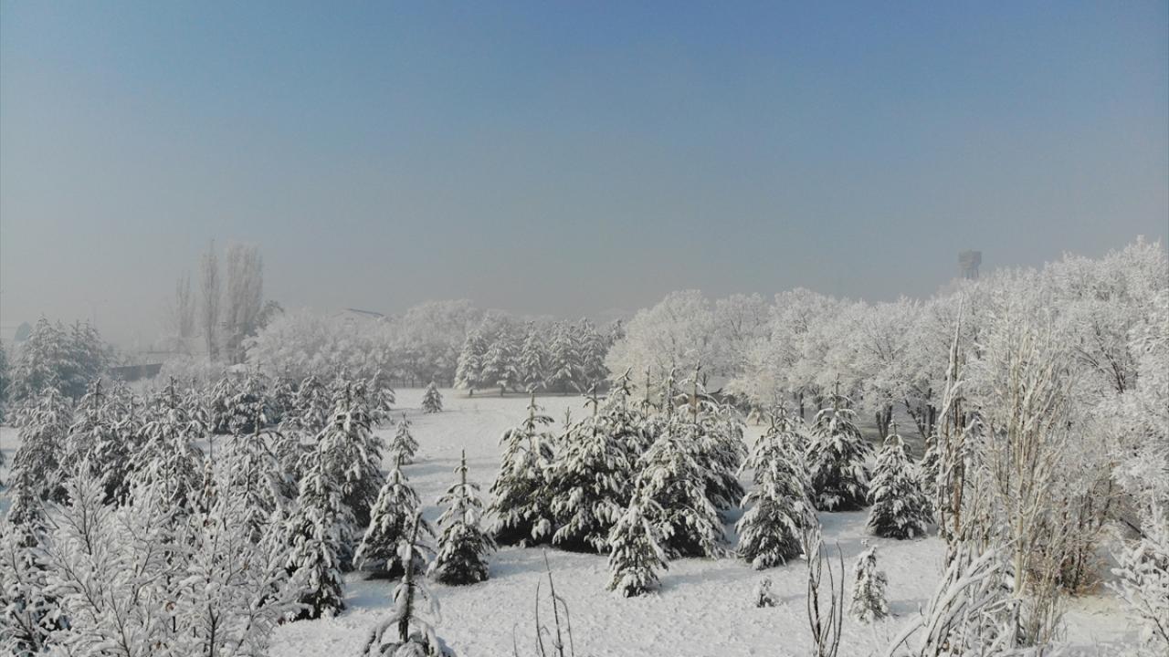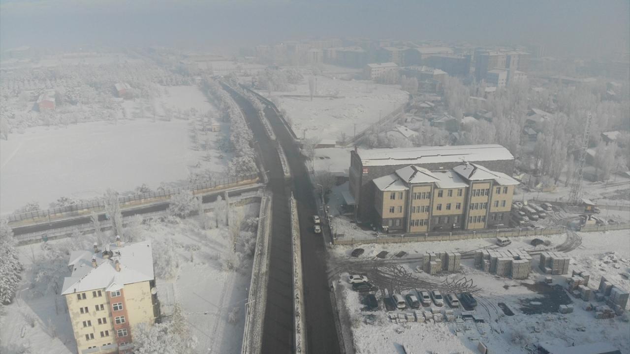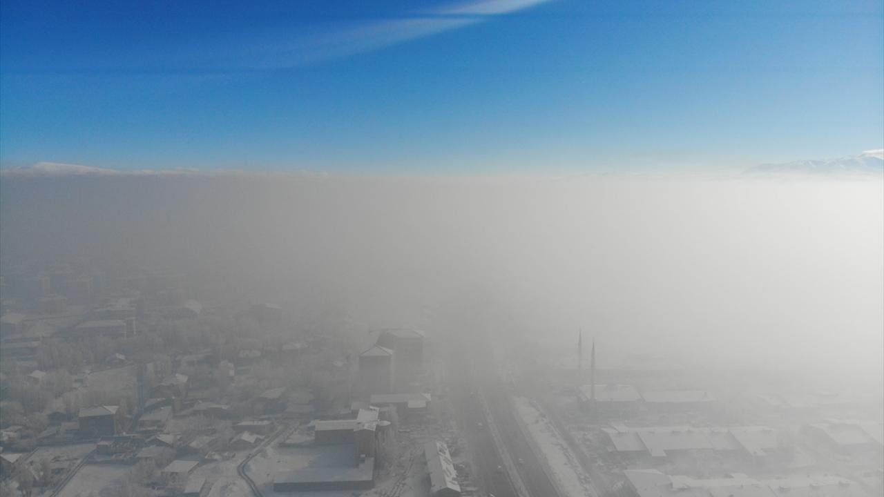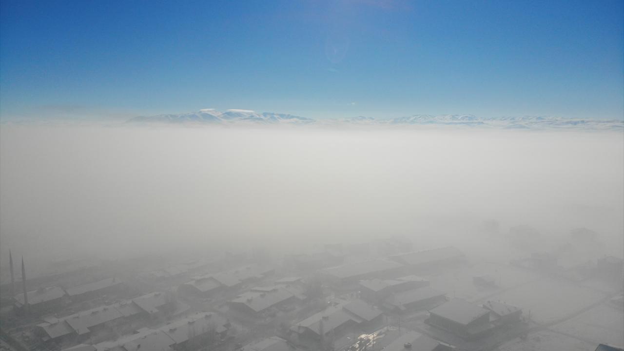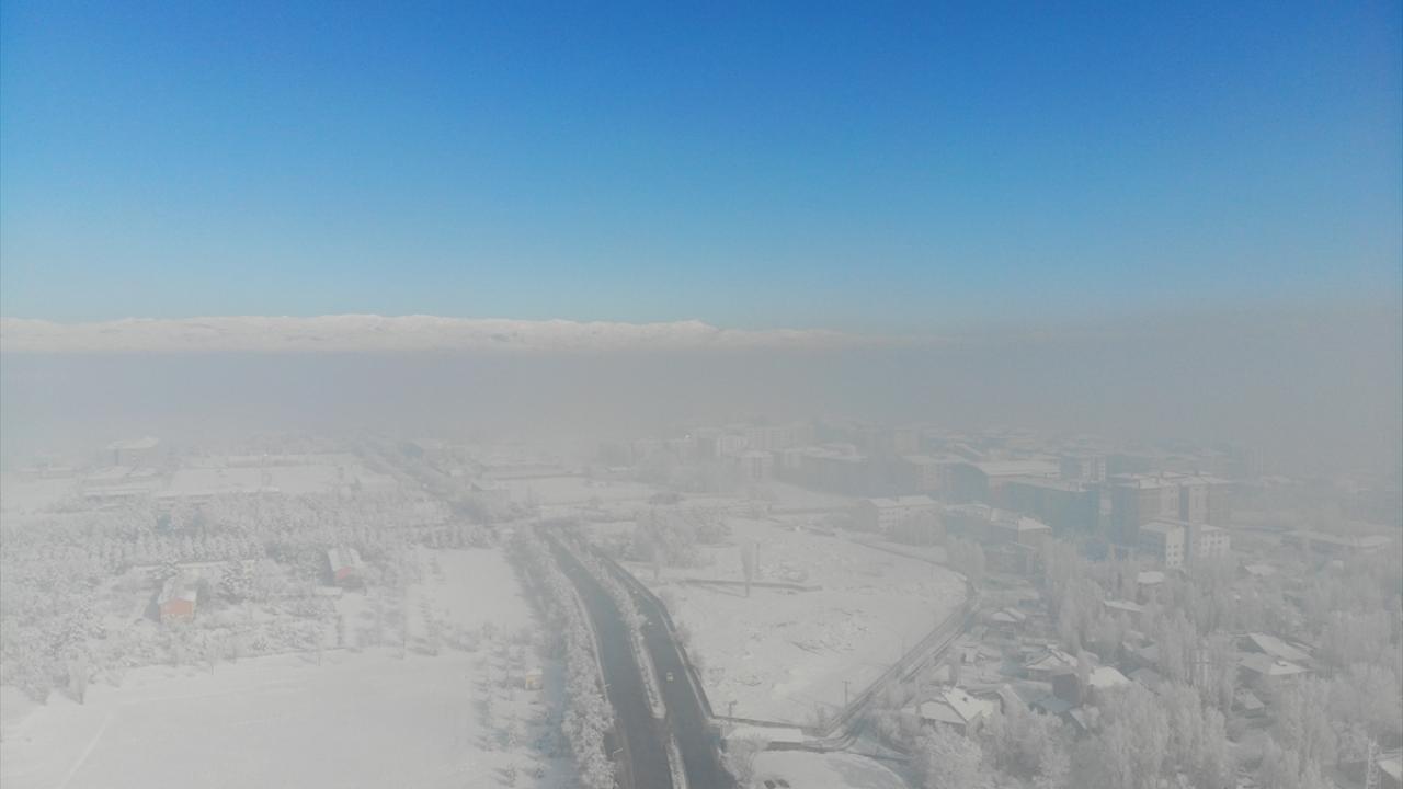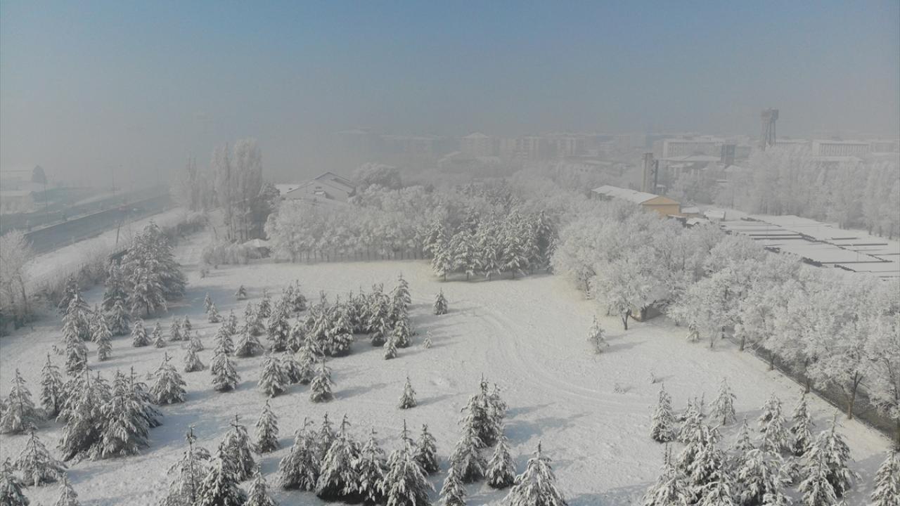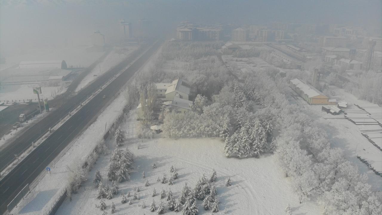 Büyük kısmı sis altında kalan şehrin sis ve karla bütünleşen manzarası dronla görüntülendi.