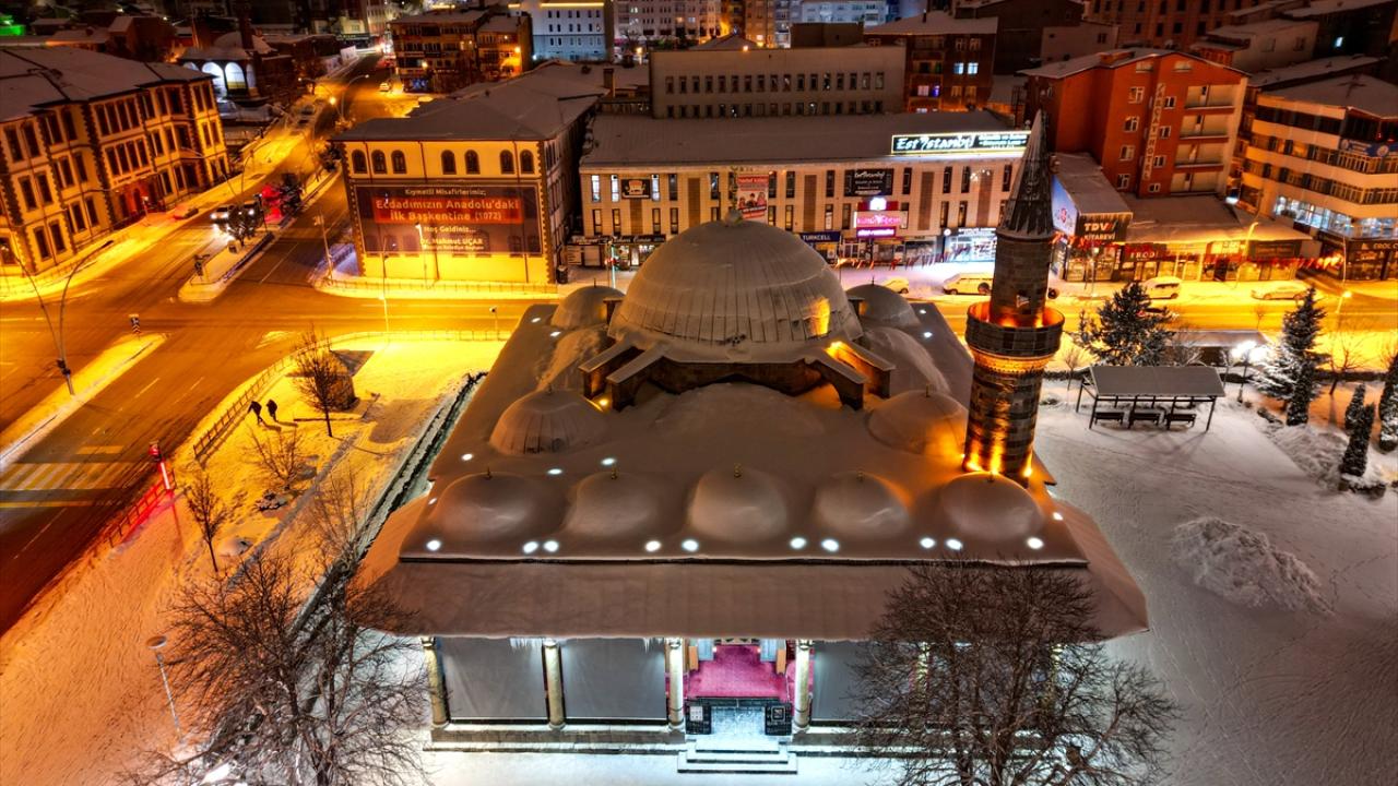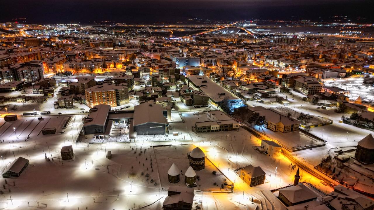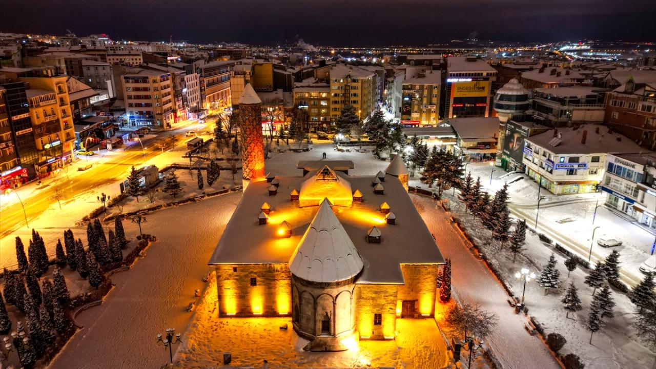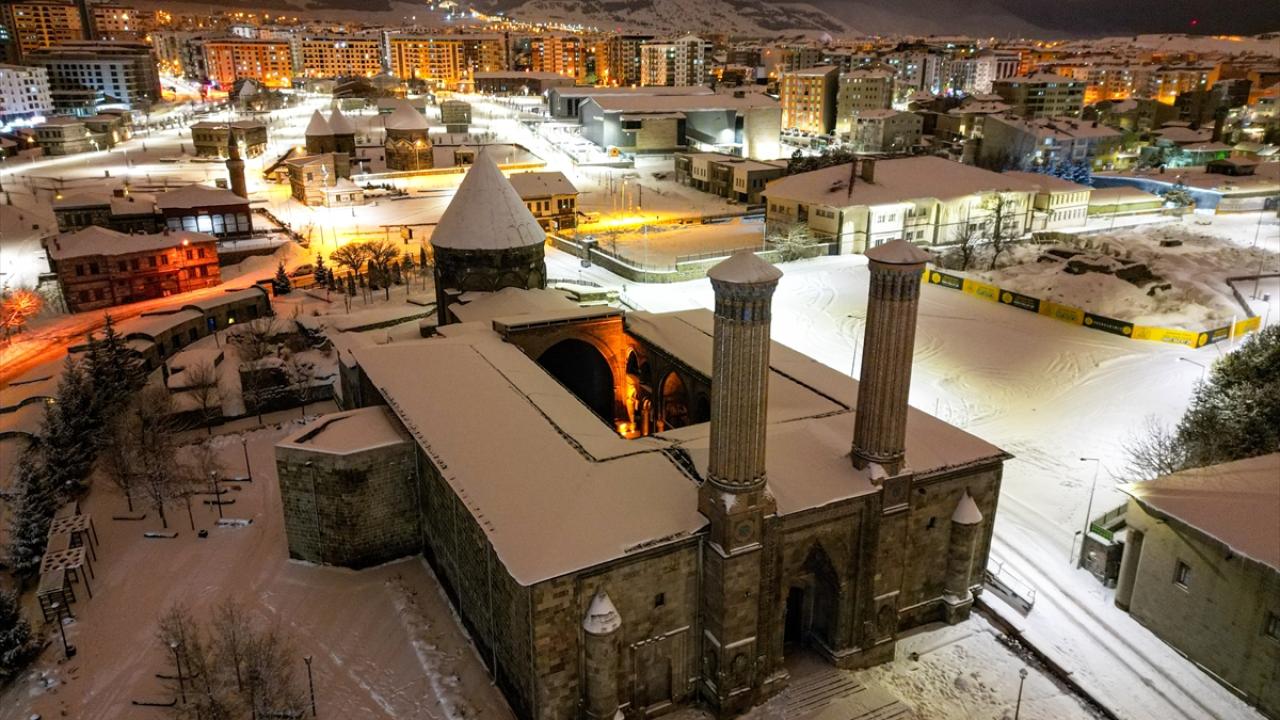 Erzurum'da etkili olan kar yağışının ardından beyaza bürünen kent merkezindeki tarihi yapılar, dronla görüntülendi.