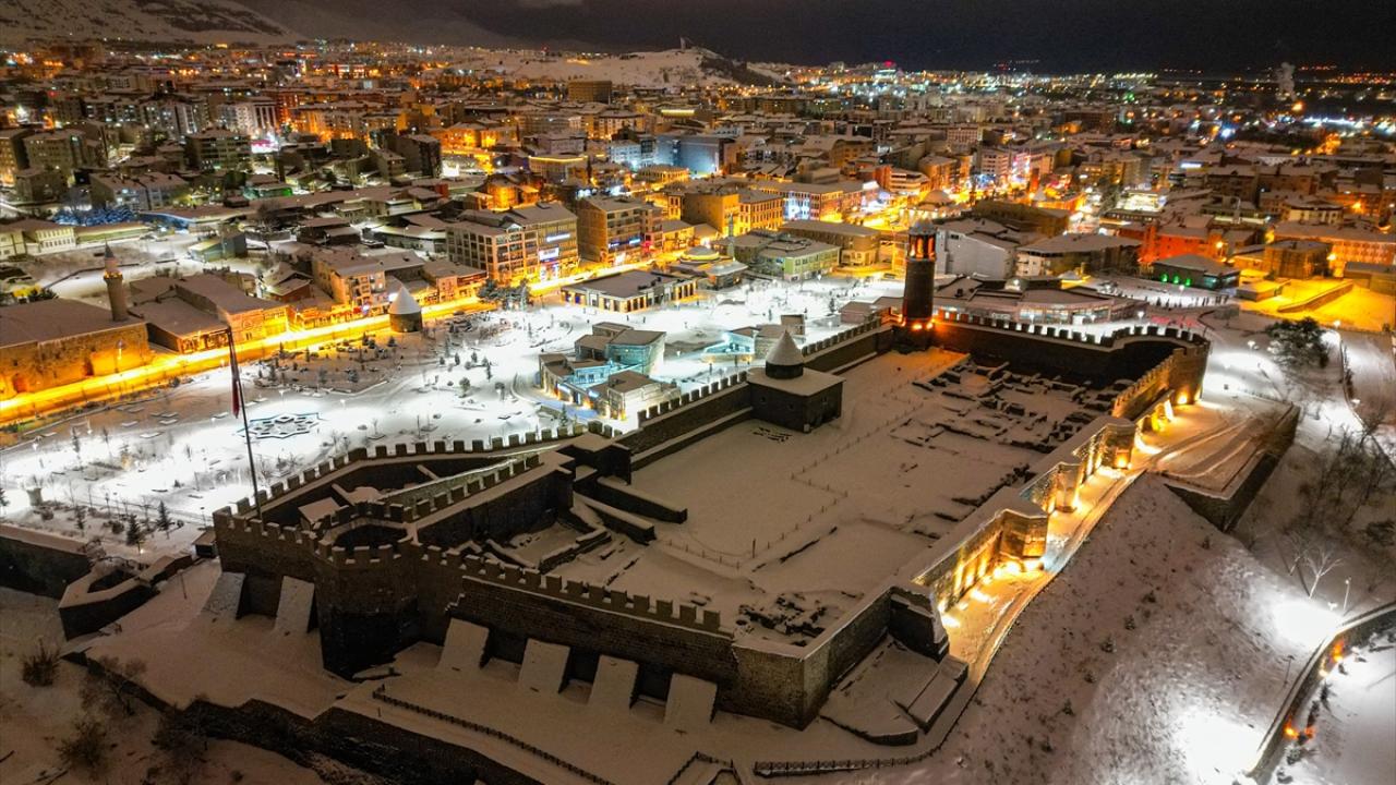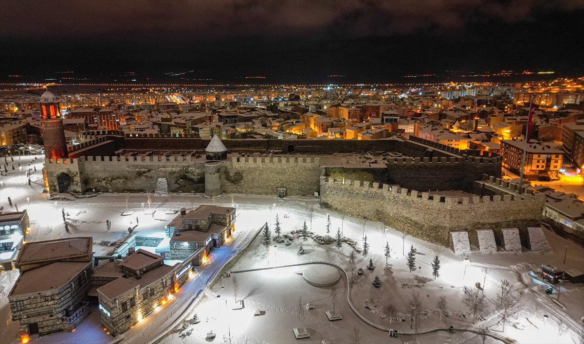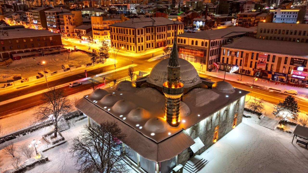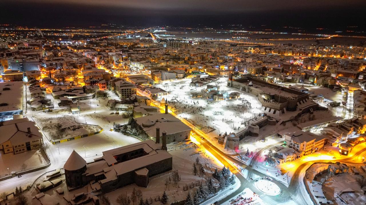 Erzurum'da etkili olan kar yağışının ardından beyaza bürünen kent merkezindeki tarihi yapılar, dronla görüntülendi.
