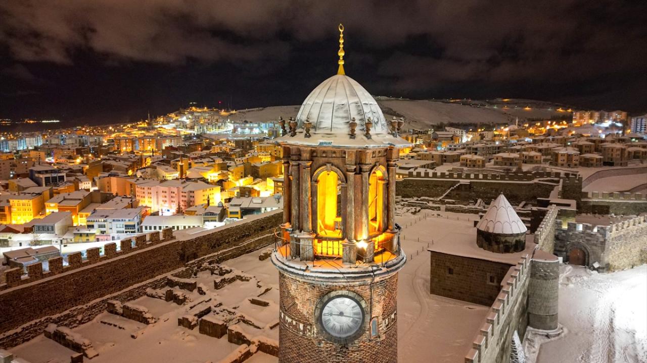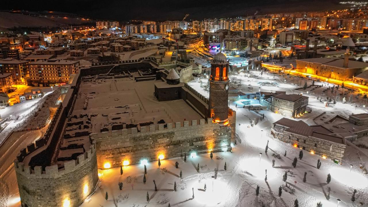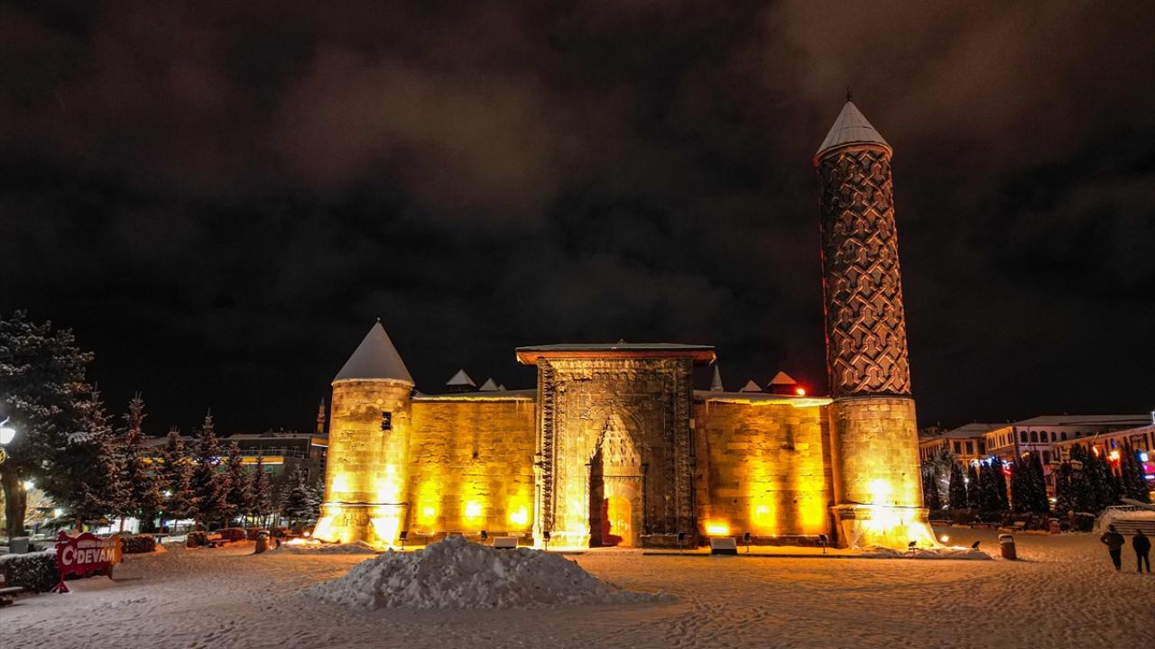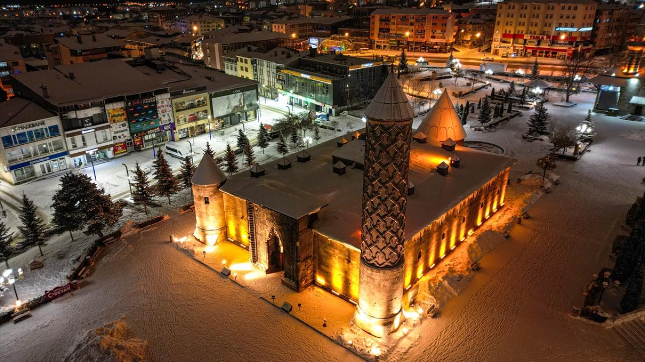 Tarihi Çifte Minareli Medrese, Erzurum Kalesi ve Yakutiye Medresesi de beyaz örtüyle kaplandı.