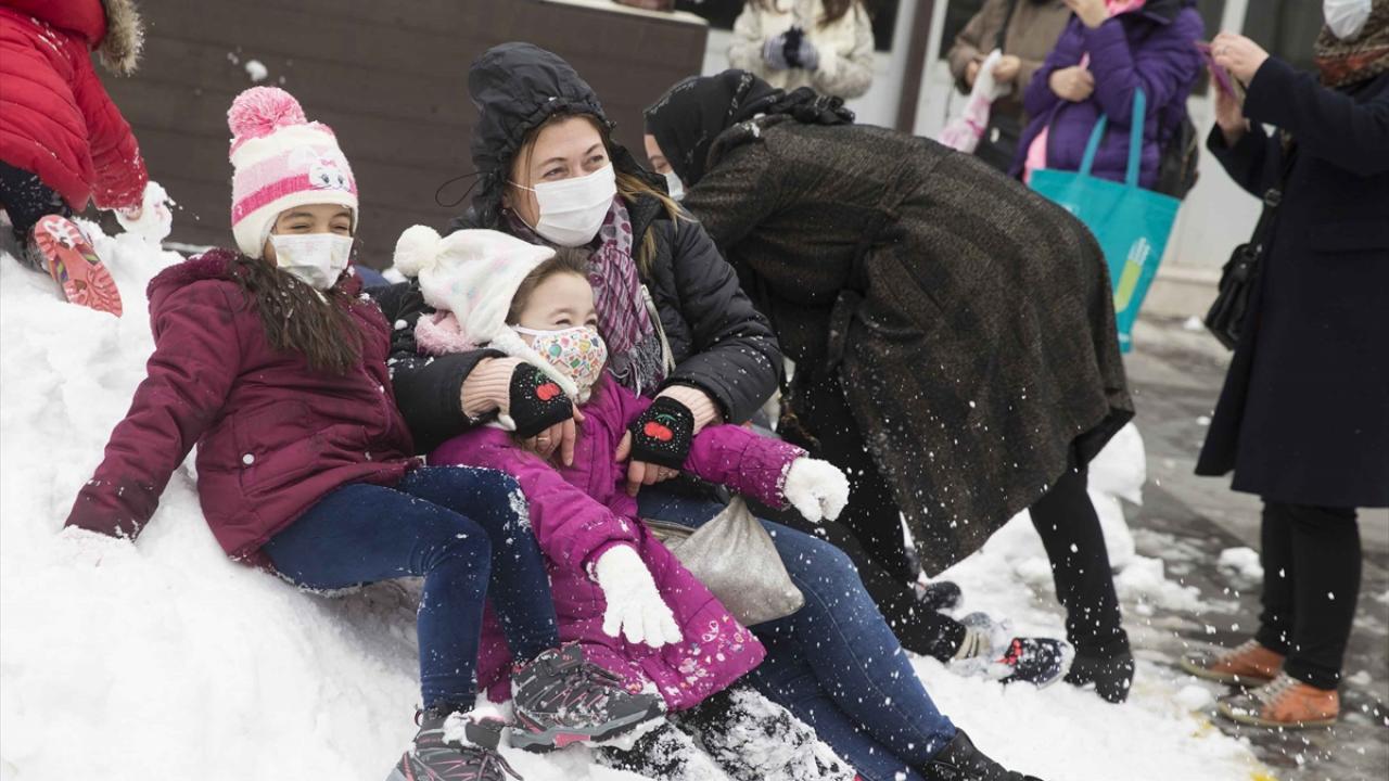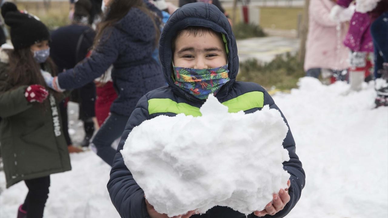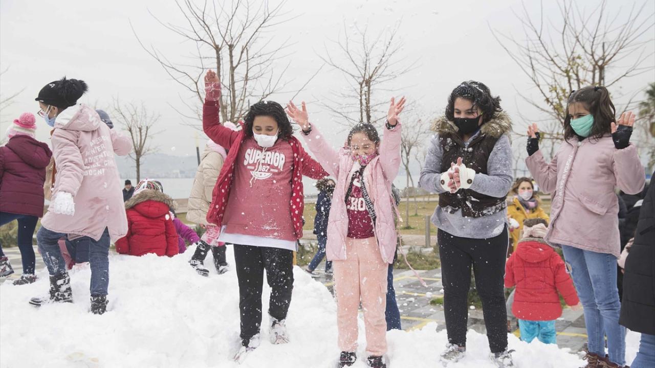 Kısıtlama tedbirlerinin izin verdiği saatlerde sokağa çıkan çocuklar, karla oynamanın keyfini yaşadı.